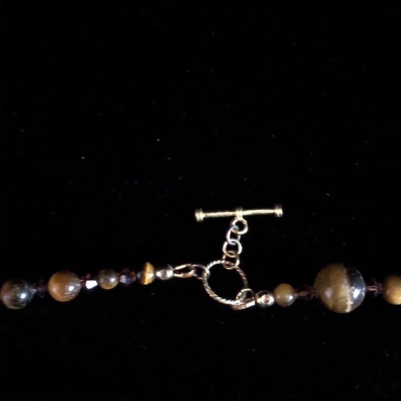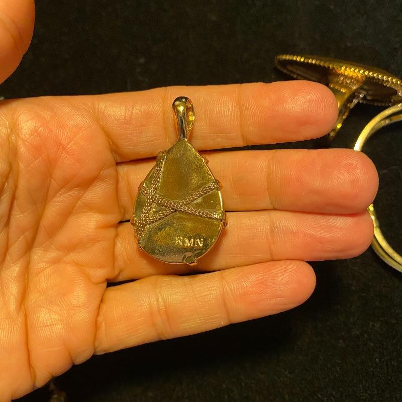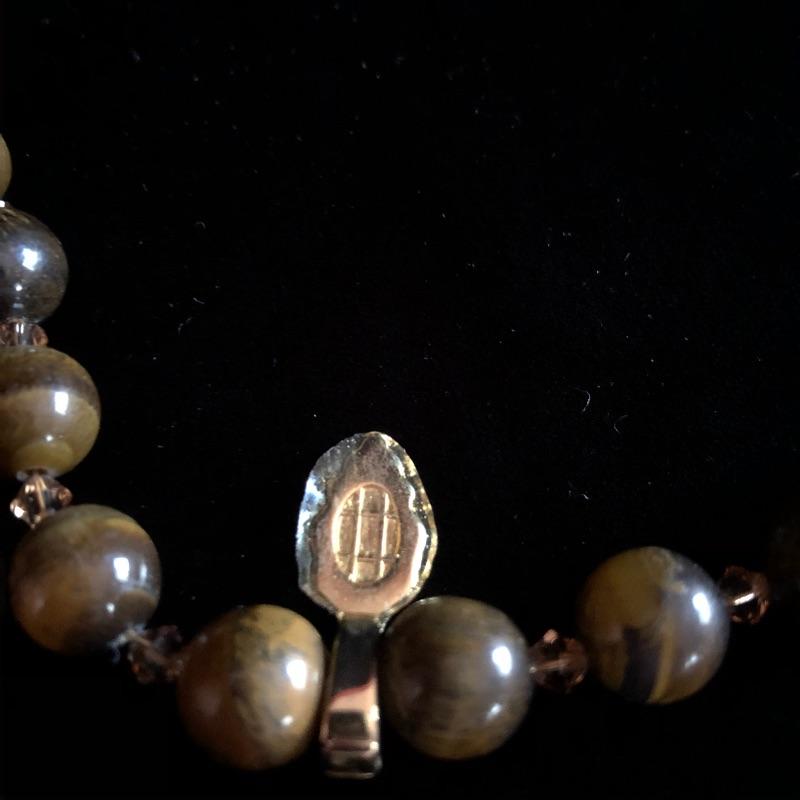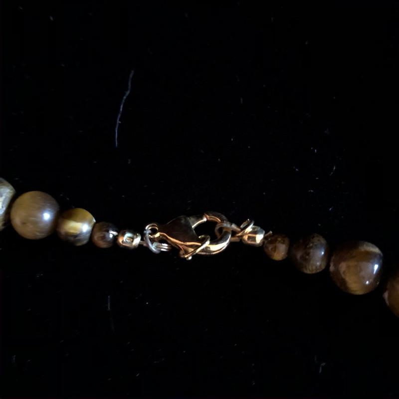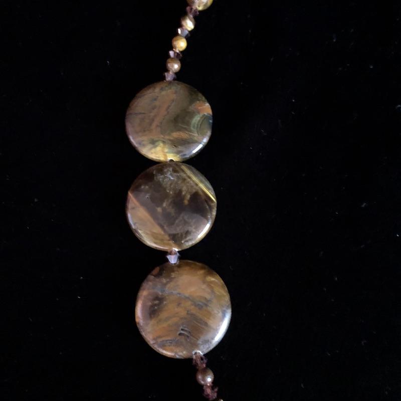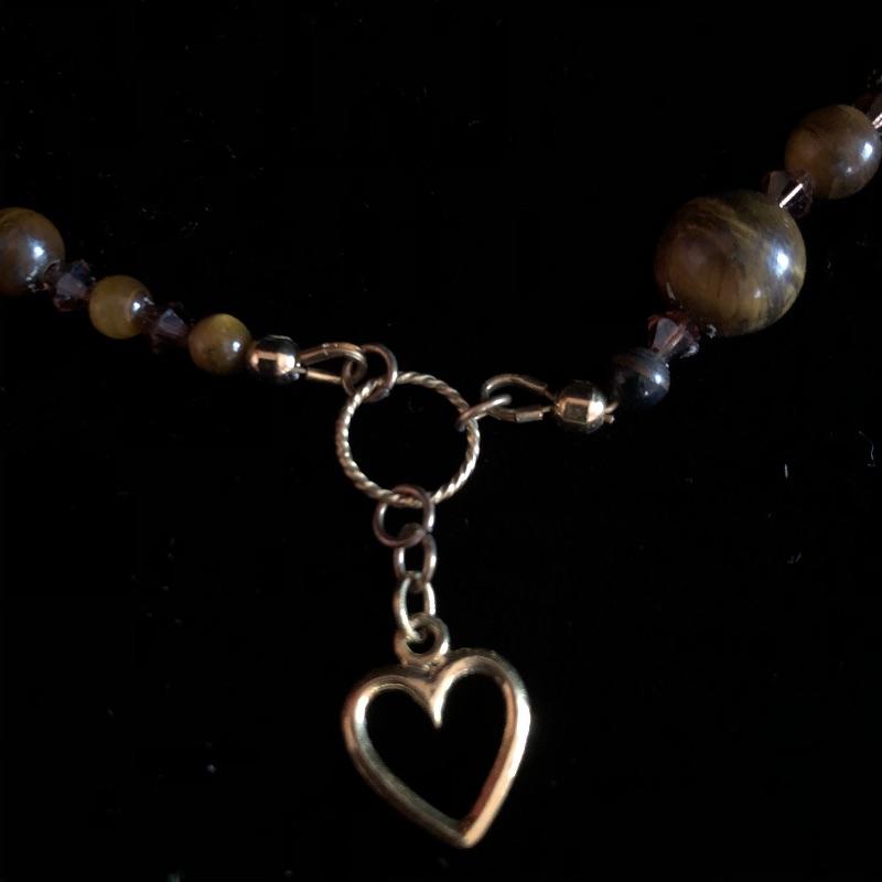 This lot contains many pieces of brown-tinted, gold-accented agate jewelry. It contains three pairs of earrings, two bracelets, a pendant, a ring, three necklaces and one stone. The largest necklace (heart pendant) measures 20.5” stretched out. Shipping available.