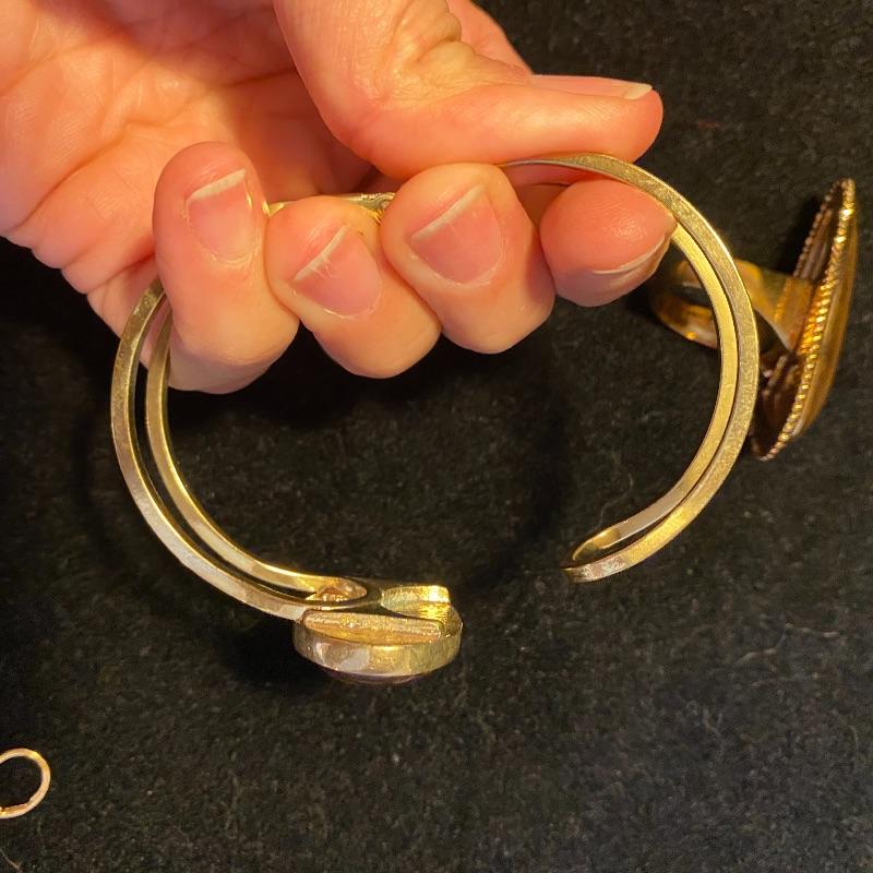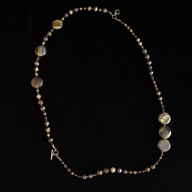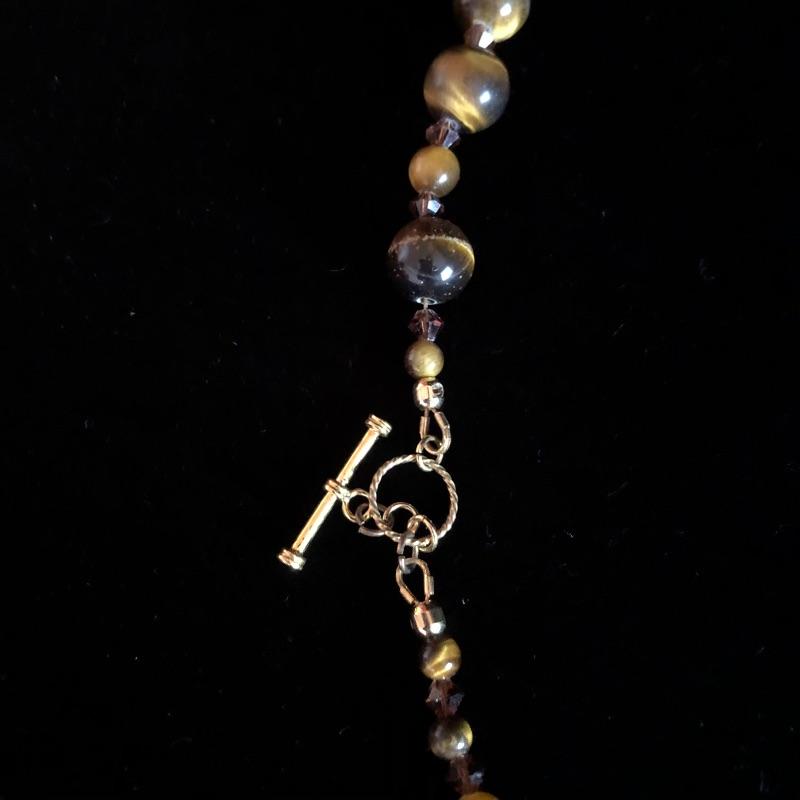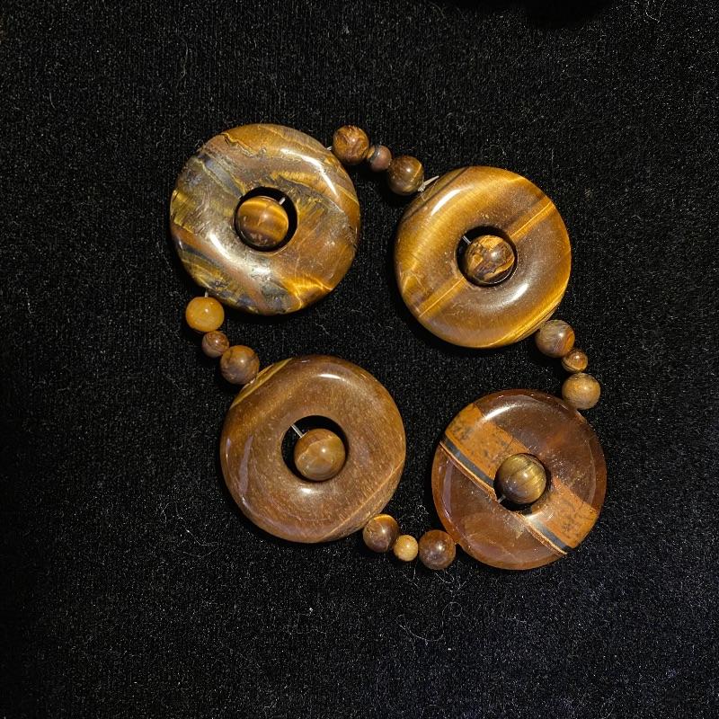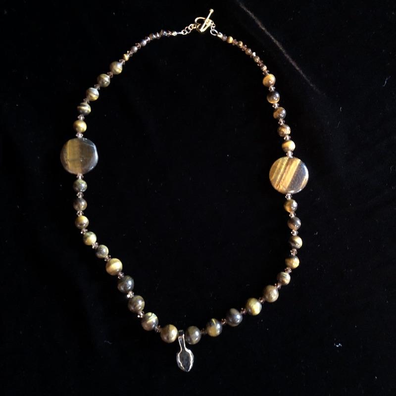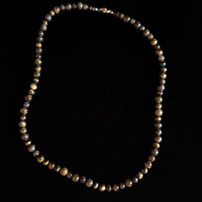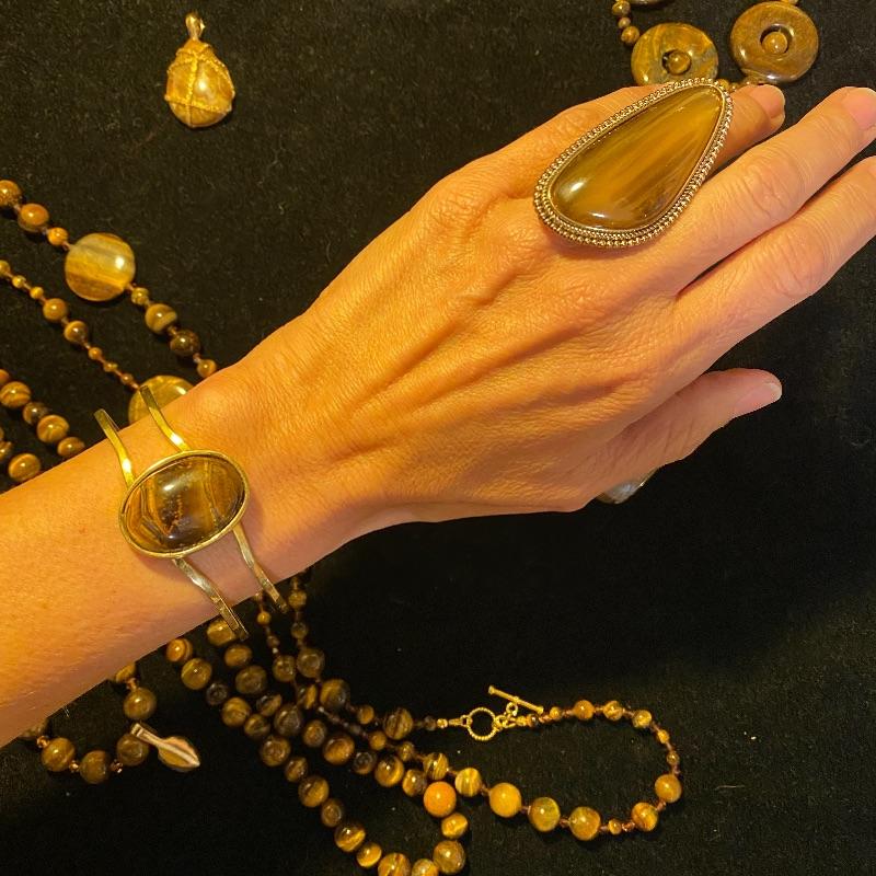 This lot contains many pieces of brown-tinted, gold-accented agate jewelry. It contains three pairs of earrings, two bracelets, a pendant, a ring, three necklaces and one stone. The largest necklace (heart pendant) measures 20.5” stretched out. Shipping available.