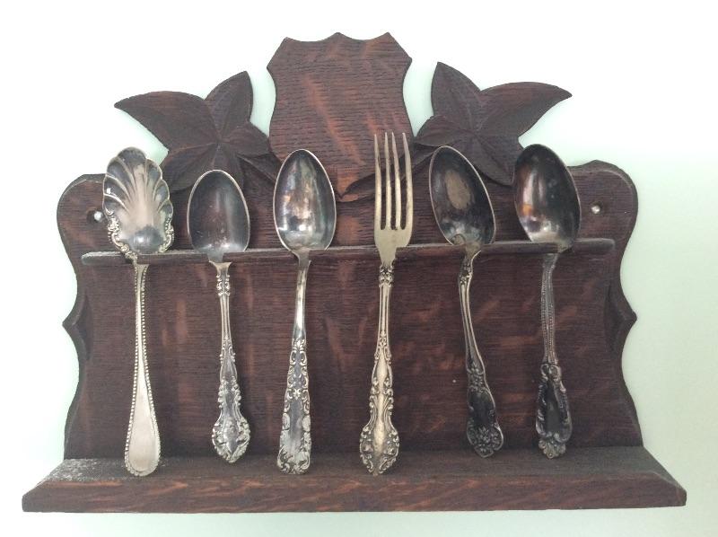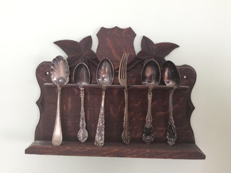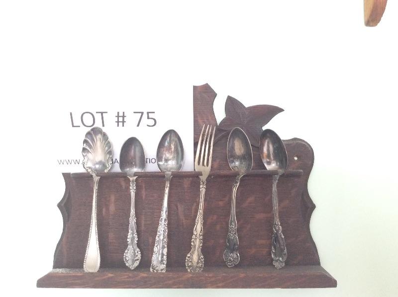 Lot # 75 Antique Oak Spoon Rack with Silver plate Spoons