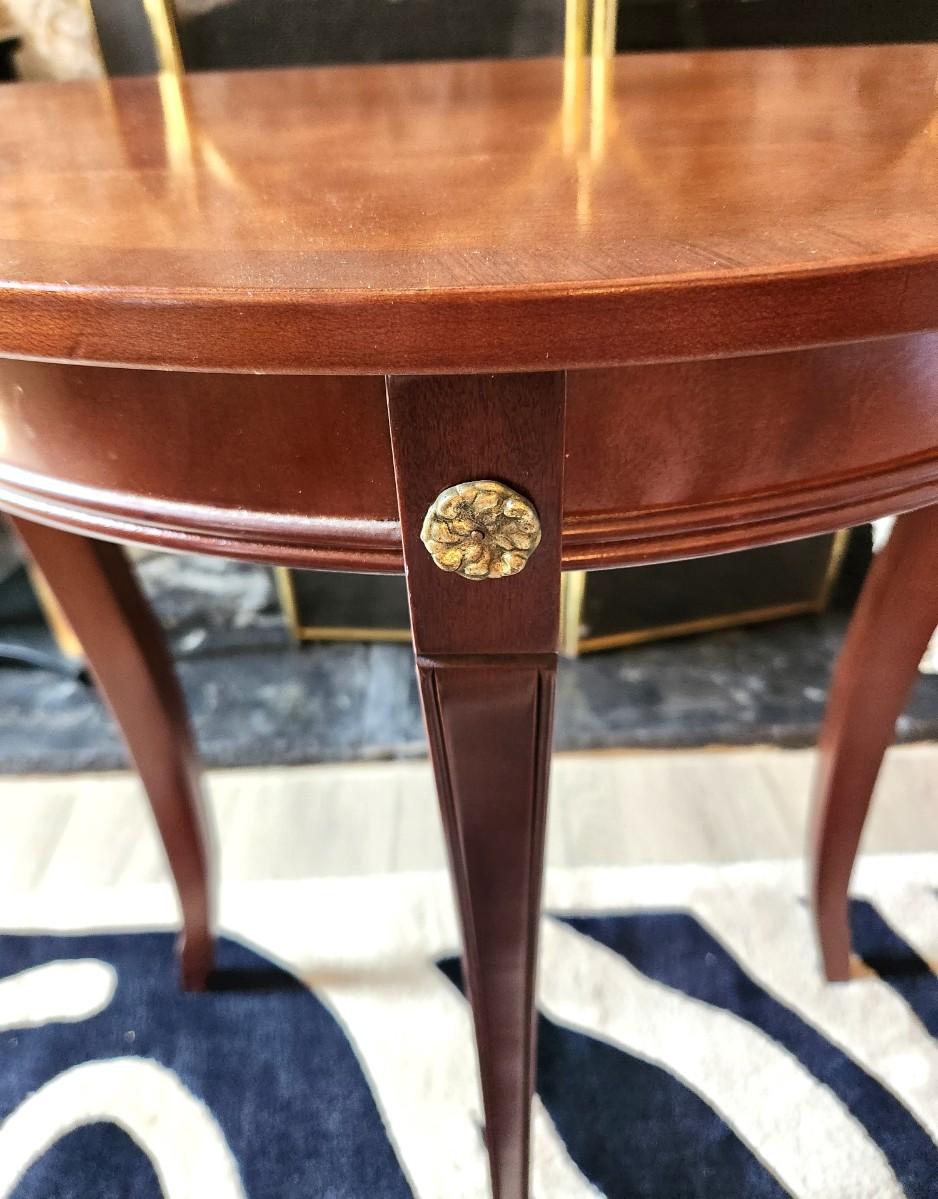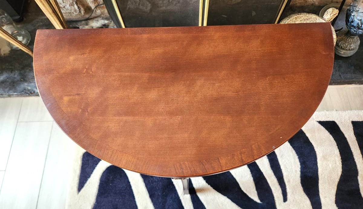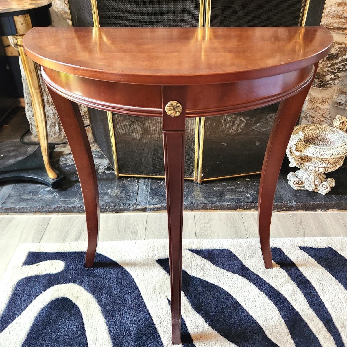 Pretty Bombay Company (marked) demi-lune table, 3 legs, 27.5" tall, 2 ft across. Good Gently used condition. A classic design.