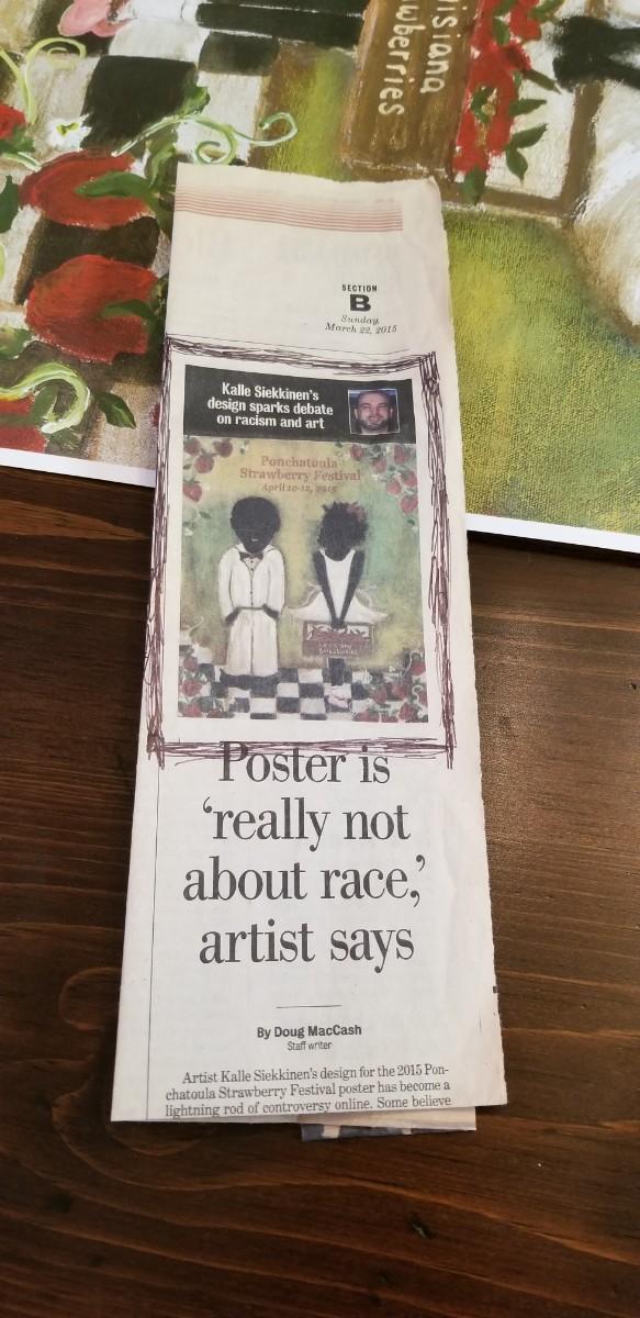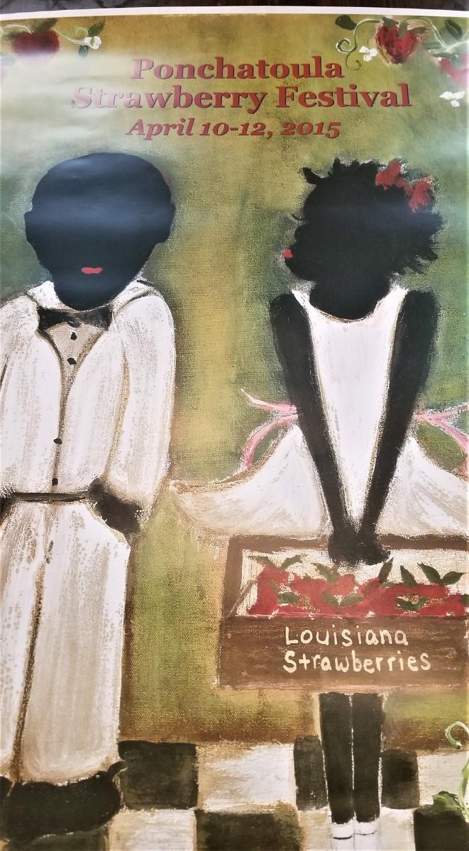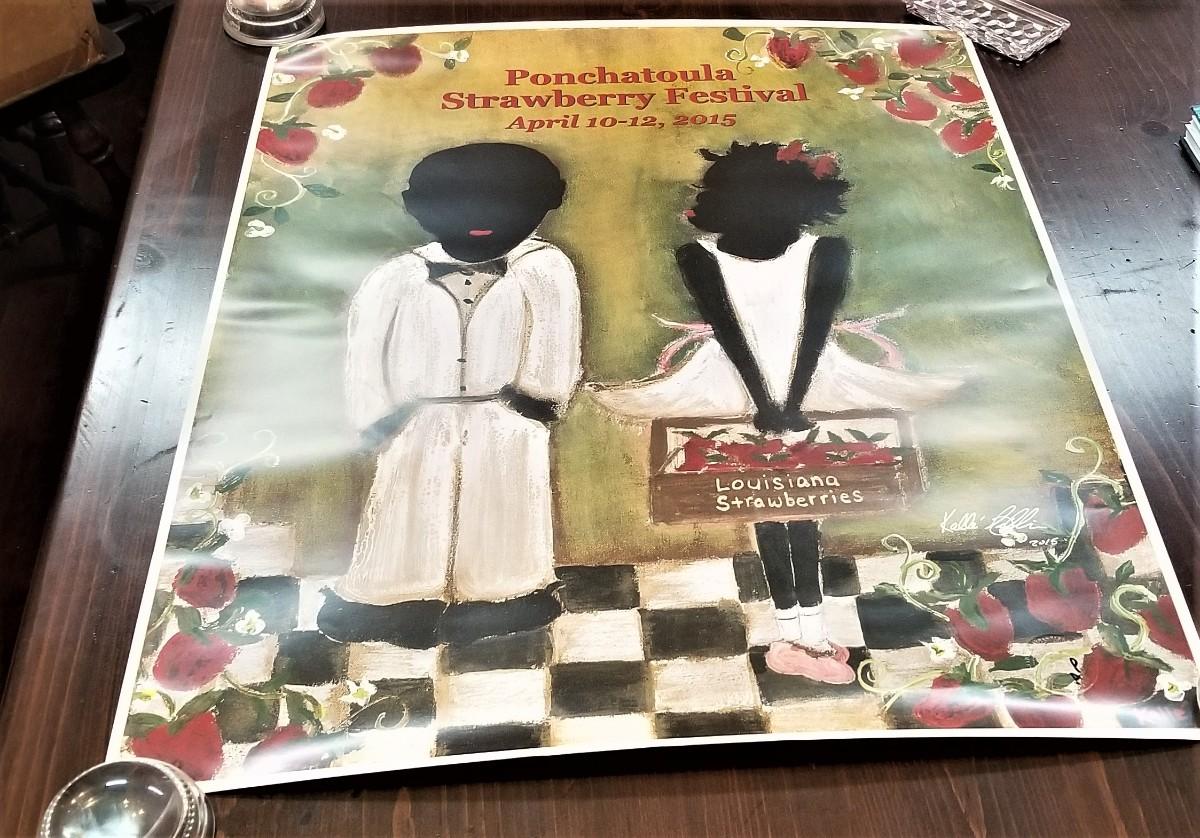 A ruckus erupted in 2015 over this official Ponchatoula Strawberry Festival poster that was done in the style of William "Bill" Hemmerling, an artist who died in 2009. His protege, Kalle Seikkinen (who happened to be white) designed this piece of art as an homage for Hemmerling for the festival and all hell broke loose. Needless to say, it was a sell out. Unframed, good condition. Measures 28" x 22". SIGNED. A newspaper clipping about the incident is included.