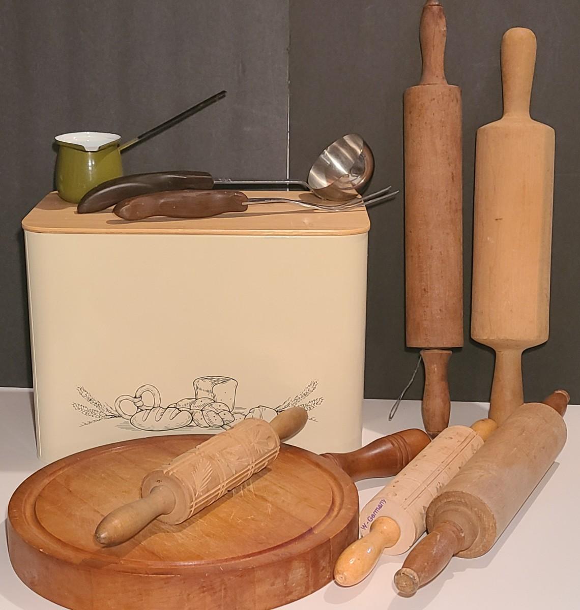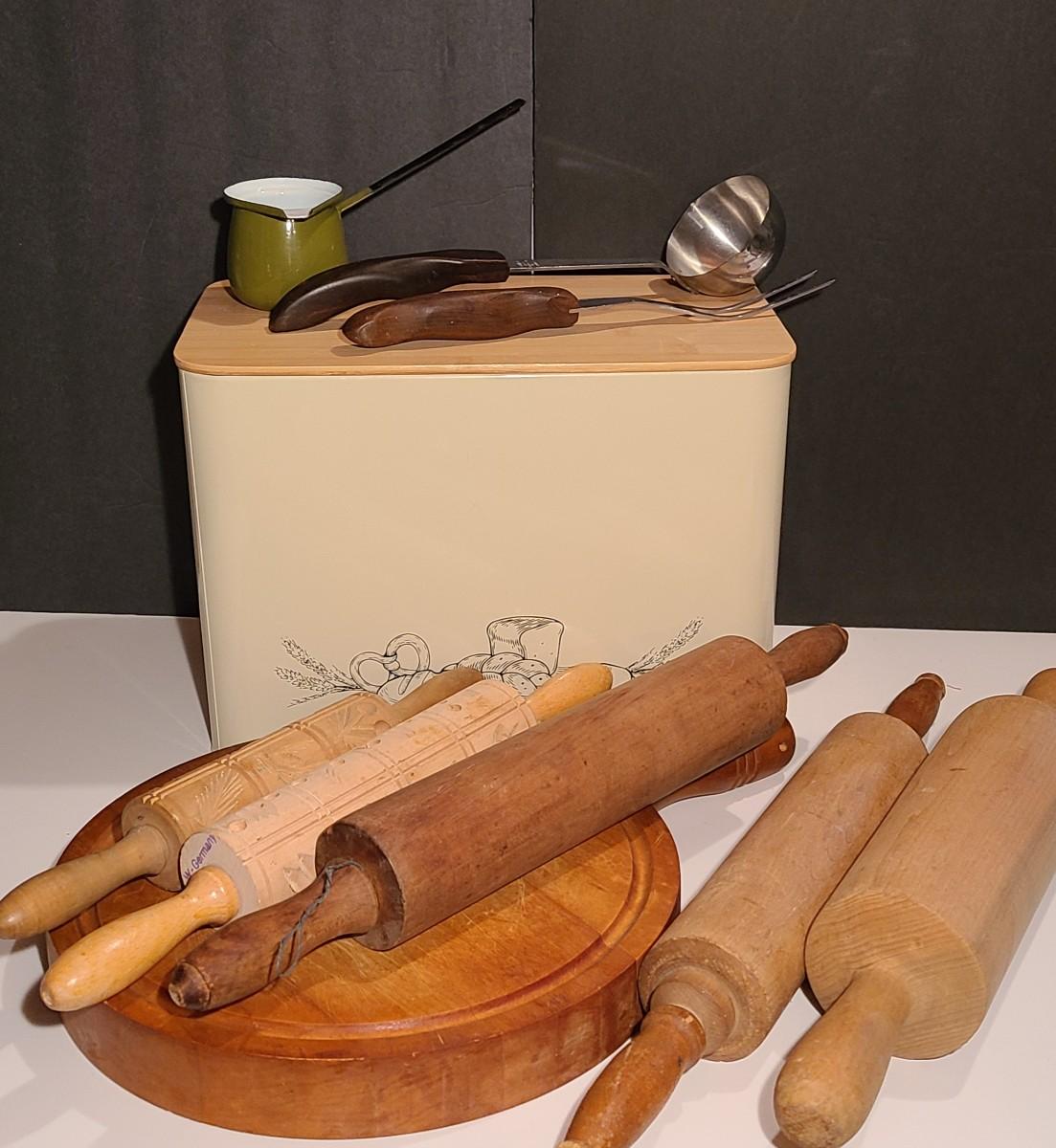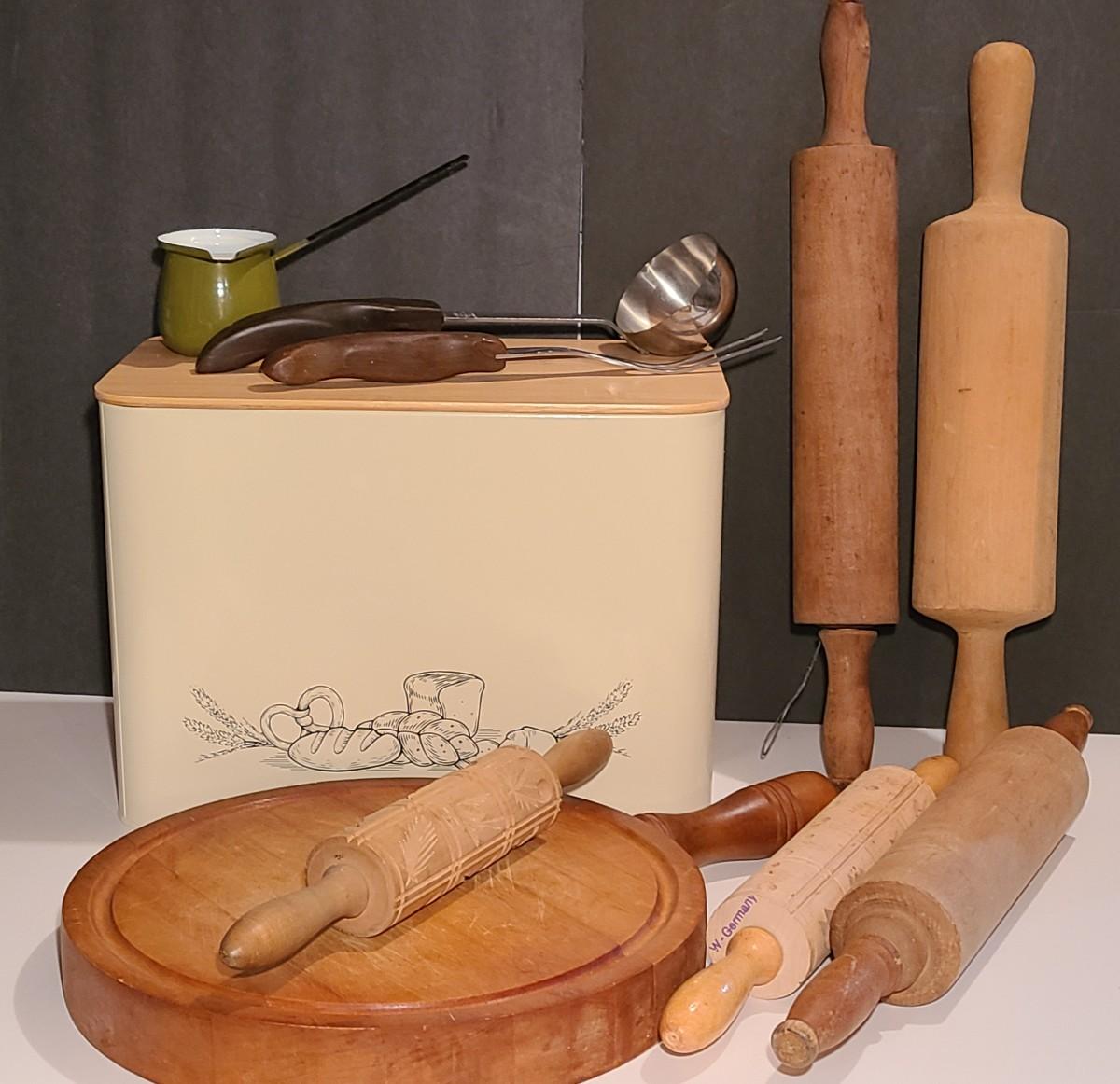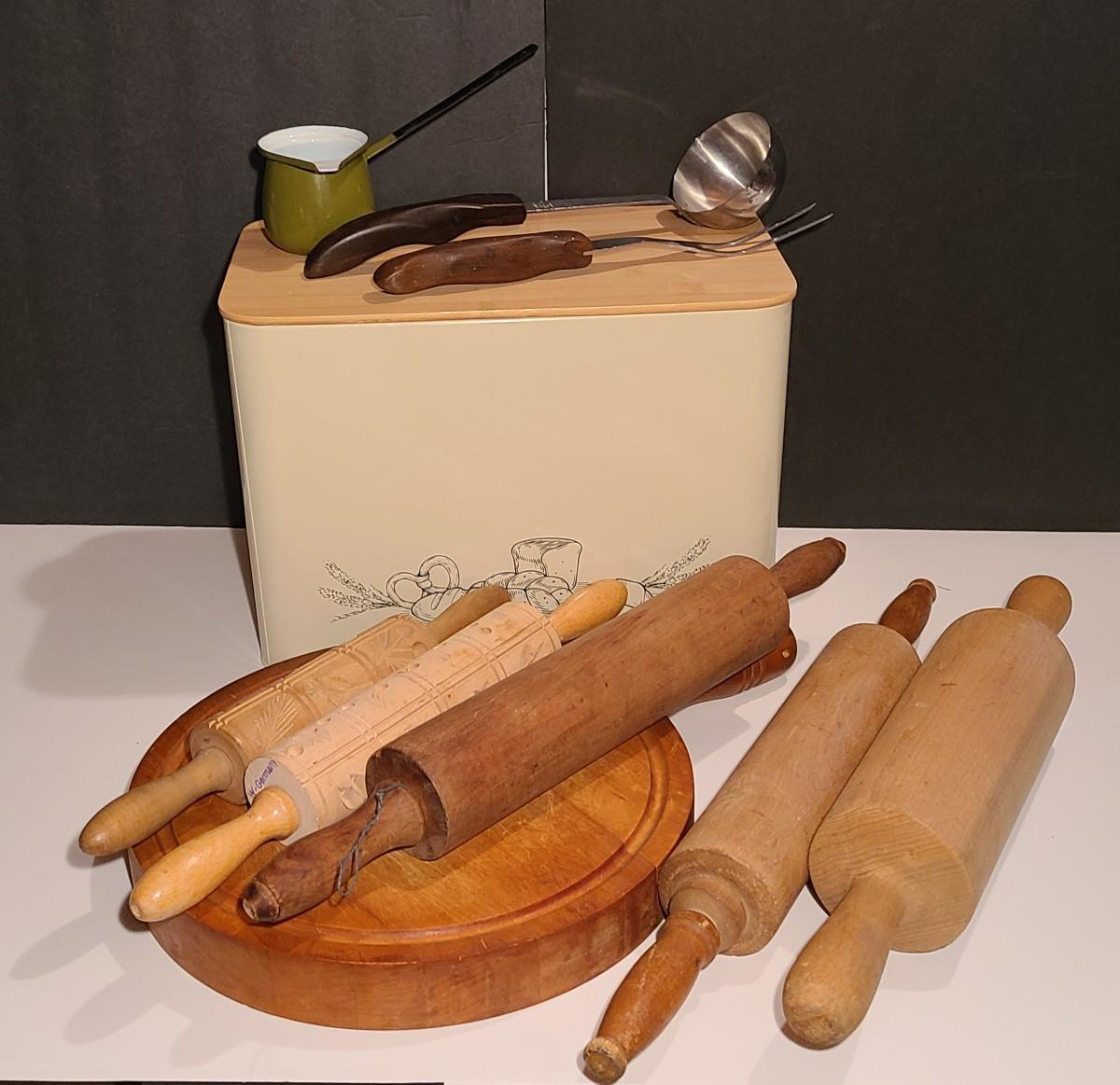 Lot 75: Cooler Kitchen Breadbox, Rolling Pins, Butter Press...