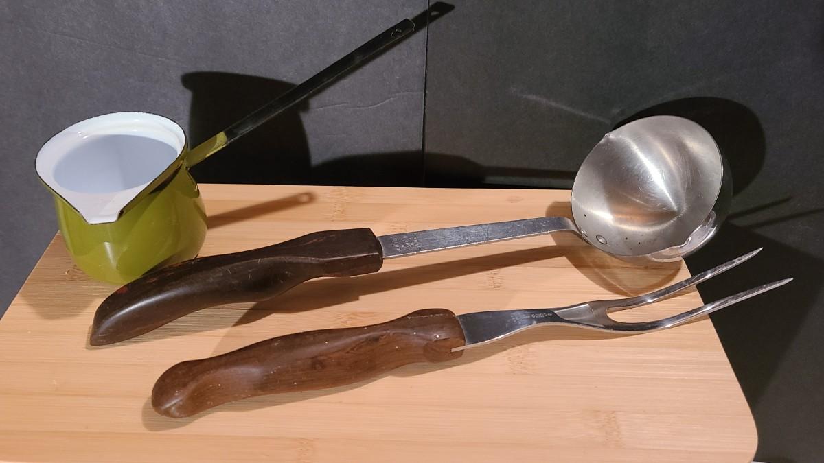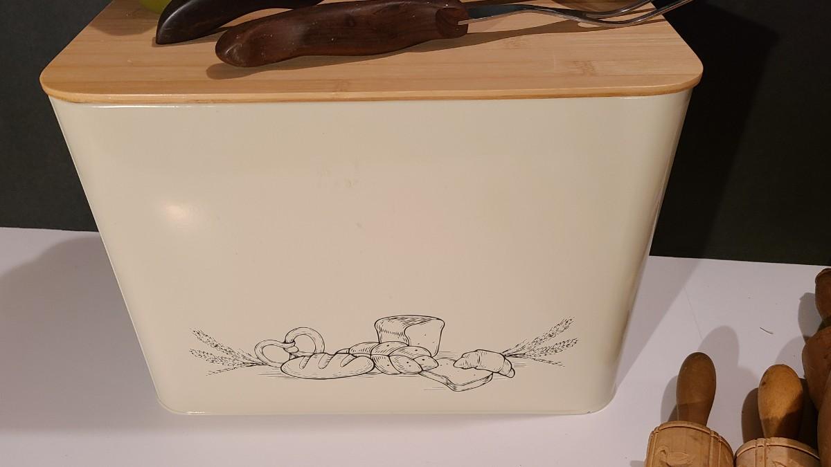 Cooler Kitchen Bread Box with bamboo top, W. Germany butter/cookie press rolling pins, antique rolling pins, Cutco ladle and more. Please see all pictures for content of the lot, condition of the lot, and measurements if taken. Pictures are the best representation of the items listed and items are untested unless indicated in description. Thank you for looking and have fun bidding!
