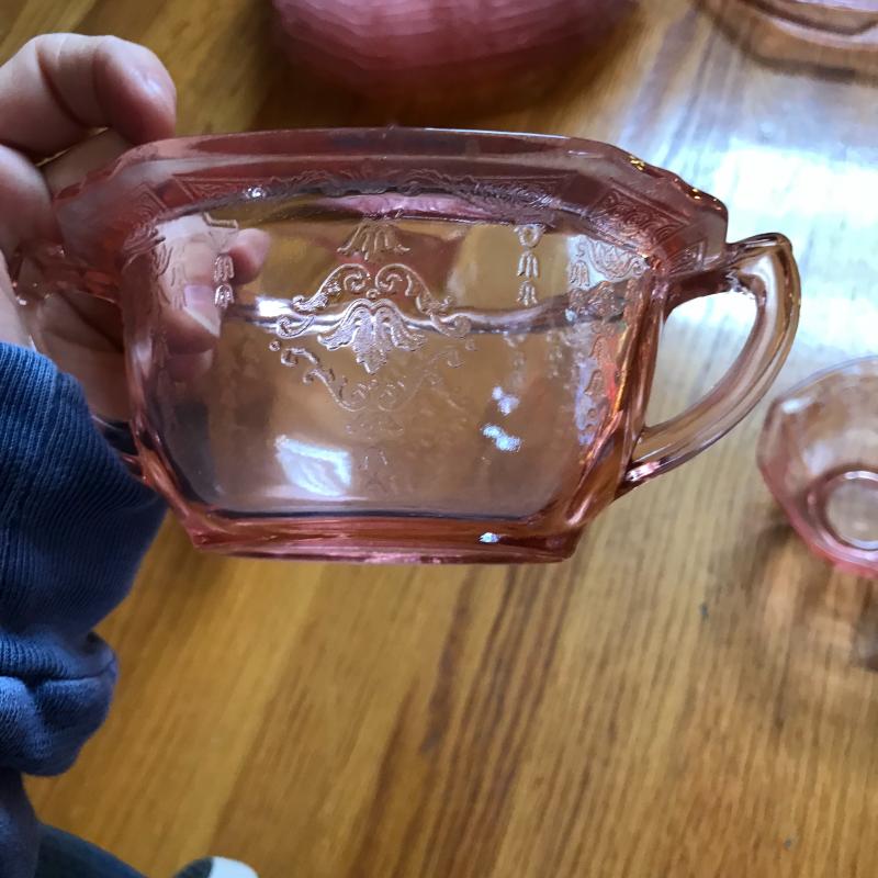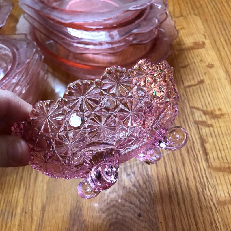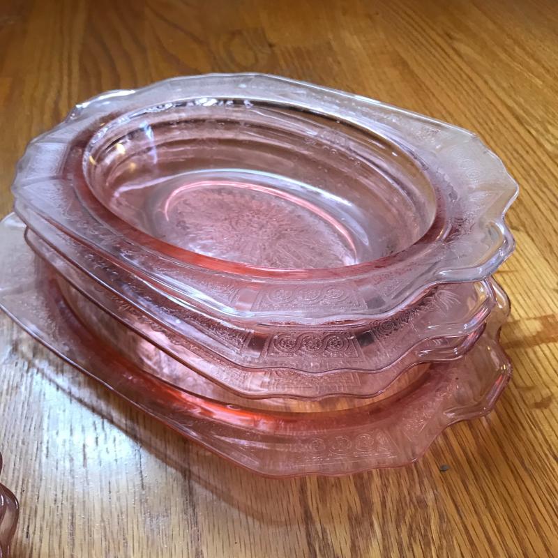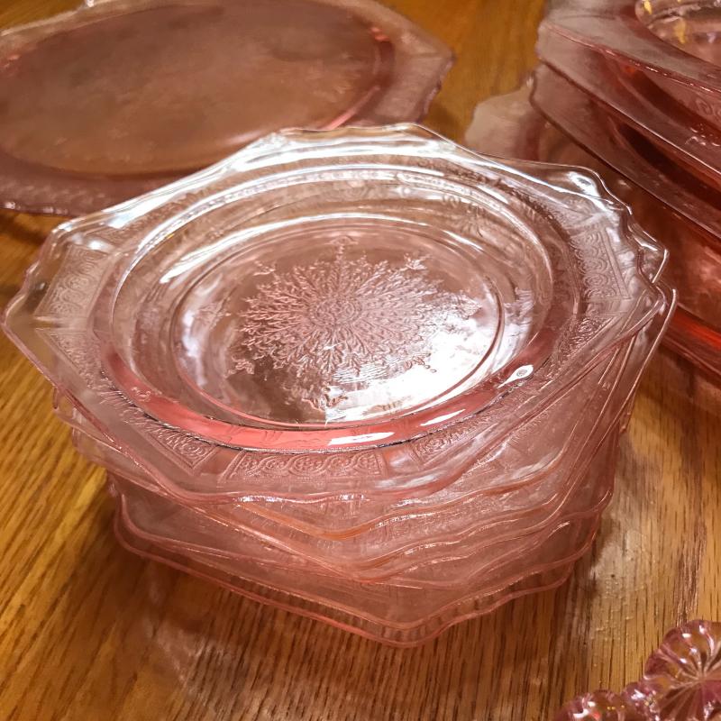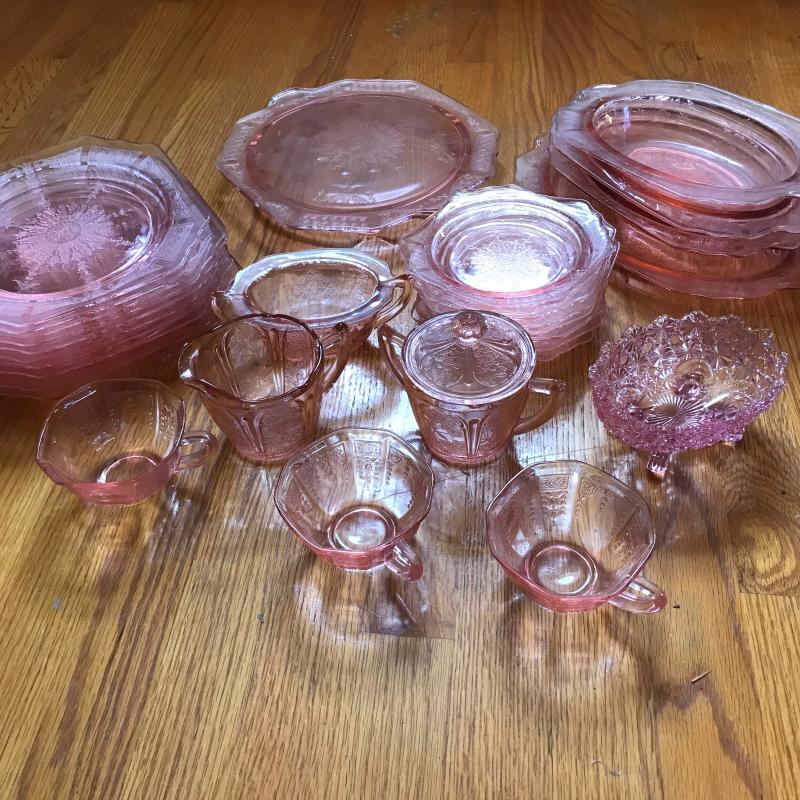 29 pieces of depression glass in several styles and shades of pink. See pics. No shipping available. Local pickup only in Asheville, NC.