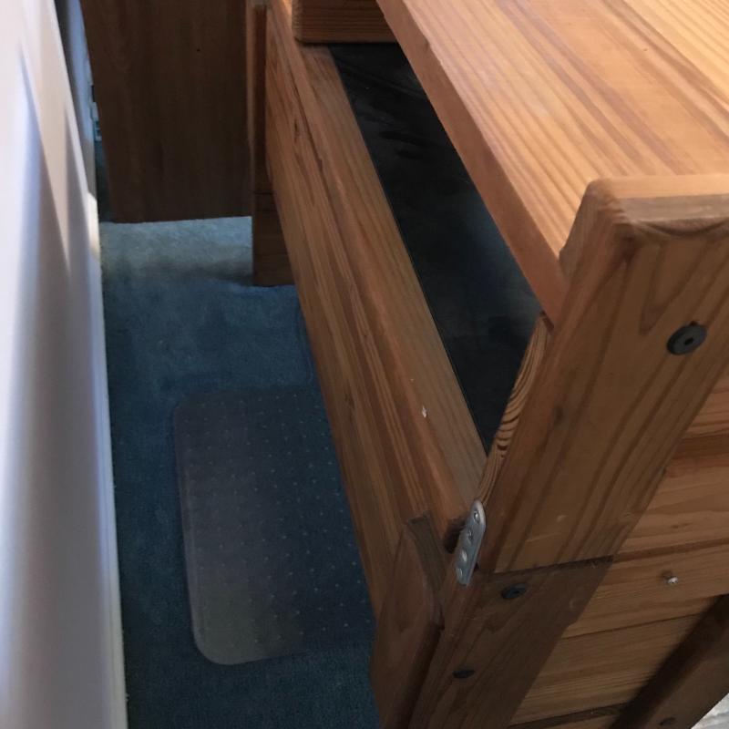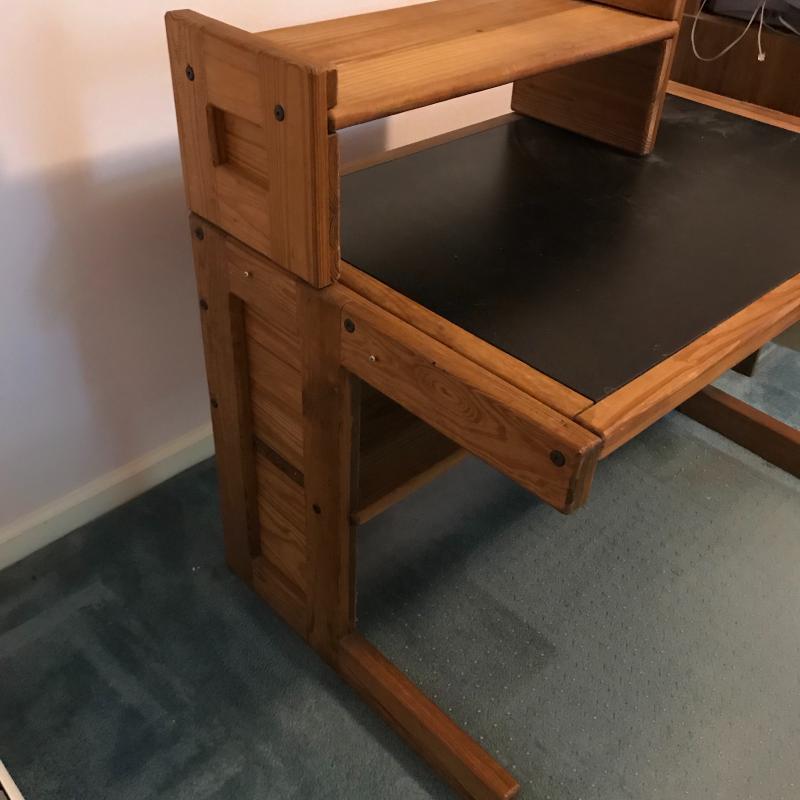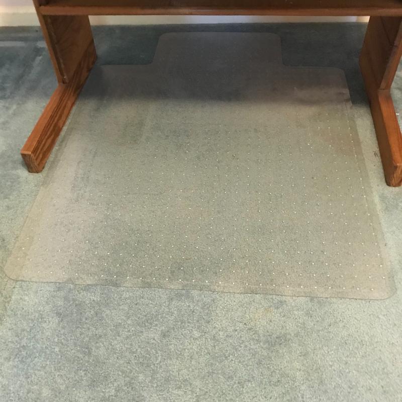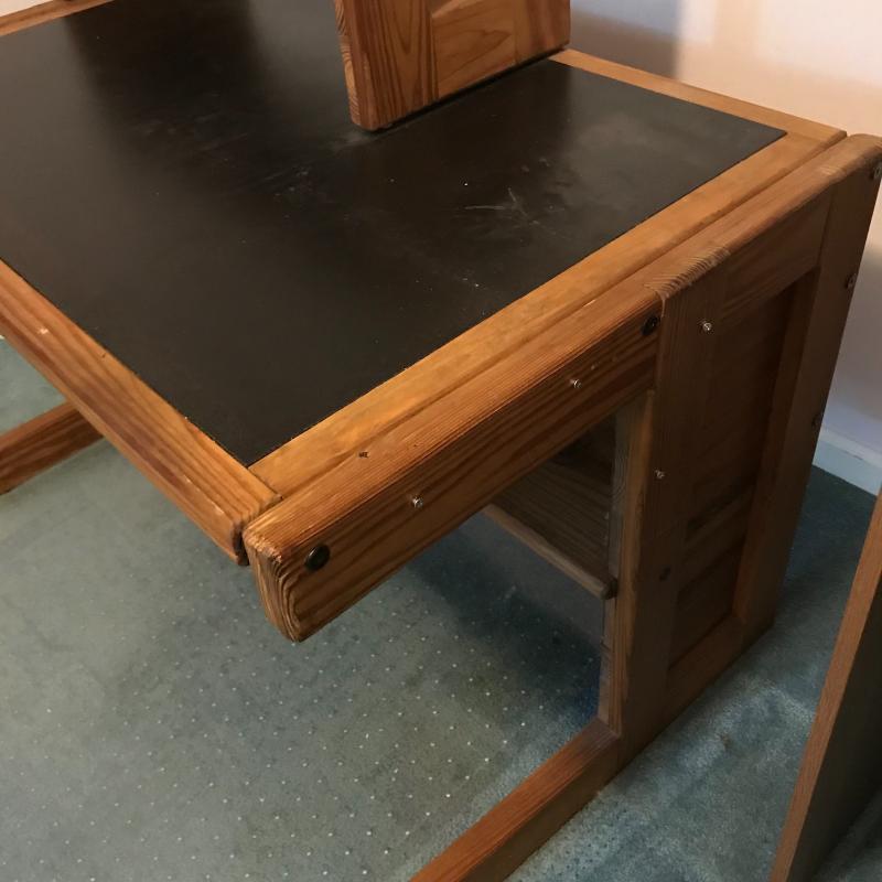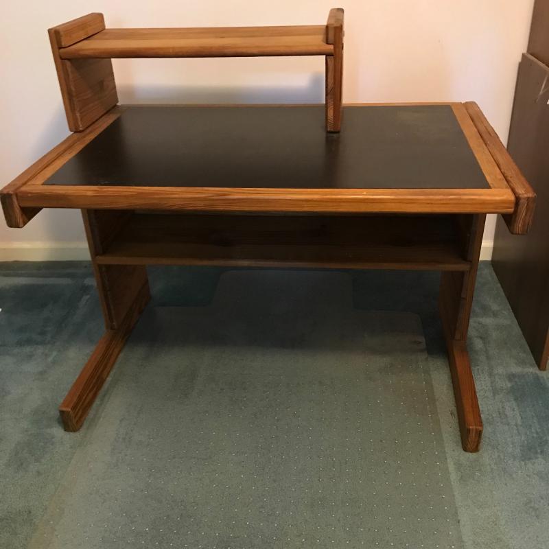 Lot includes sturdy desk in good shape (approx. 42” x 26” x 36.5”) and floor mat for rolling chair. Desk is solid wood trim with black insert that appears to be formica. Shelves are all attached. Mat is 47” x 36”. No shipping available. Local pickup only in Arden, NC. Please bring help to load. This piece is up one flight of stairs.