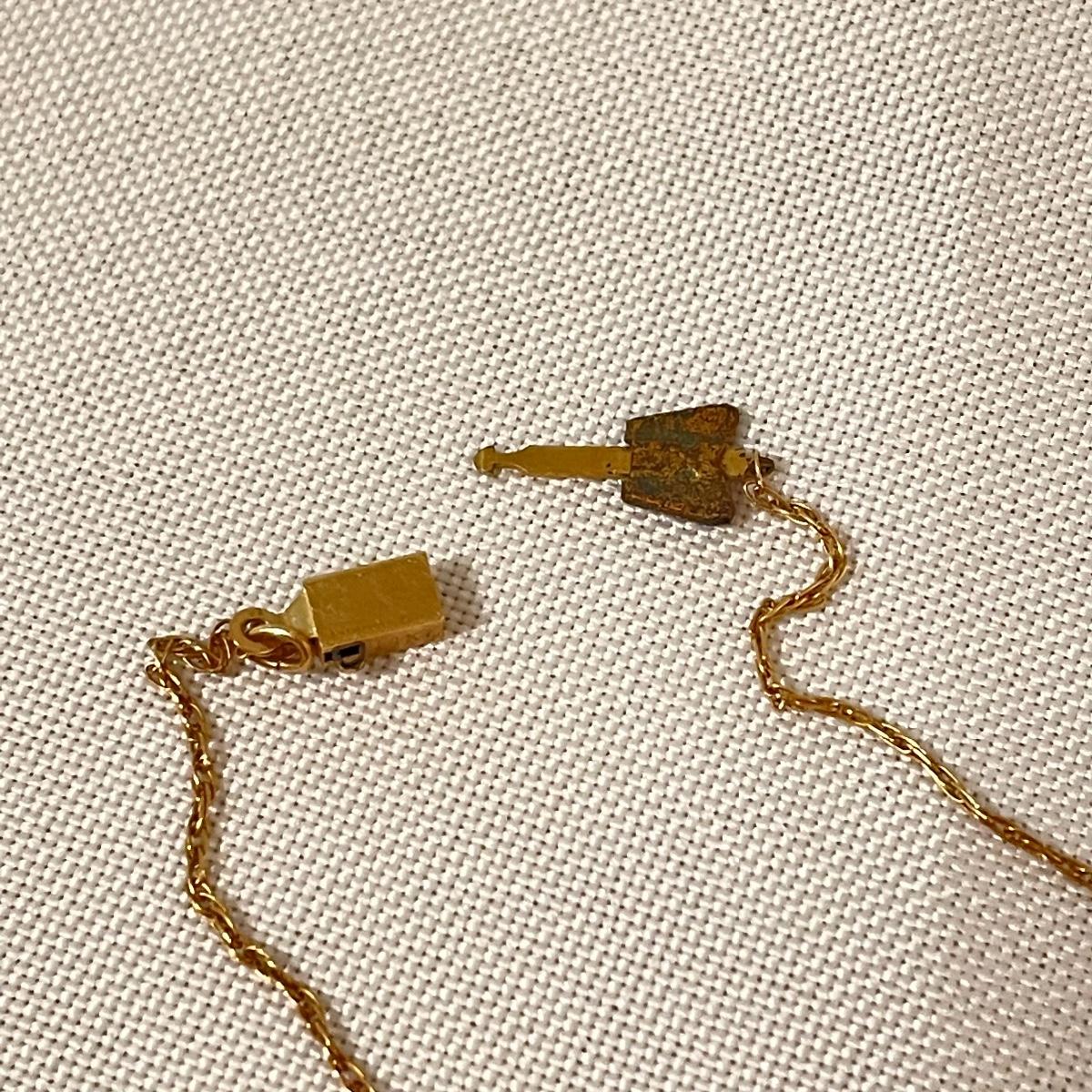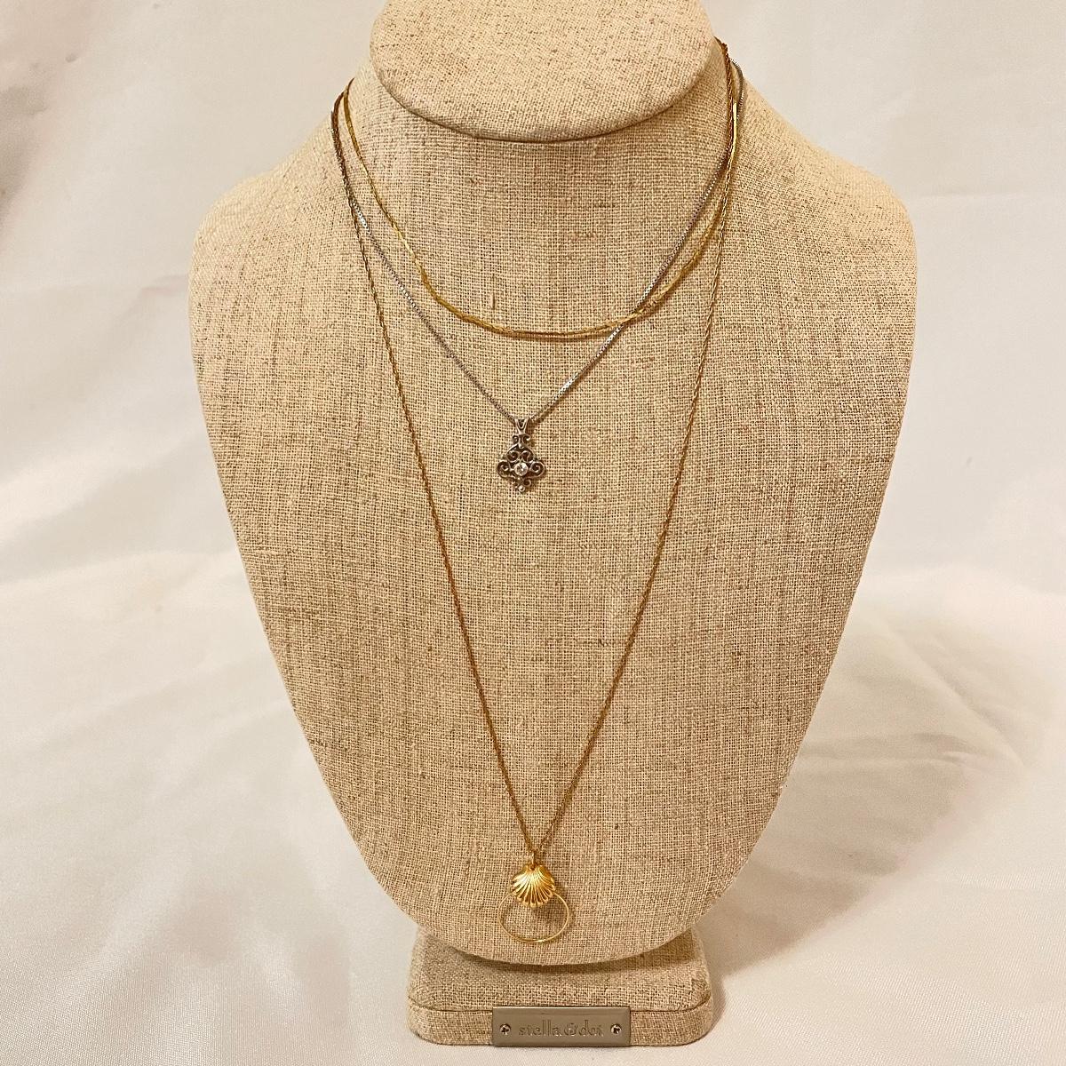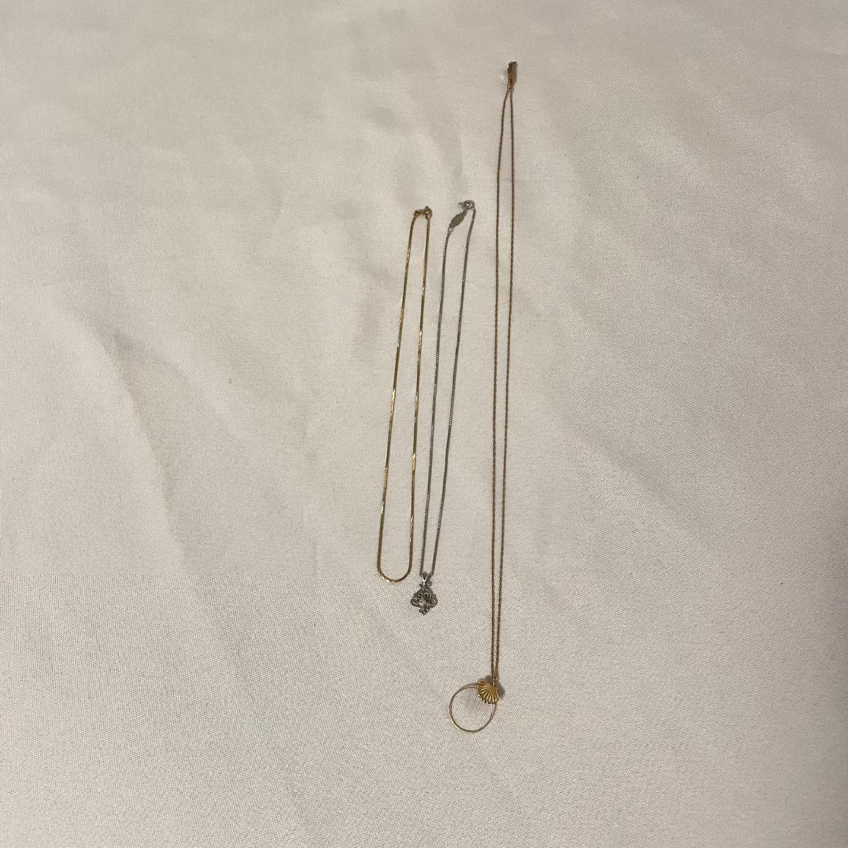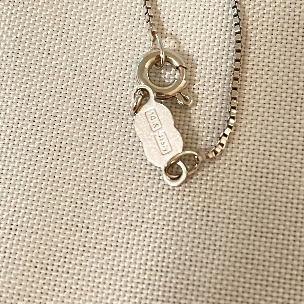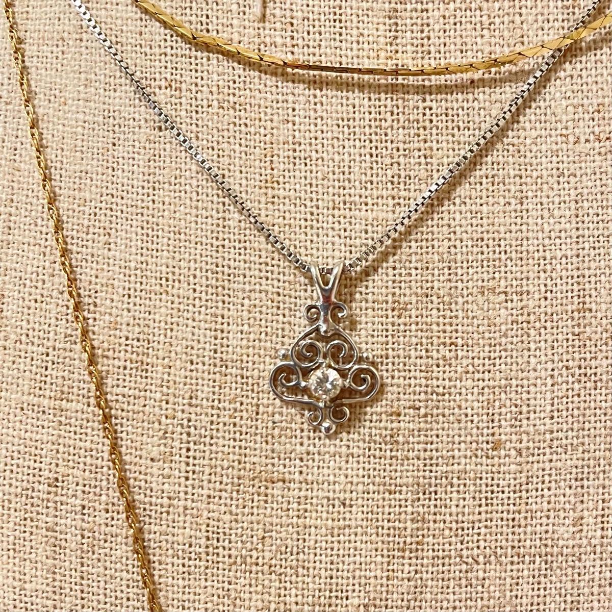 Three 14K chains, one with a diamond in the pendant. This white gold necklace is marked 14K. The longest chain has 14KL on its butterfly clasp and a golden colored fastener. The fastener is not marked. Lastly a sweet and simple chain marked 14KT. See images. Necklaces range from 14”to 24”in length. Starting bid is at or near melt value. Shipping available.
