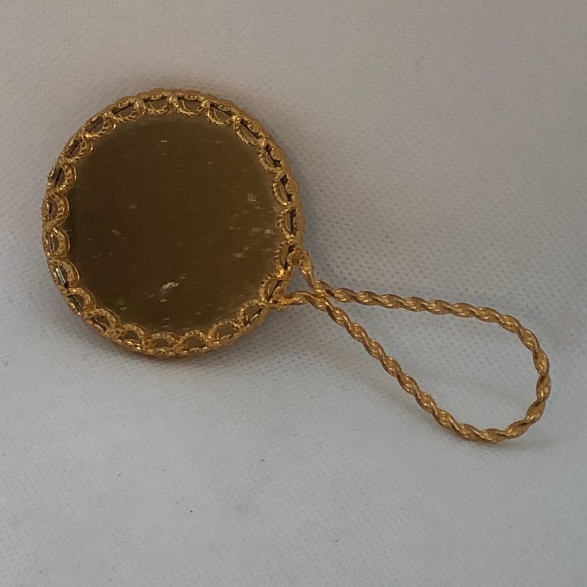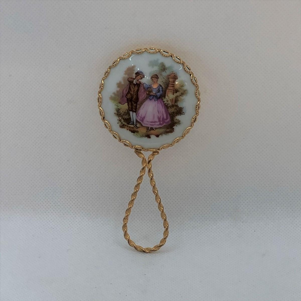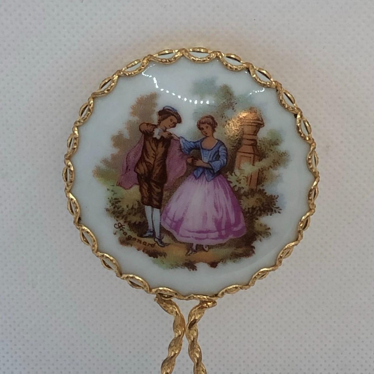 The total length of the hand mirror is just under 5" and it is in excellent condition. The man and woman are on a round piece of what appears to be either milk glass or light ceramic.