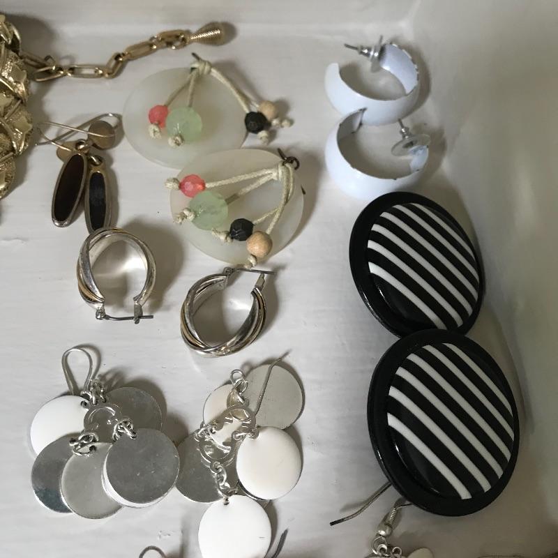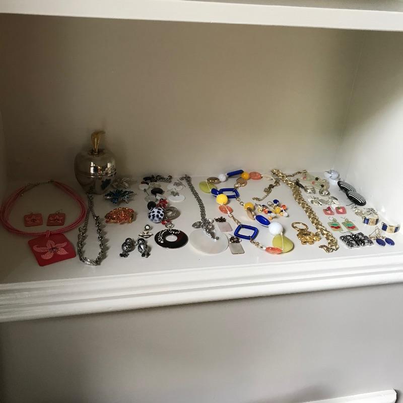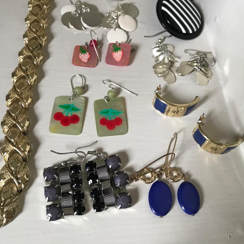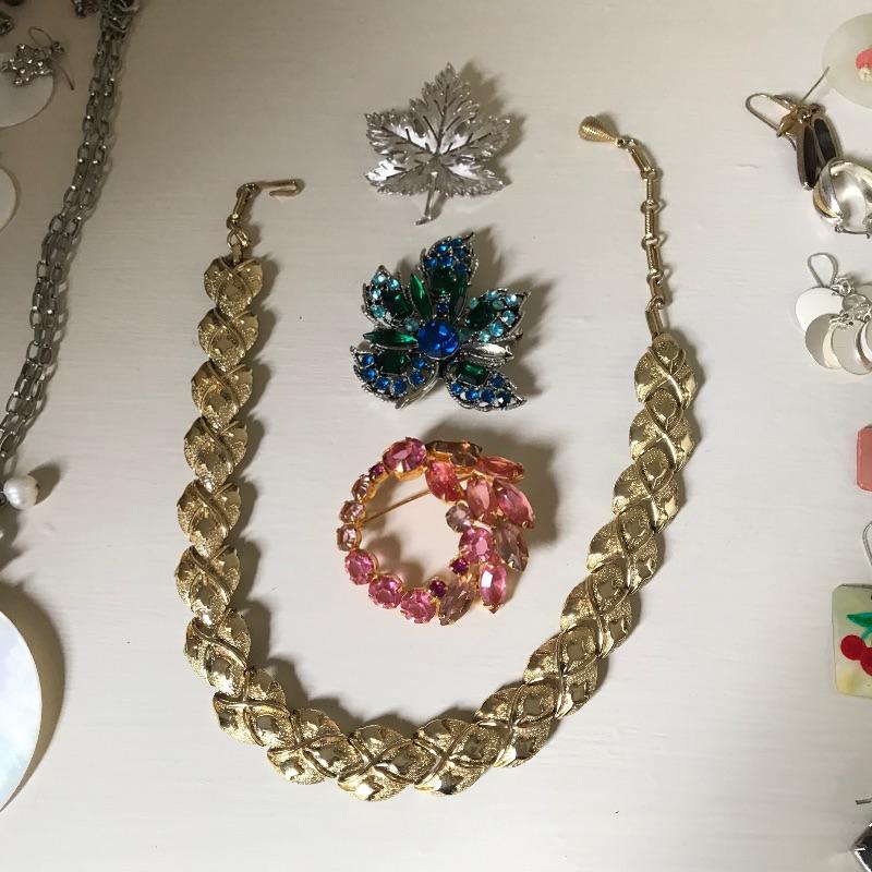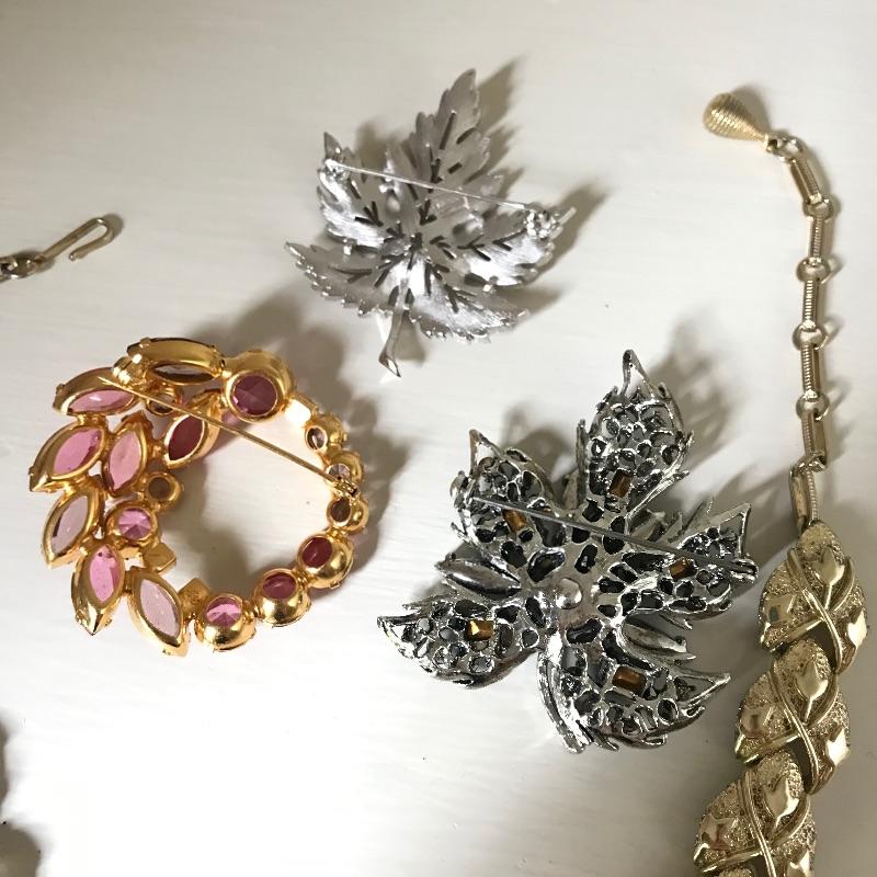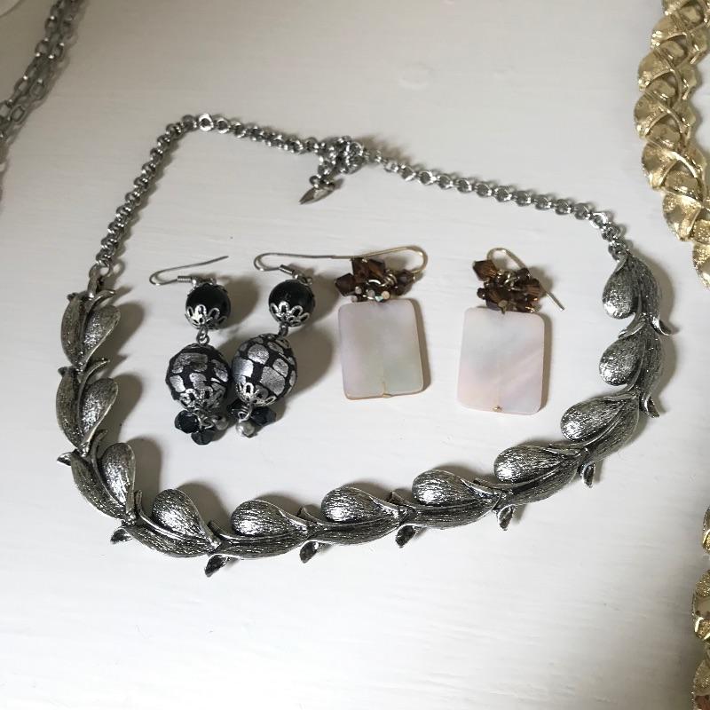 Neat and colorful collection of fashion jewelry for any lady in your life! We’ve given this lot a lot of different looks from casual to elegant. Three earring necklace sets, many pairs of earring for pierced ears, three brooches, an elephant pull box keychain, anchor pin and more! We’ve also added a metal silver and gold colored cloth lined box. Most pieces are unmarked, the silver colored leaf brooch has a Trifari mark. The silver colored necklace, in the fourth picture and final three photos, appears to be hand made, but no markings were found. See photos. Shipping available.