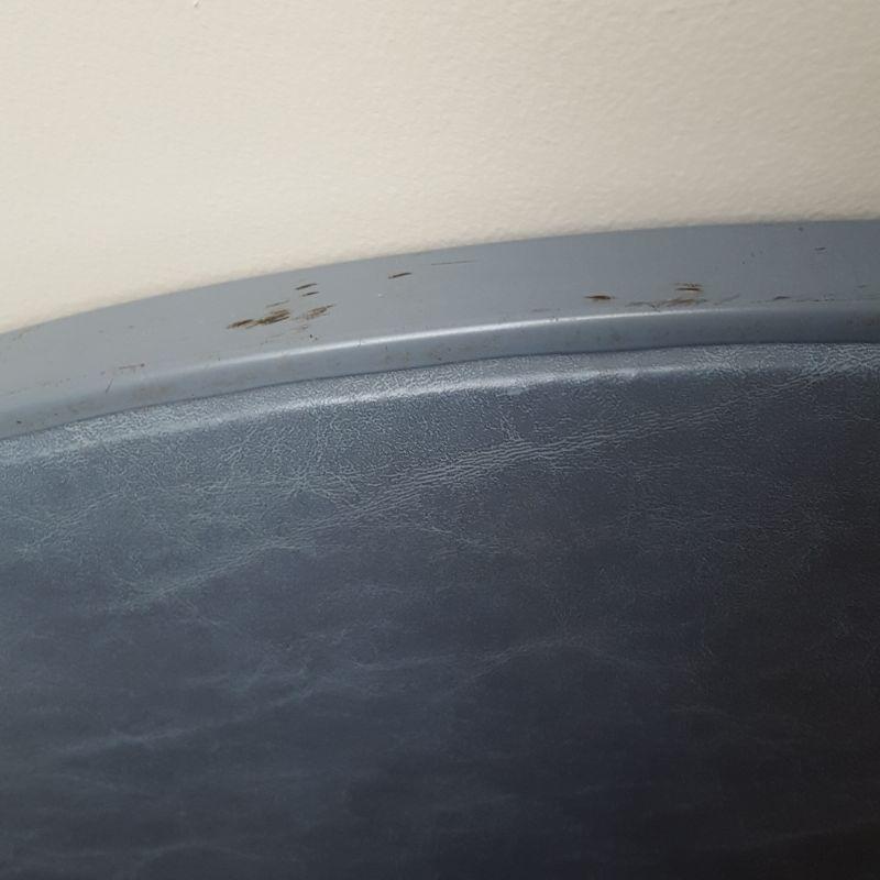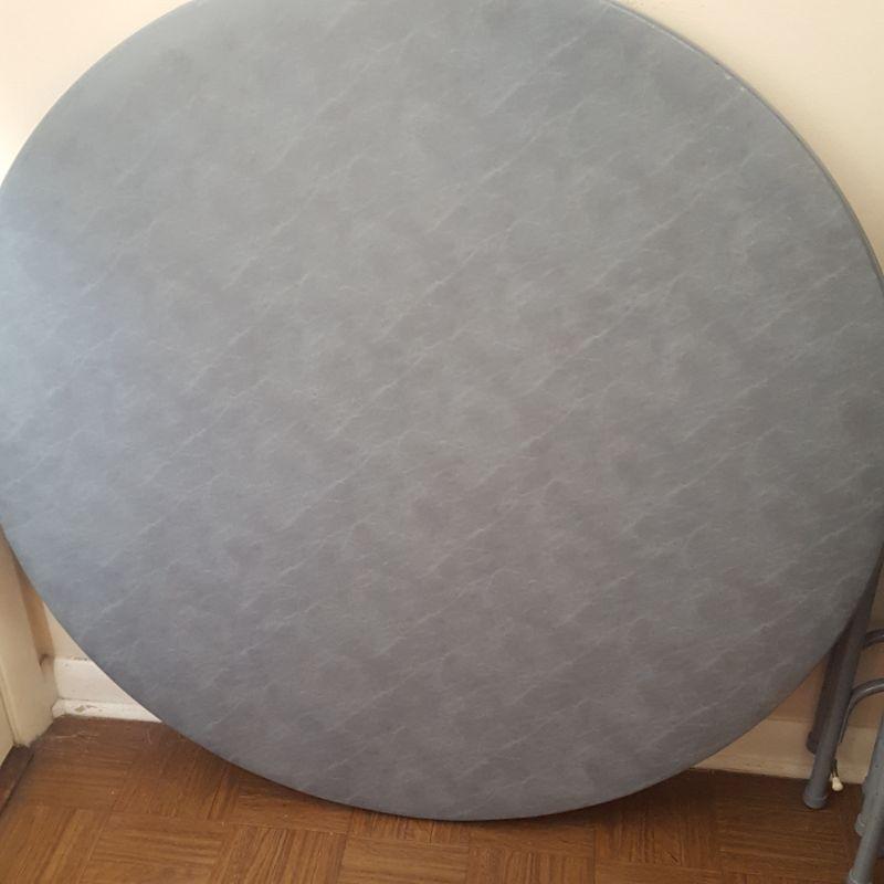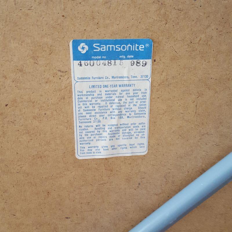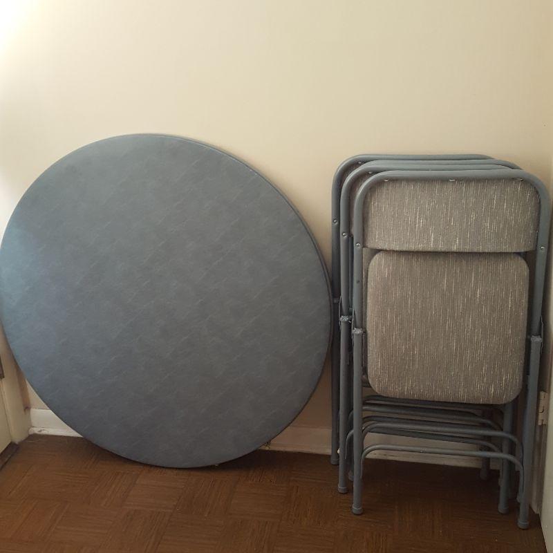 A Samsonite circle card table and chairs for your entertaining! This lot includes a circled table covered in vinyl that appears to be in great shape. There are 4 cloth/cushioned matching chairs. Local pick up only.
