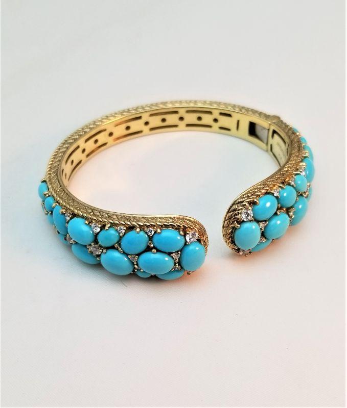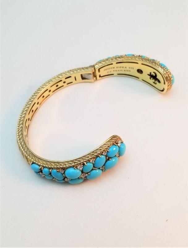 Another Judith Ripka beauty - hinged bangle set with turquoise and czs for accent. Note: this is for a small wrist. If your wrist is over 6 inches this bracelet probably won't fit. Excellent condition - it's a beauty! Weighs 1.50 ounces.