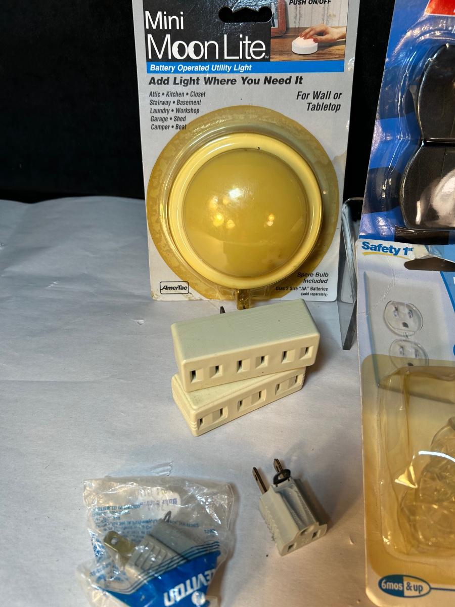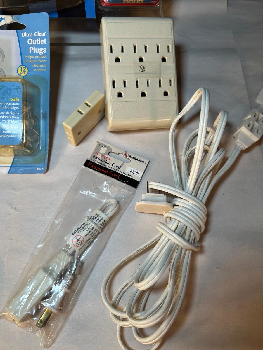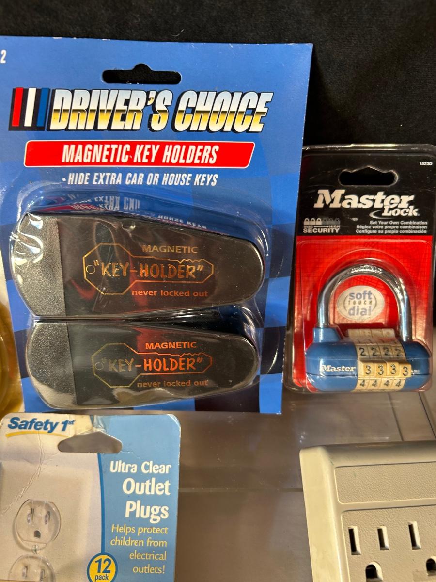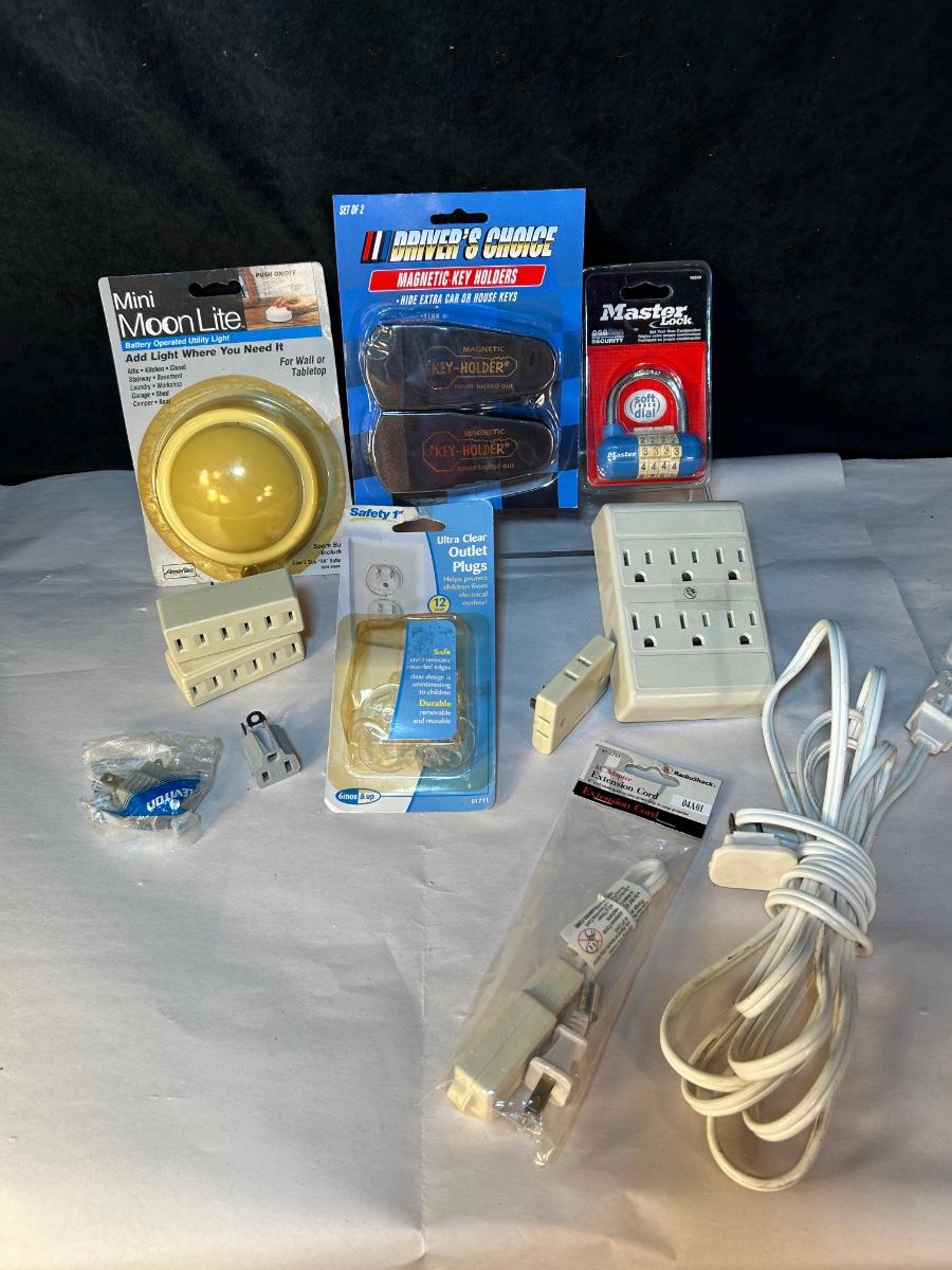 Outlet expanders, extension cord, new combo lock, battery-powered light, outlet plugs magnetic key holders