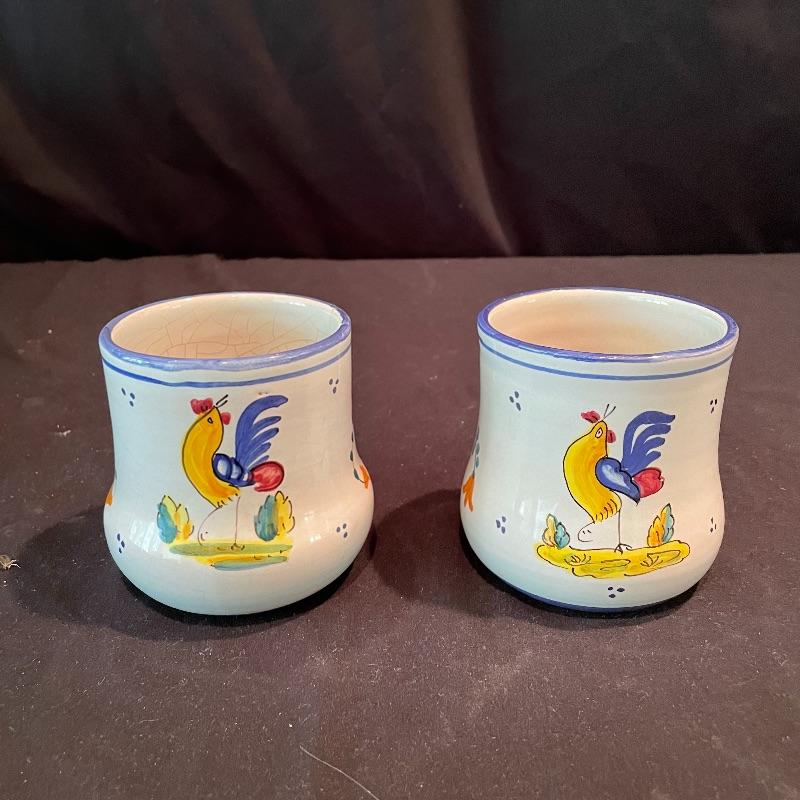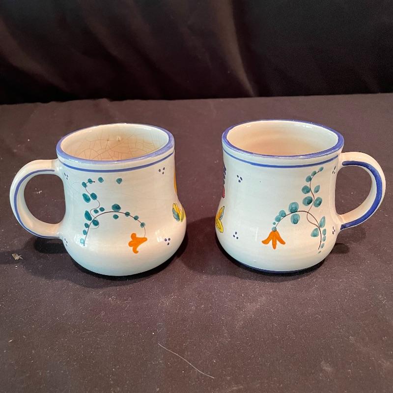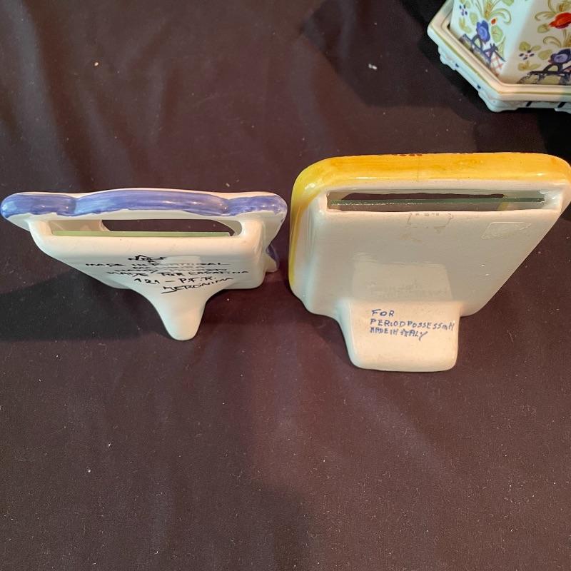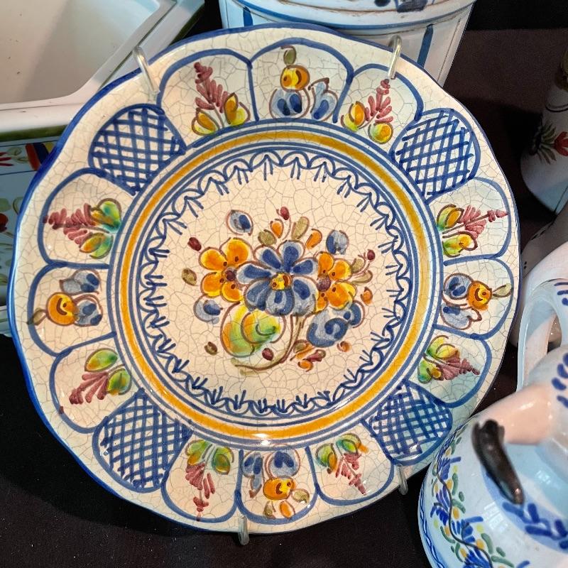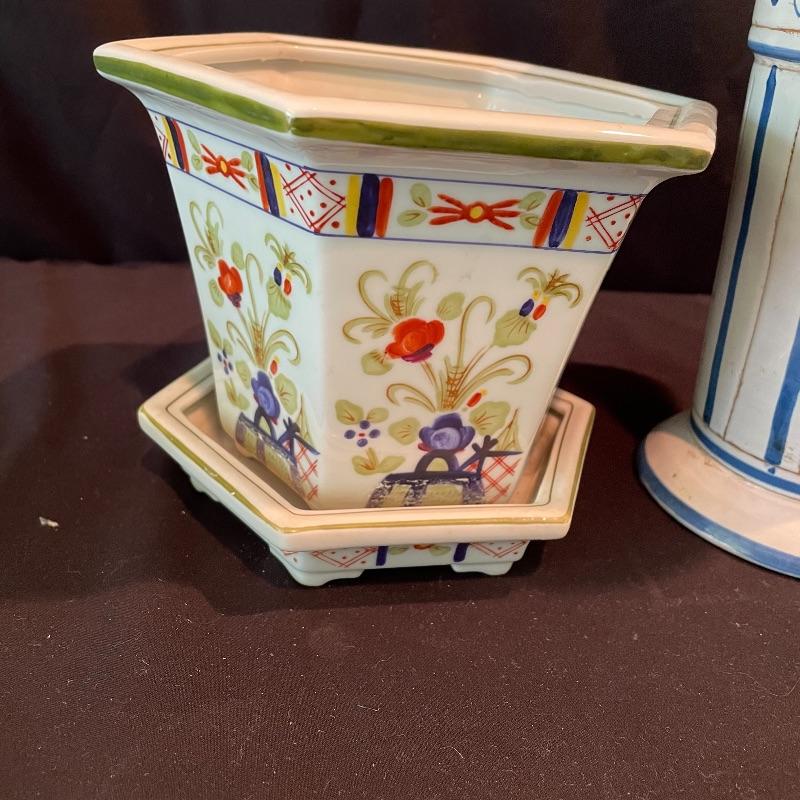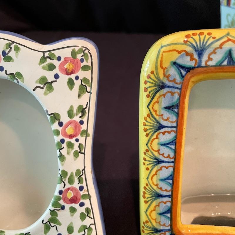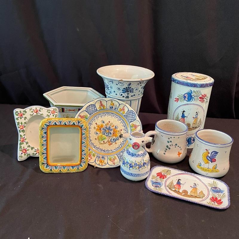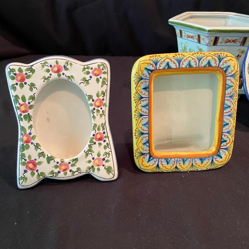 Add some color to your world with this fun international lot. Lot features a lovely hand painted planter with drainage hole and plate. It also has two ceramic picture frames with glass insets, a couple of cheeky rooster mugs and a Spanish bull creamer pitcher. The 8.25” tall vase is simply beautiful even though it has a few chips in the rim. Lastly, a small decorative plate with wall mount and a tin-like canister and rectangular plate duo. See images. Local pick up only.