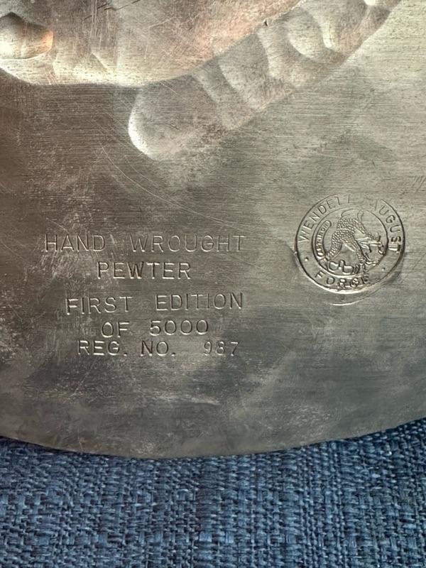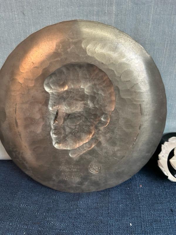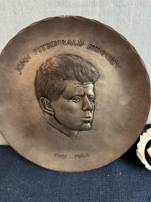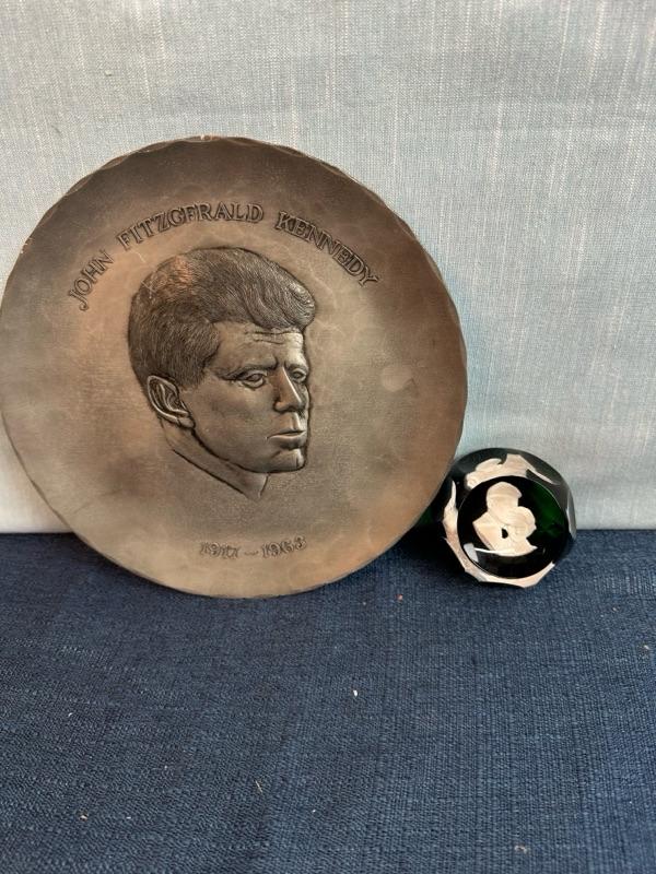 Lot 75, JFK pewter limited edition, 9 inch plate, and John and Jackie Kennedy glass paperweight