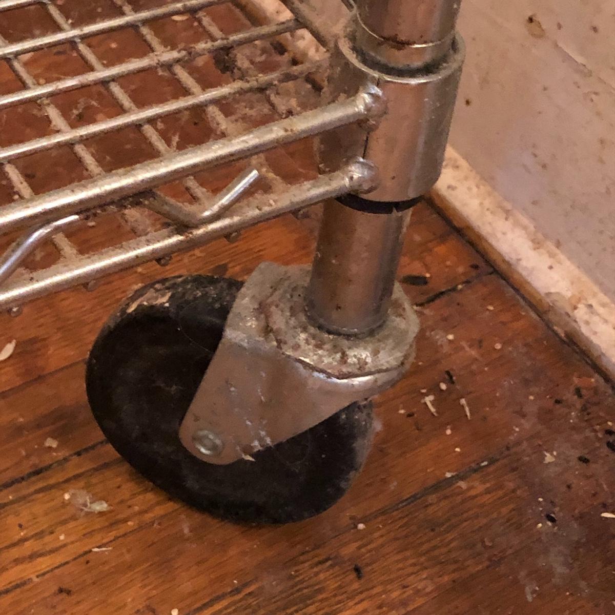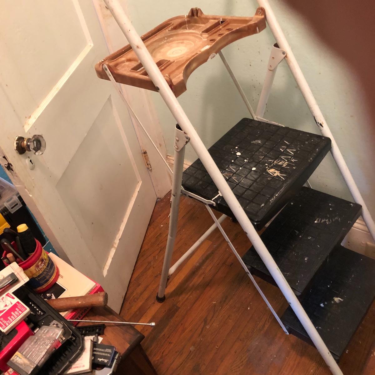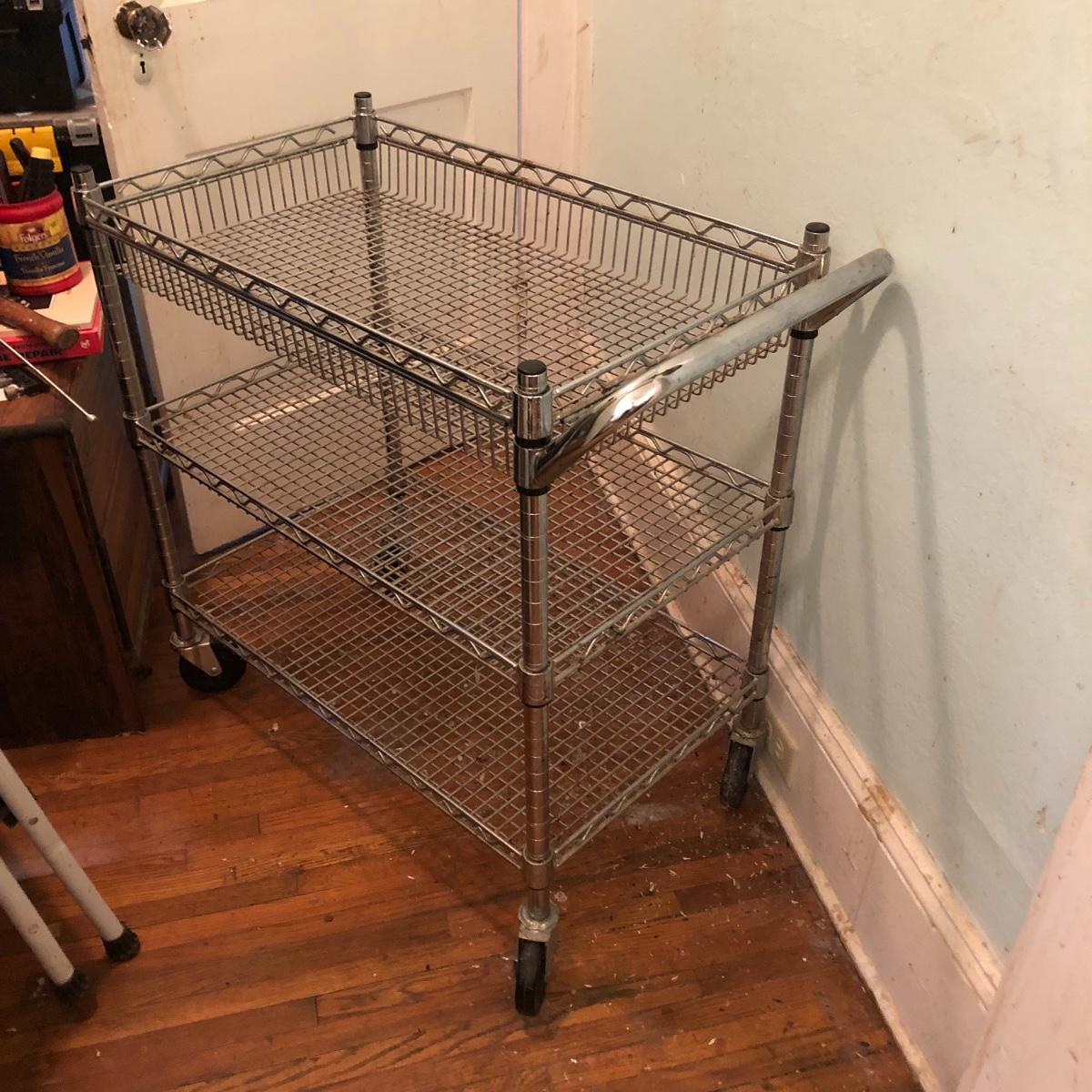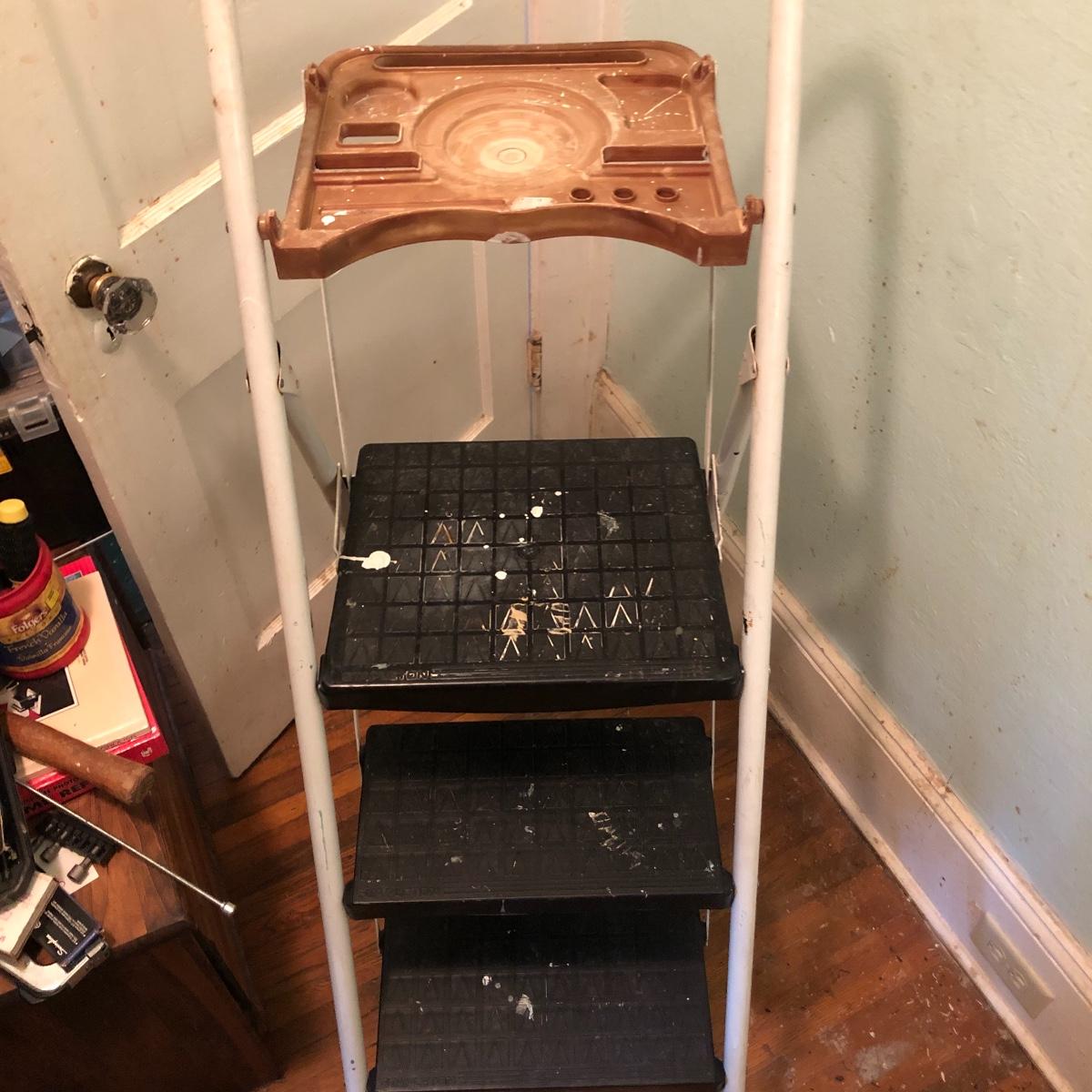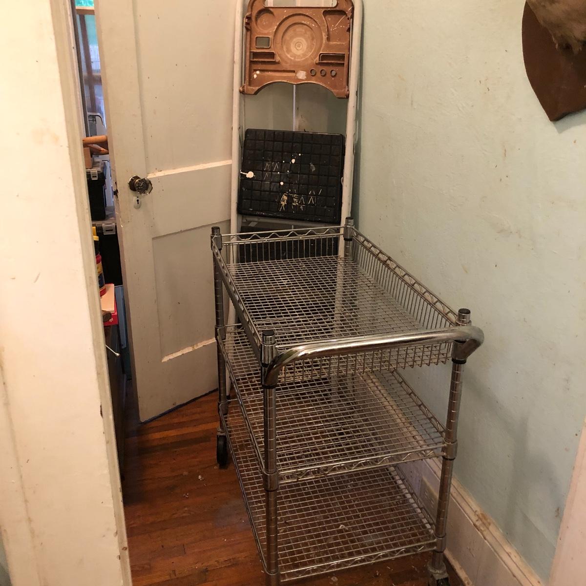 This sturdy metal cart makes for plenty of maneuverable storage with 3 spacious shelves. It has good sturdy wheels also, 2 of which lock and and a handle to pull the cart. It measures 18” deep x 30” wide (add 4” for the handle) x 29” tall. The folding step ladder has a metal frame with sturdy plastic steps and is 61” tall.