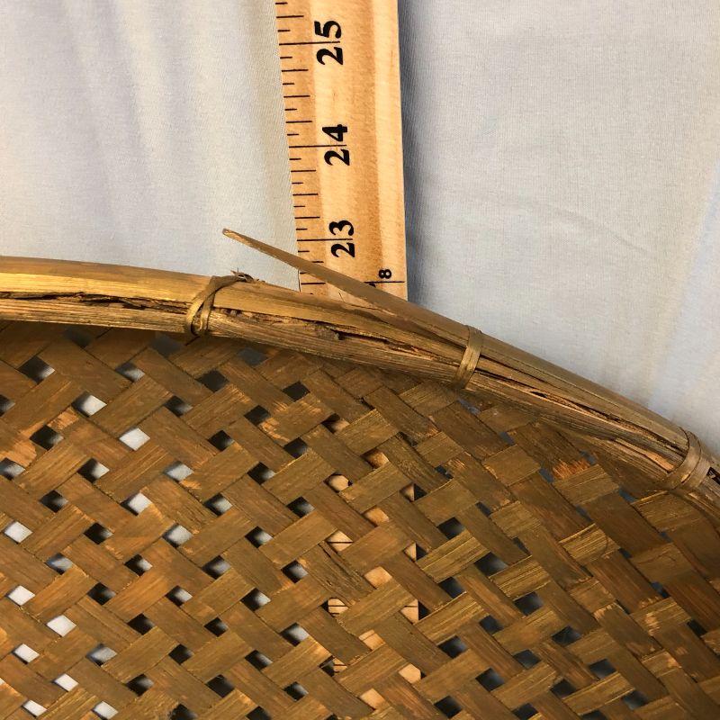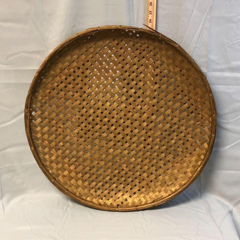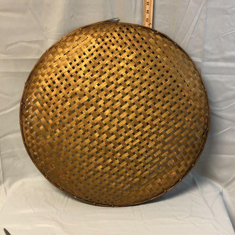 This tray is in excellent condition. It is very large (about 24.5" in diameter) and is painted in a gold color that blends with the color of the natural material it is made with.