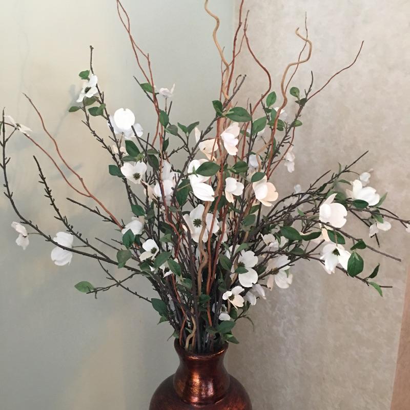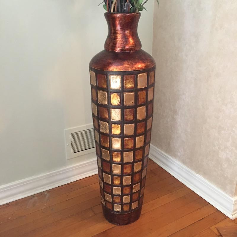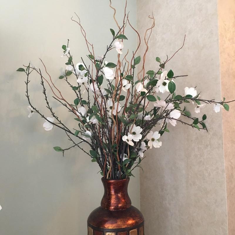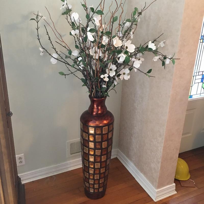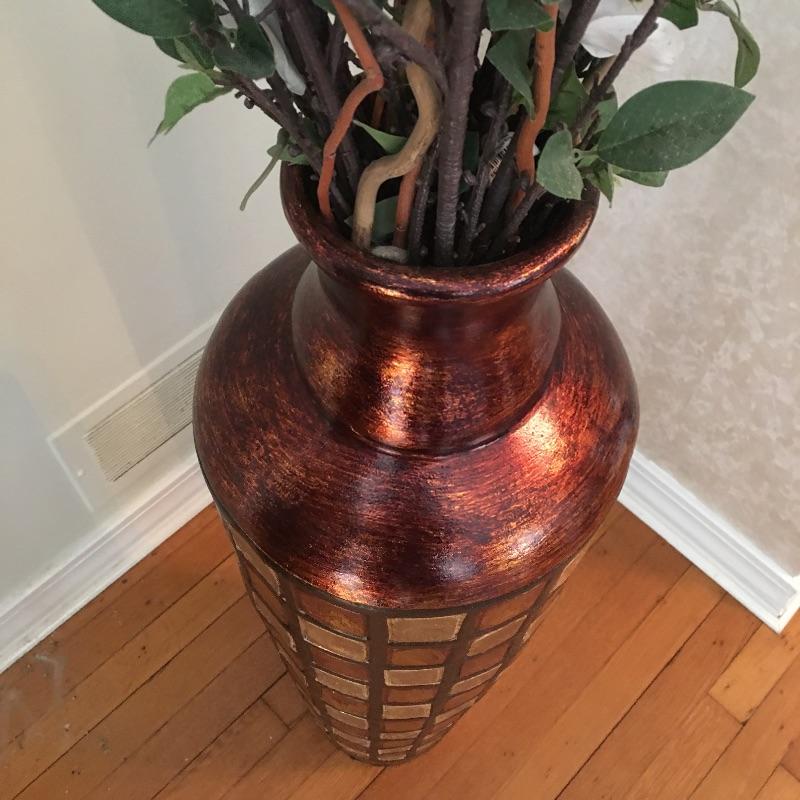 Large copper colored vase with faux cherry blossom flowers. Make that empty corner of your room bloom with its bold colors. Vase measures 10”D x 37.5” tall.