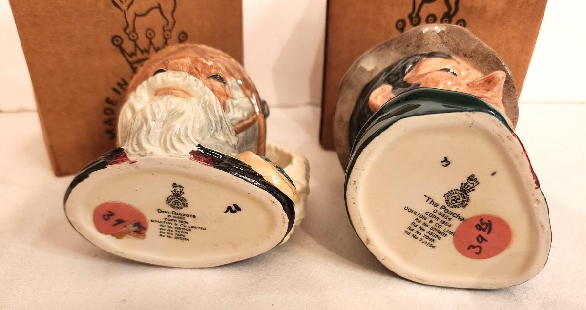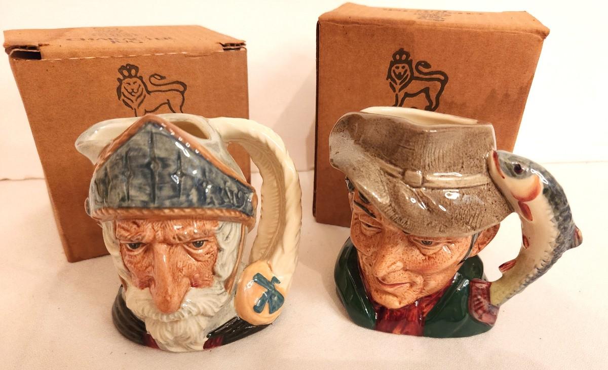 Lot of 2 vintage Royal Doulton character mugs in boxes - "The Poacher" (D26464) and "Don Quixote." (D6460) Both in good condition. Each 4" tall.