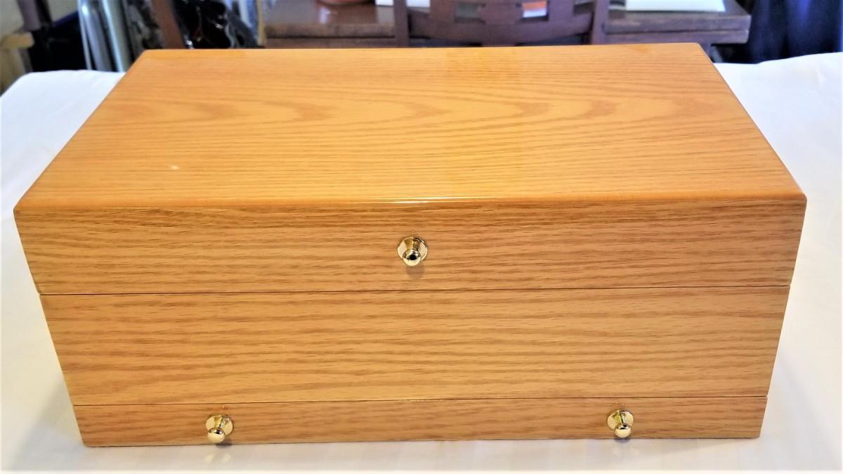 Gently used Lori Greiner QVC jewelry box. Polished finish - opens to reveal lots of compartments for storage and there is a drawer underneath. Mirror in good condition. There is one nick in the top (as shown). Measures 14" across, 8.25" deep, 5.75" tall.
