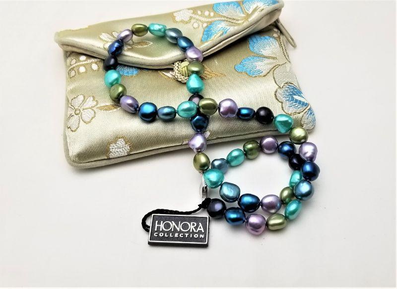 Lovely freshwater natural pearls by Honora - original pouch and box - beautiful jewel-tone colors. Measures 17" long - sterling clasp.