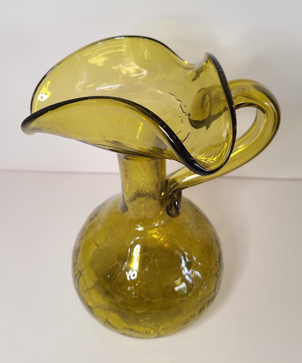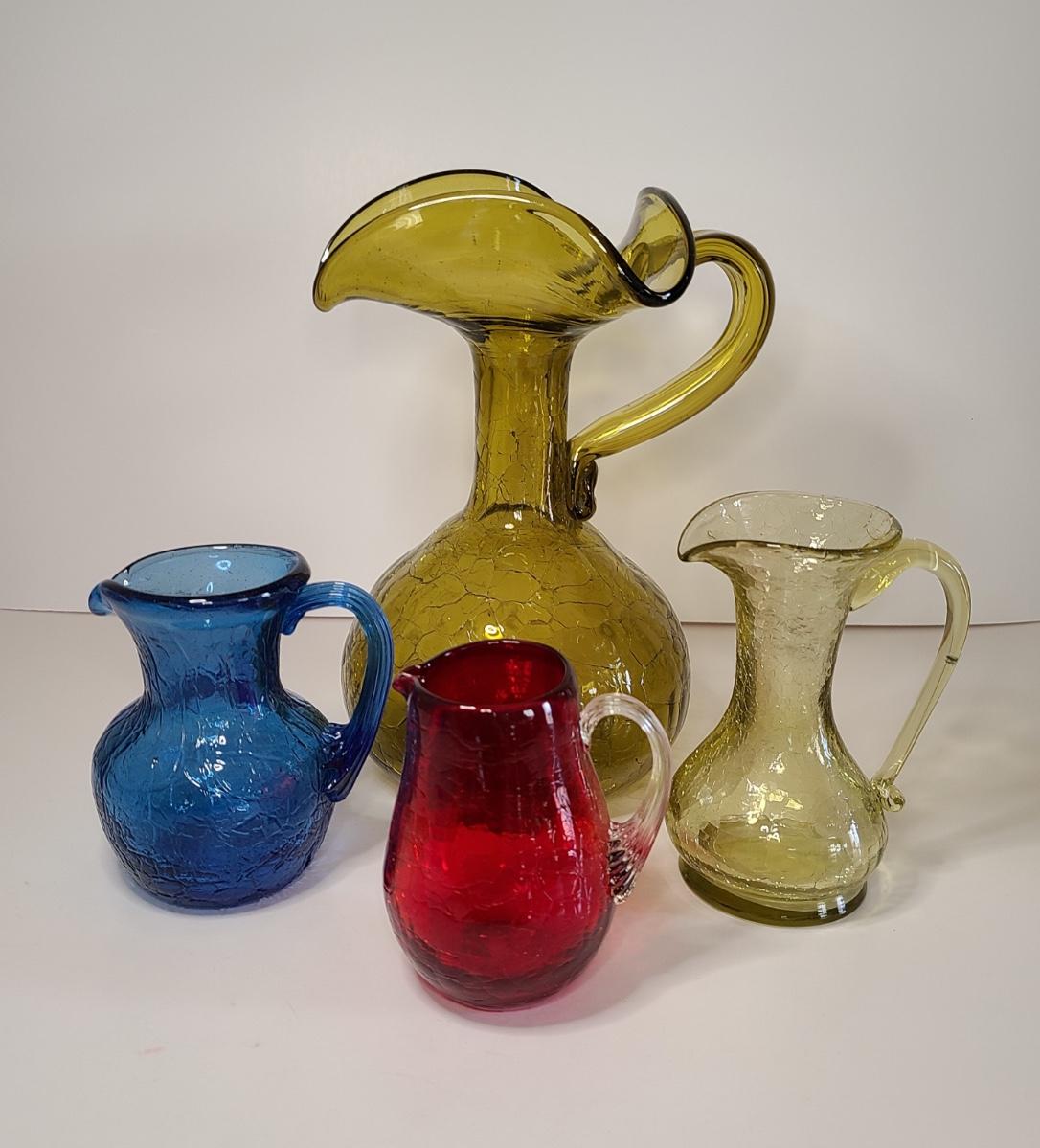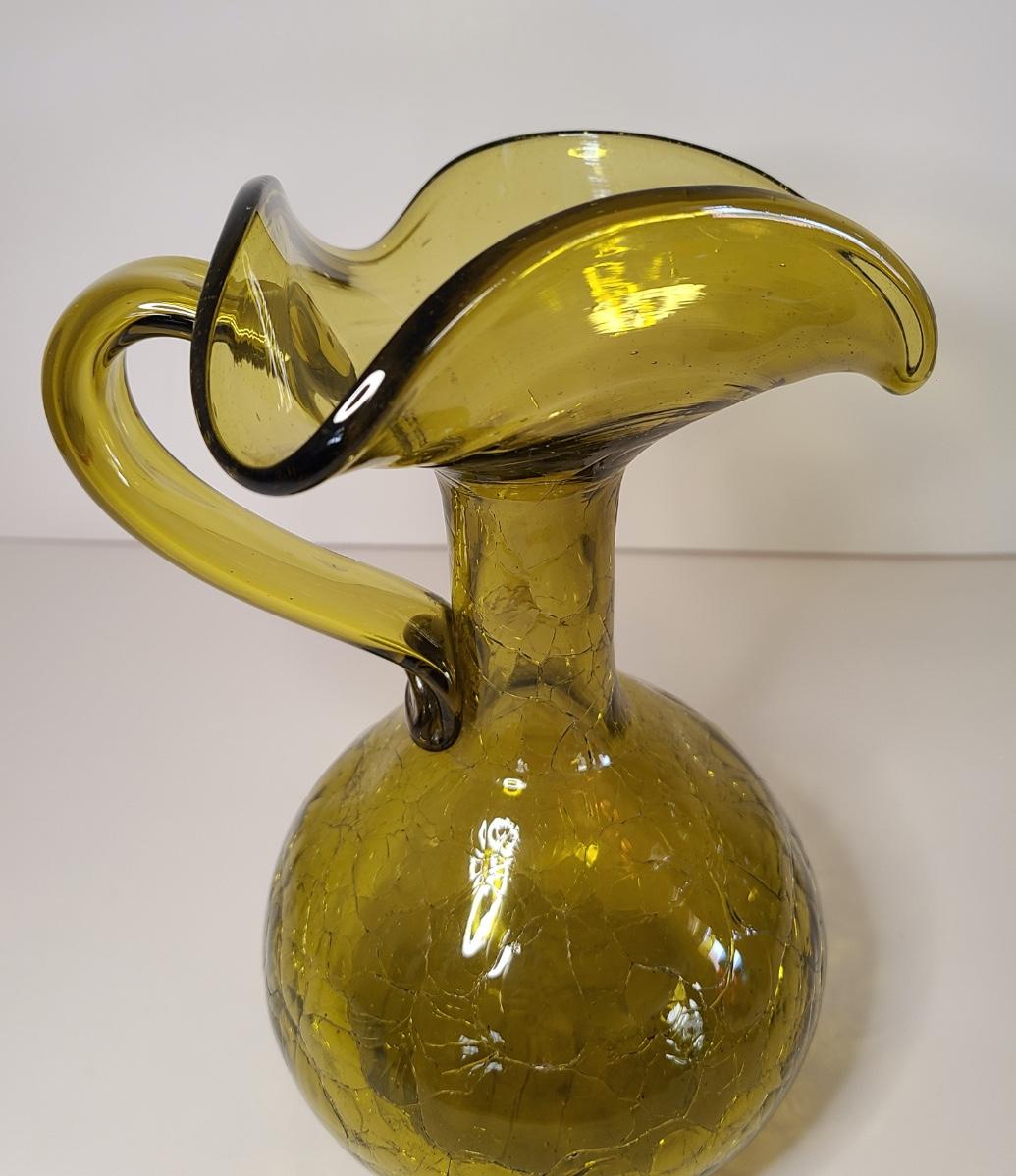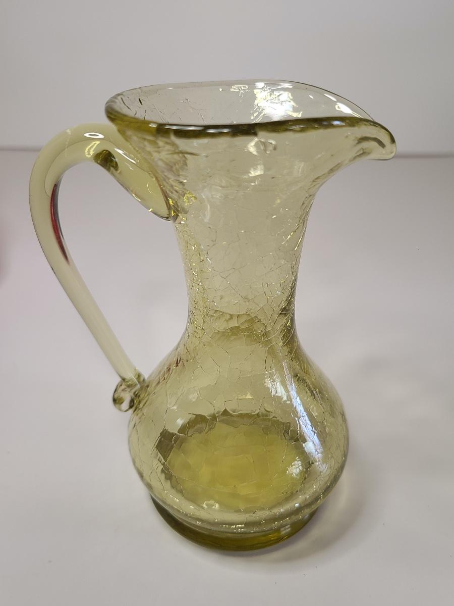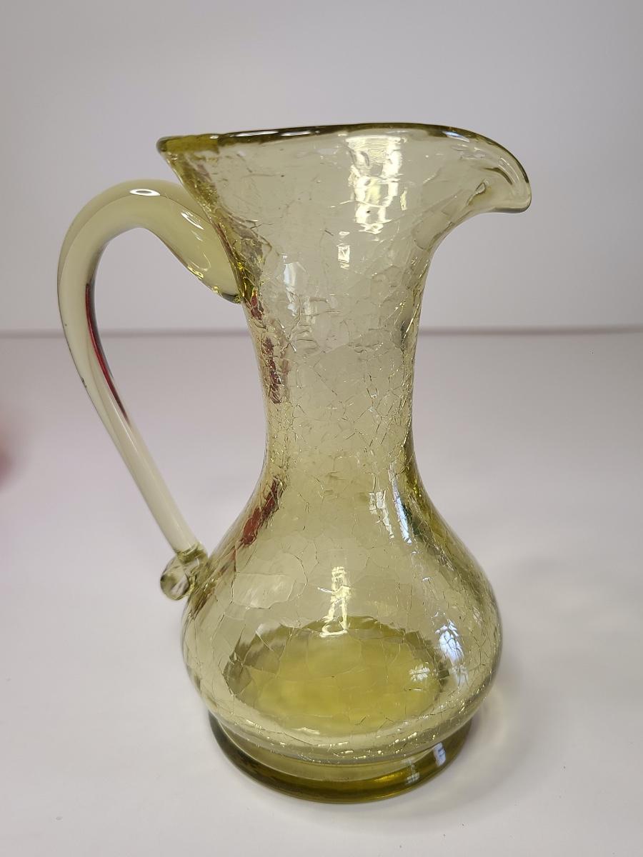Lot 75: Nine Inch Tall Crackle Glass Pitcher with Flared Rim and More