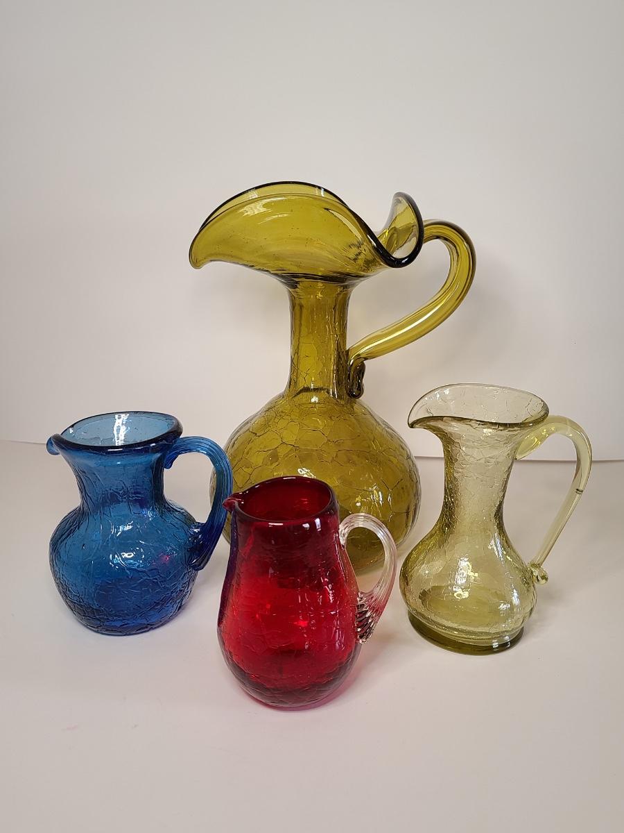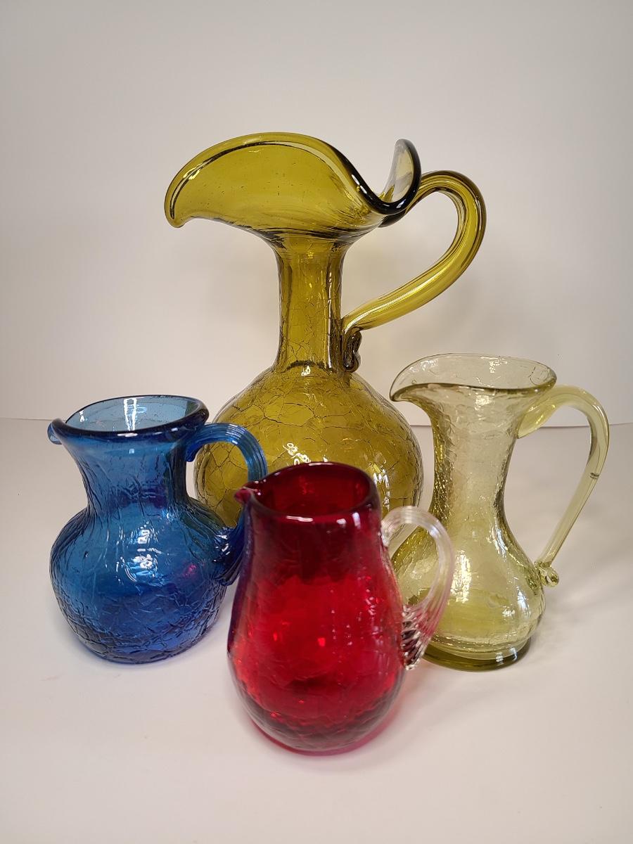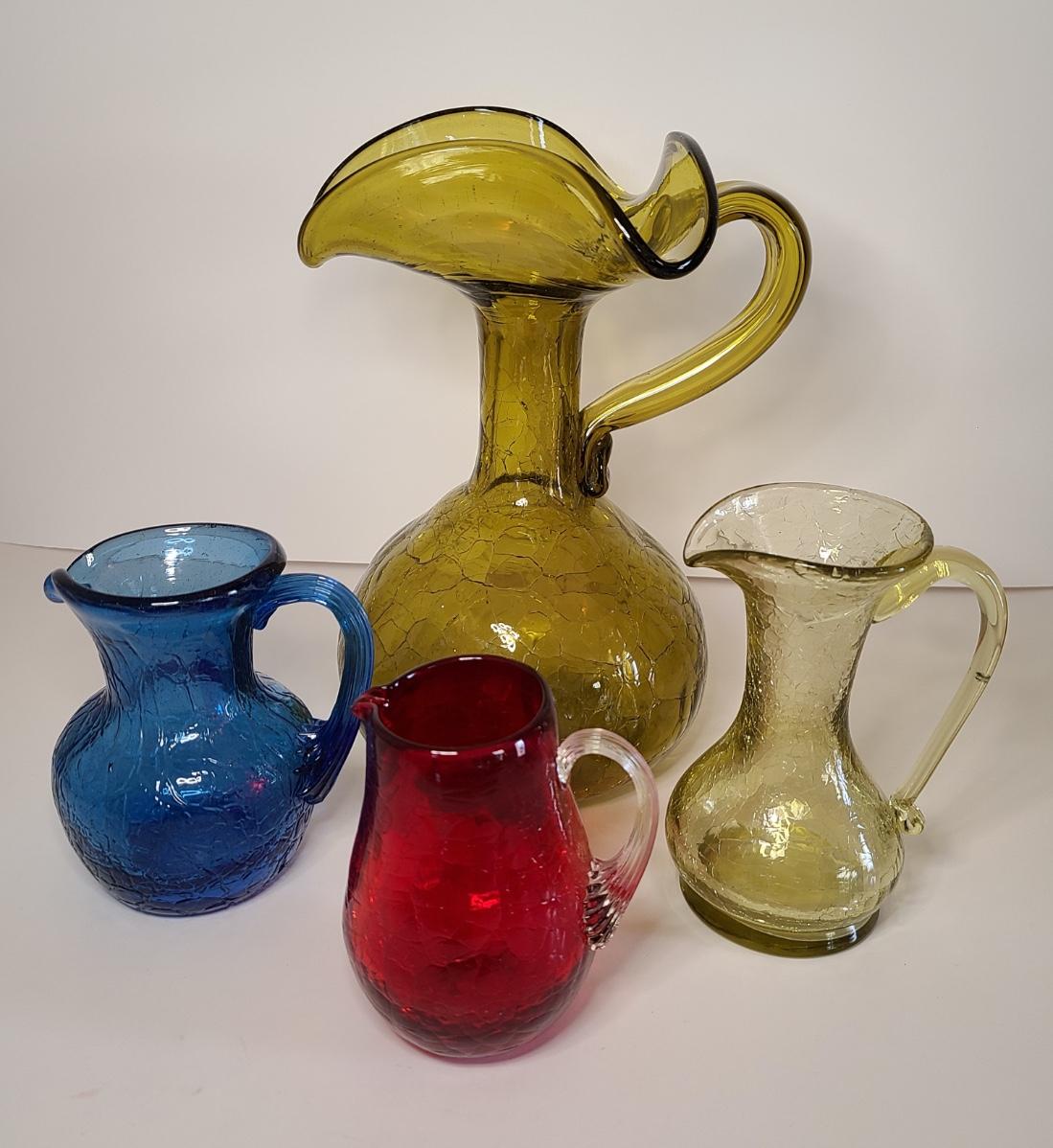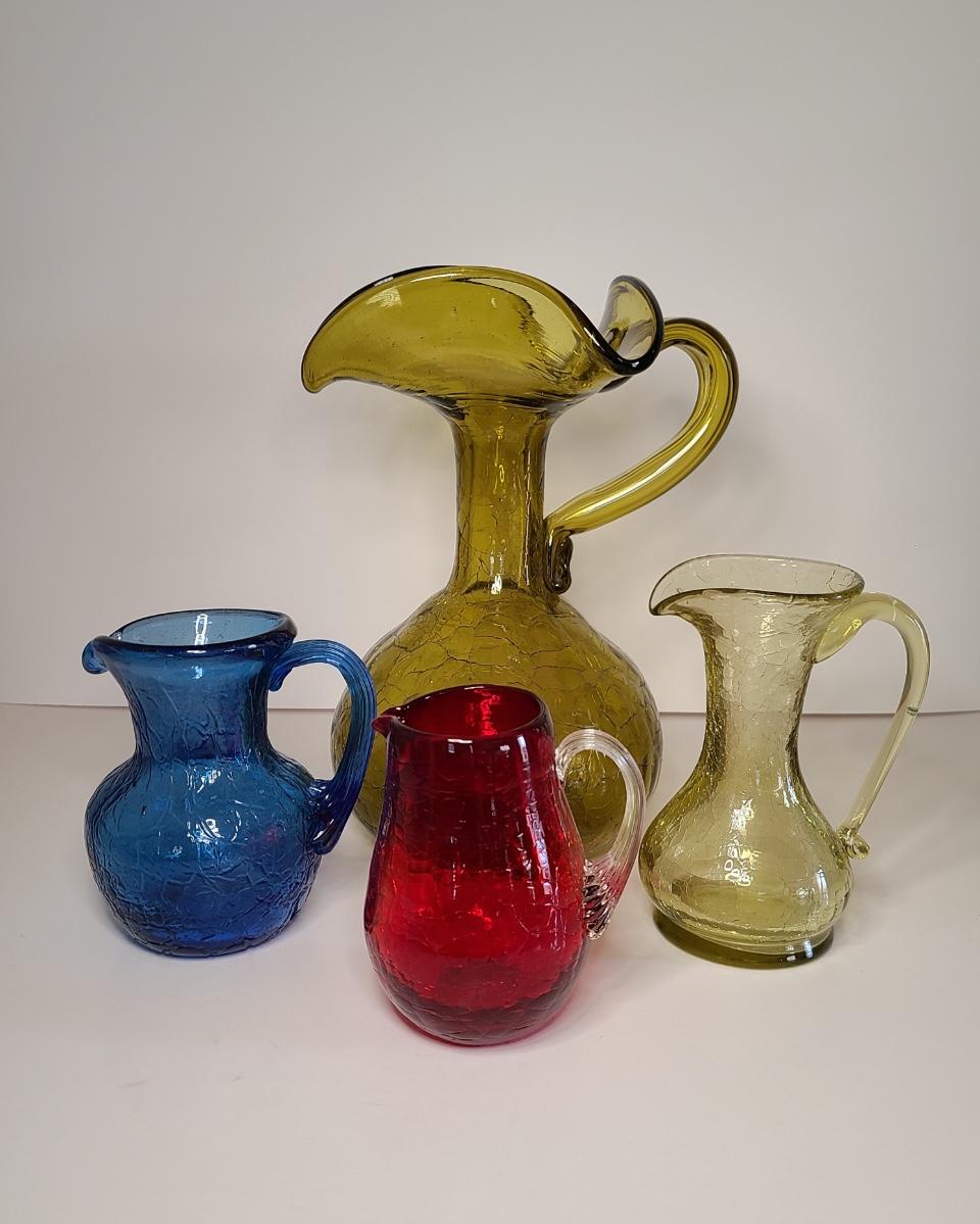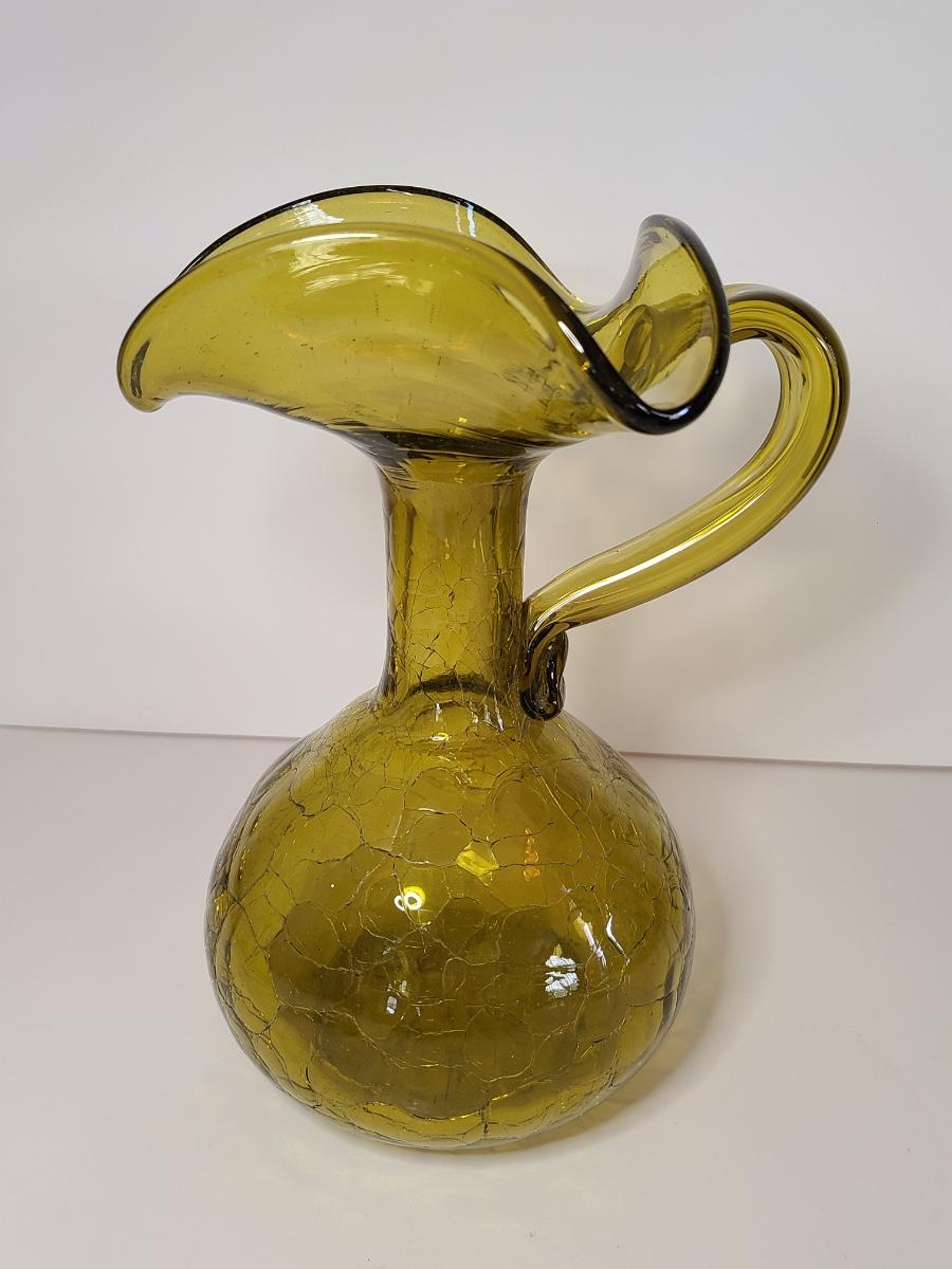 Lot 75: Nine Inch Tall Crackle Glass Pitcher with Flared Rim and More