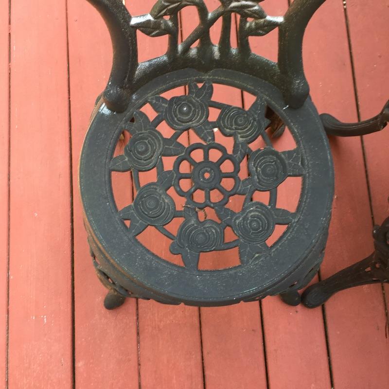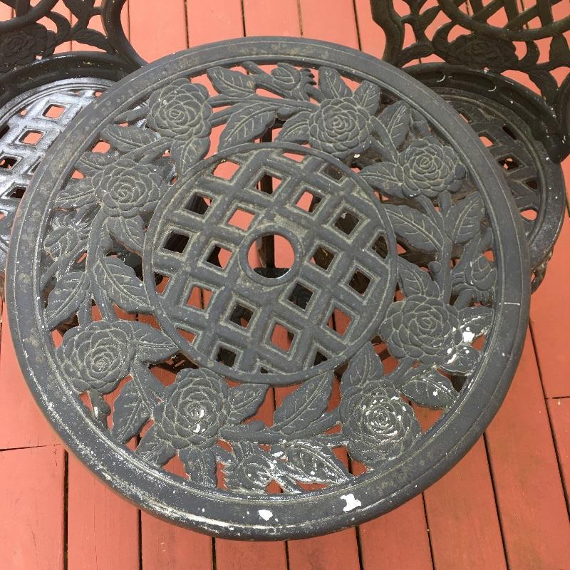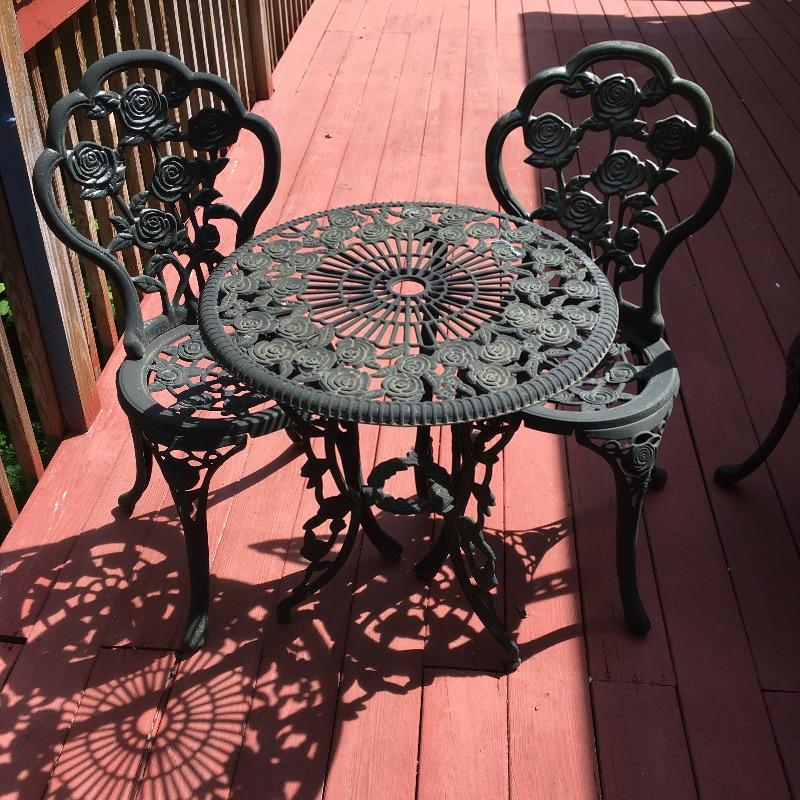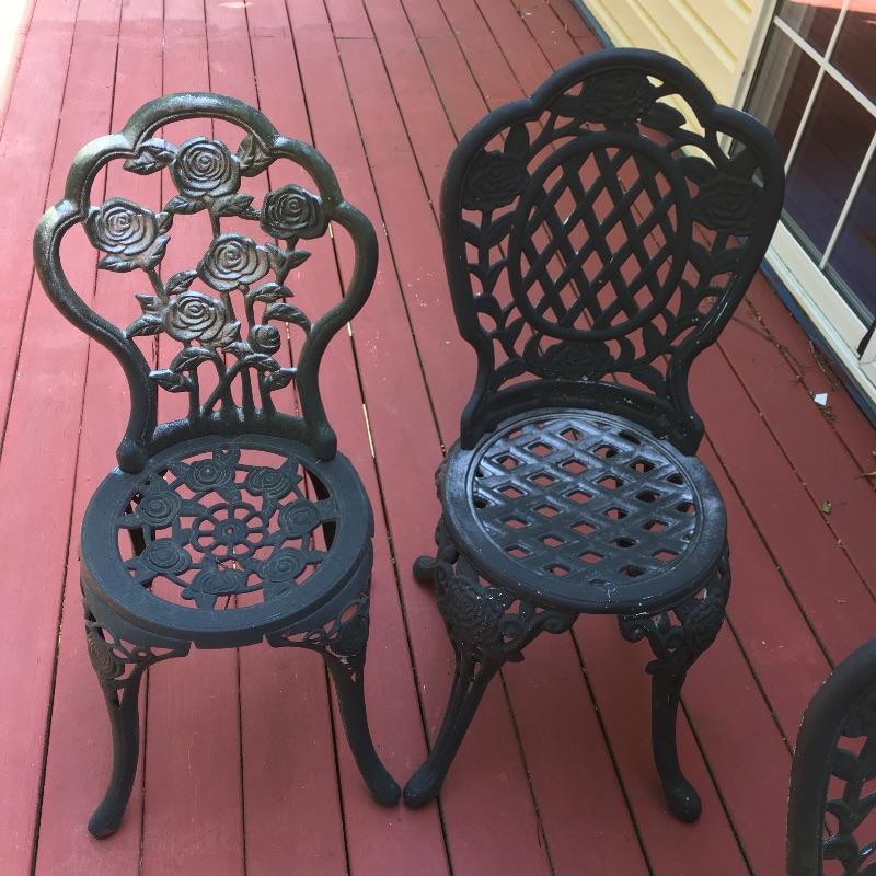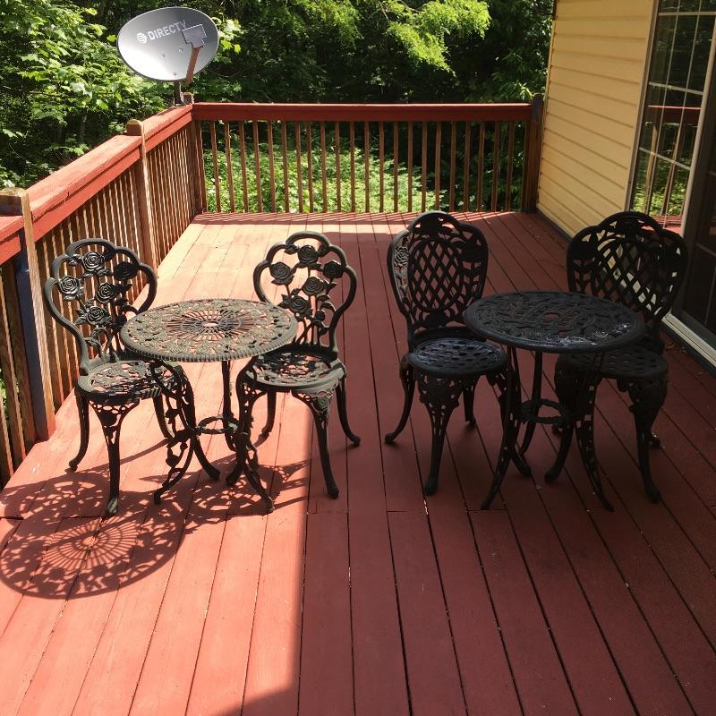 Enjoy the warm weather with these two sets of matching metal chairs and tables. Tables measure 23.5”D x 27” tall. Have a cold libation enjoying the outdoors in these cool tables and chairs. Sets could use a good clean and have some paint chipped off, a little elbow grease and they will be as good as new. While these look like cast iron, they are not very heavy. They are made of a more lightweight metal.