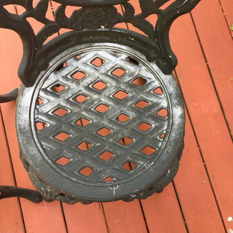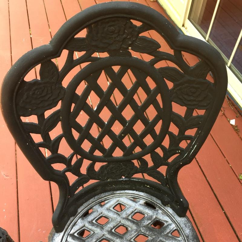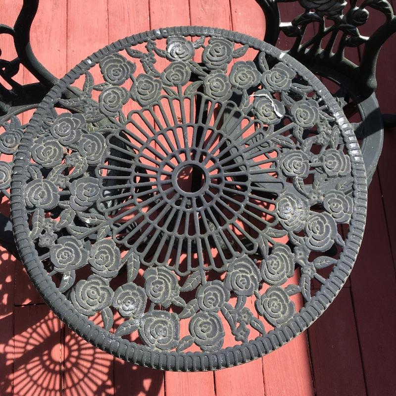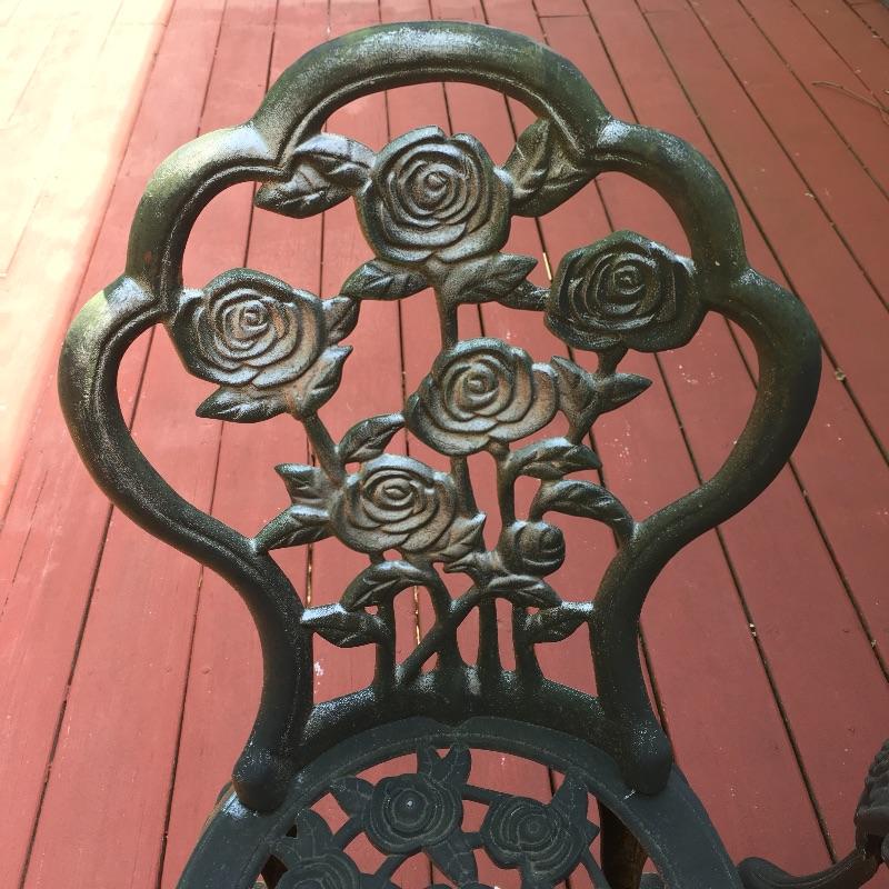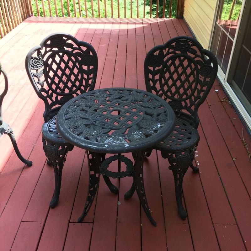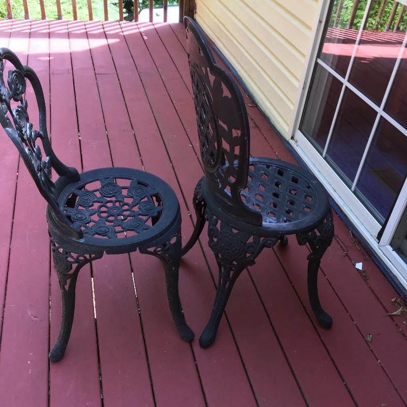 Enjoy the warm weather with these two sets of matching metal chairs and tables. Tables measure 23.5”D x 27” tall. Have a cold libation enjoying the outdoors in these cool tables and chairs. Sets could use a good clean and have some paint chipped off, a little elbow grease and they will be as good as new. While these look like cast iron, they are not very heavy. They are made of a more lightweight metal.