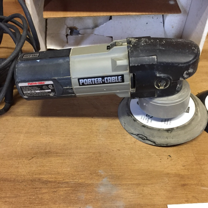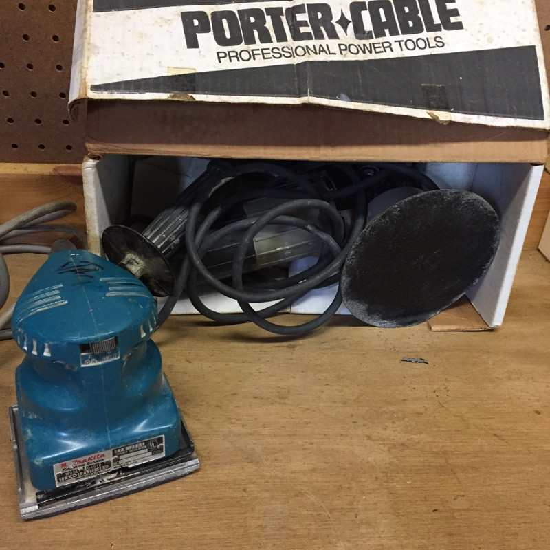 The Porter-Cable Sander comes with box and a replacement pad and has been tested and seems to work. The smaller Makita sander also powers on and seems to work.