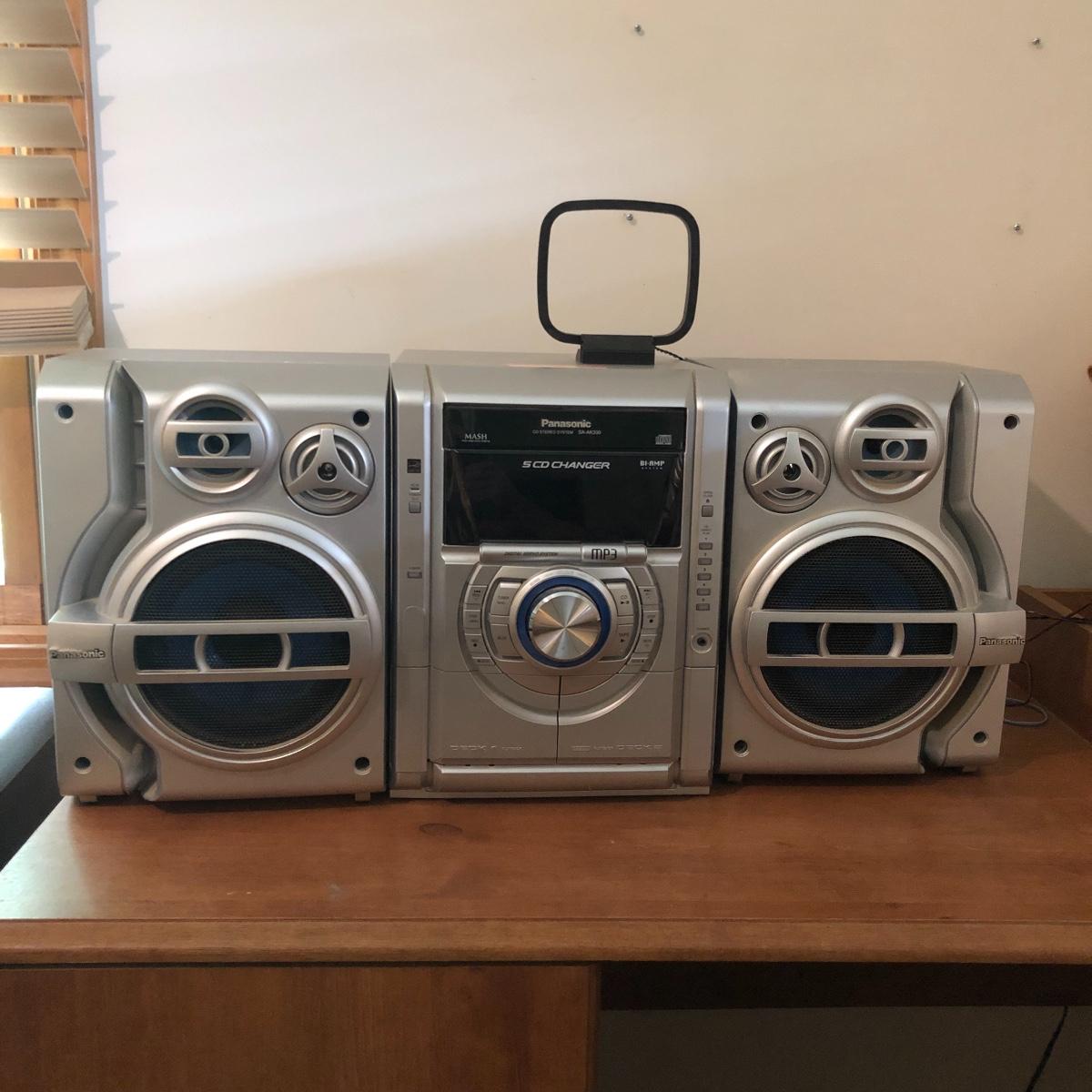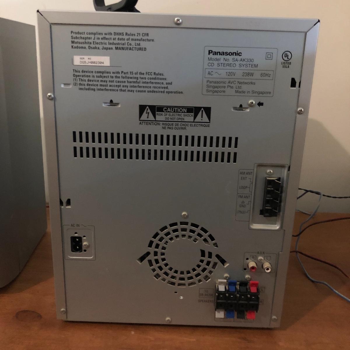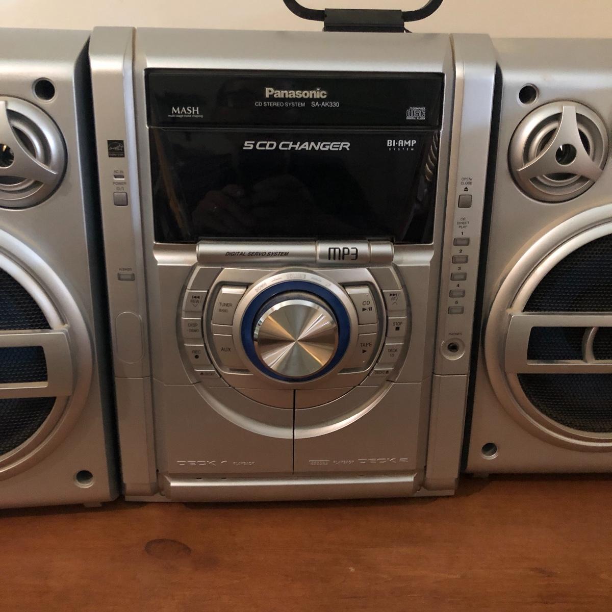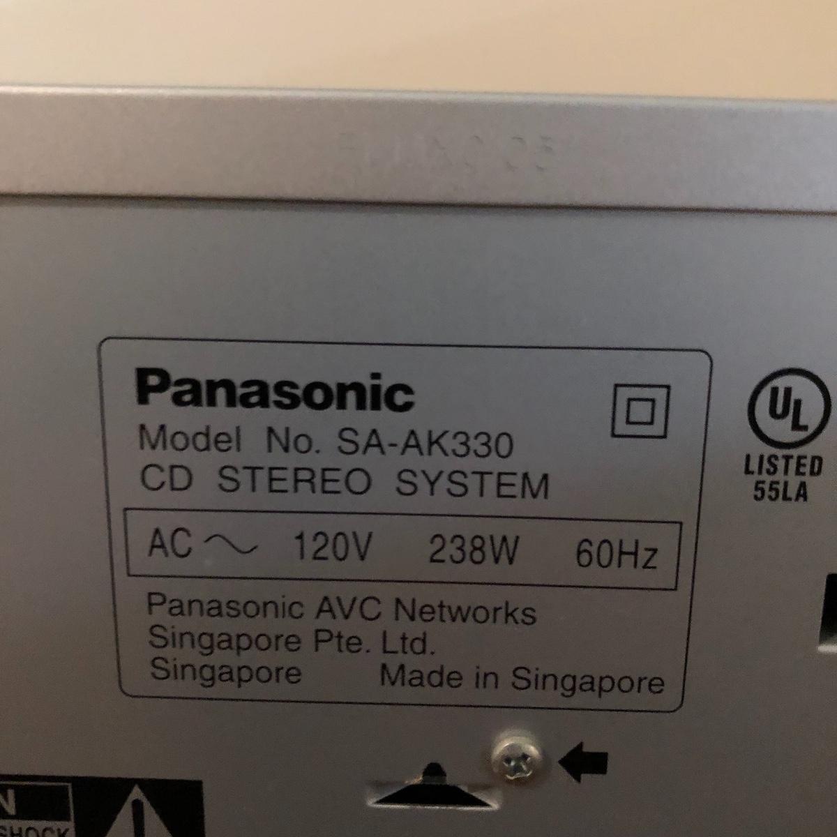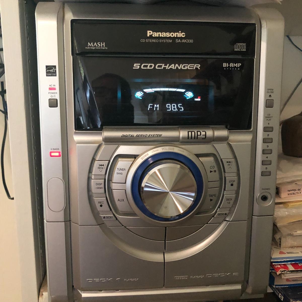 Sit back and enjoy your music with this Panasonic CD stereo system Model # SA-AK330. Stereo has two detached speakers, five CD changer, cassette deck and AM/FM tuner. Radio worked when tested. Stereo with speakers measures 12” x 29” x 13”.