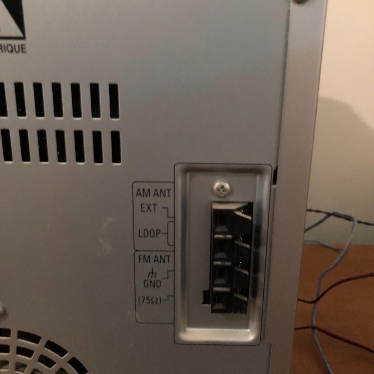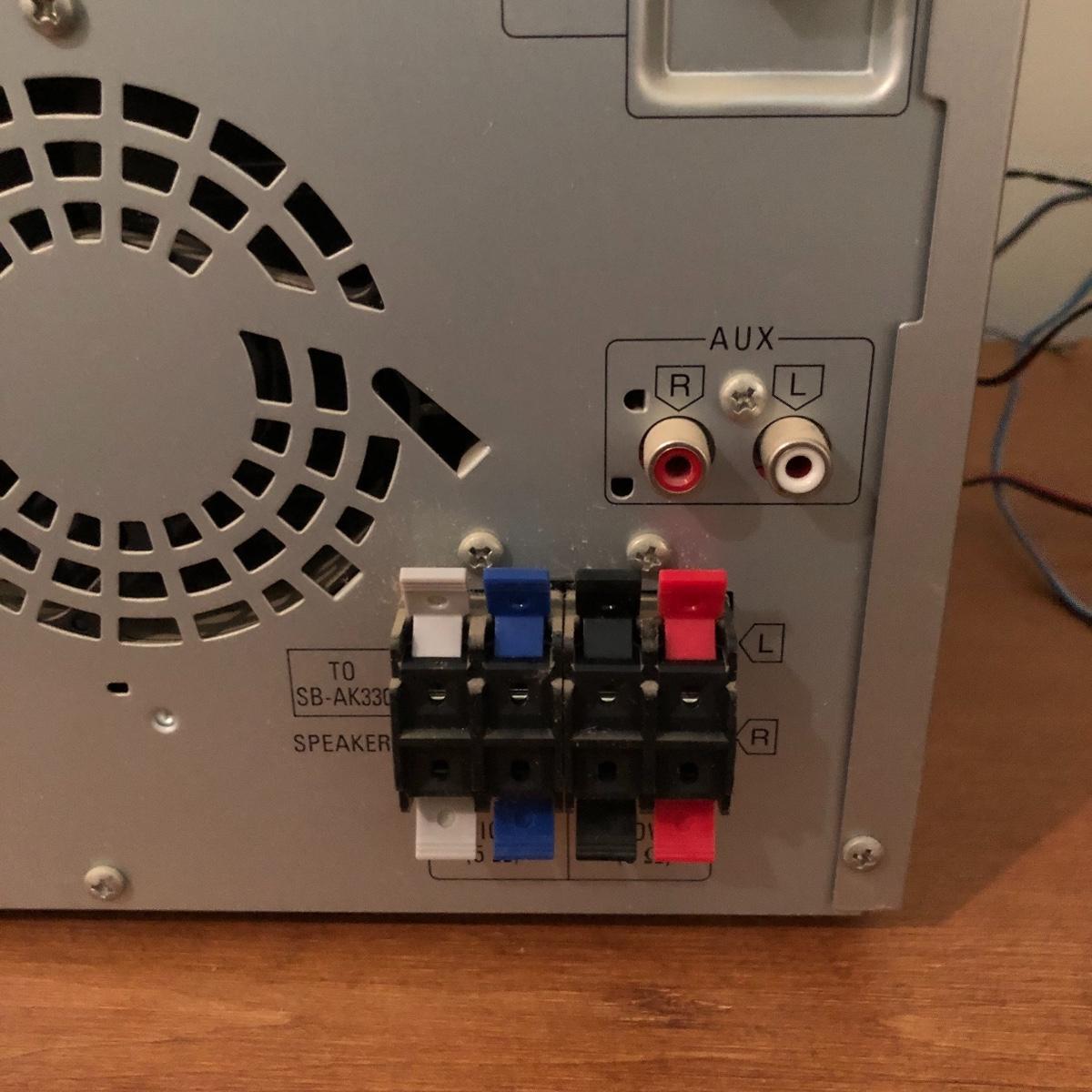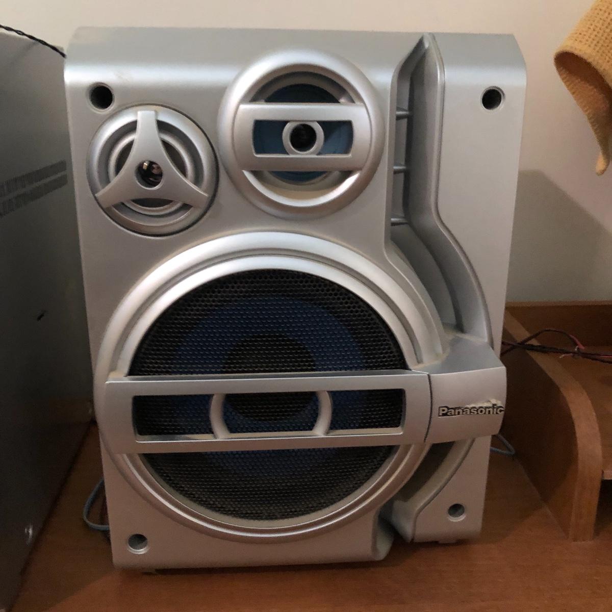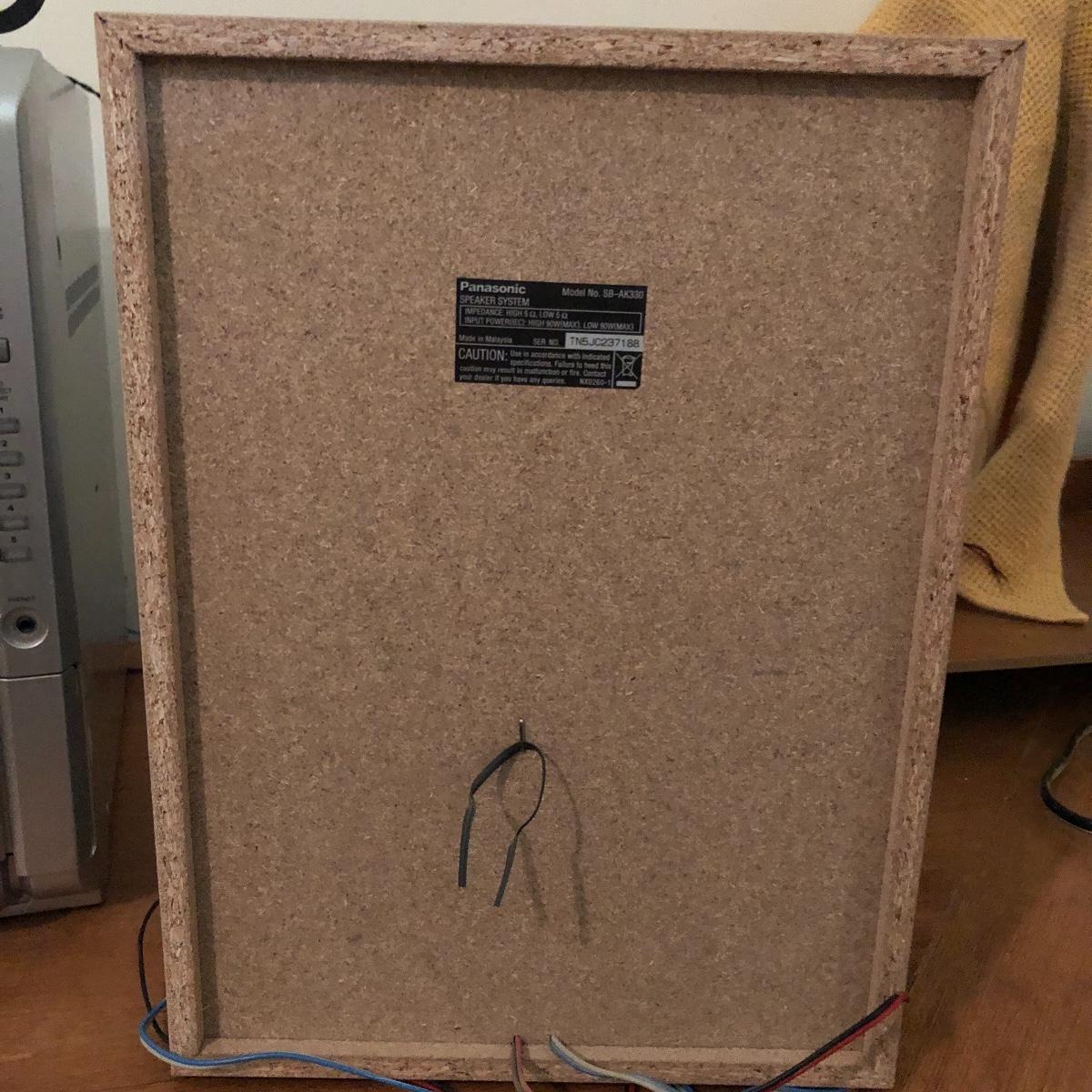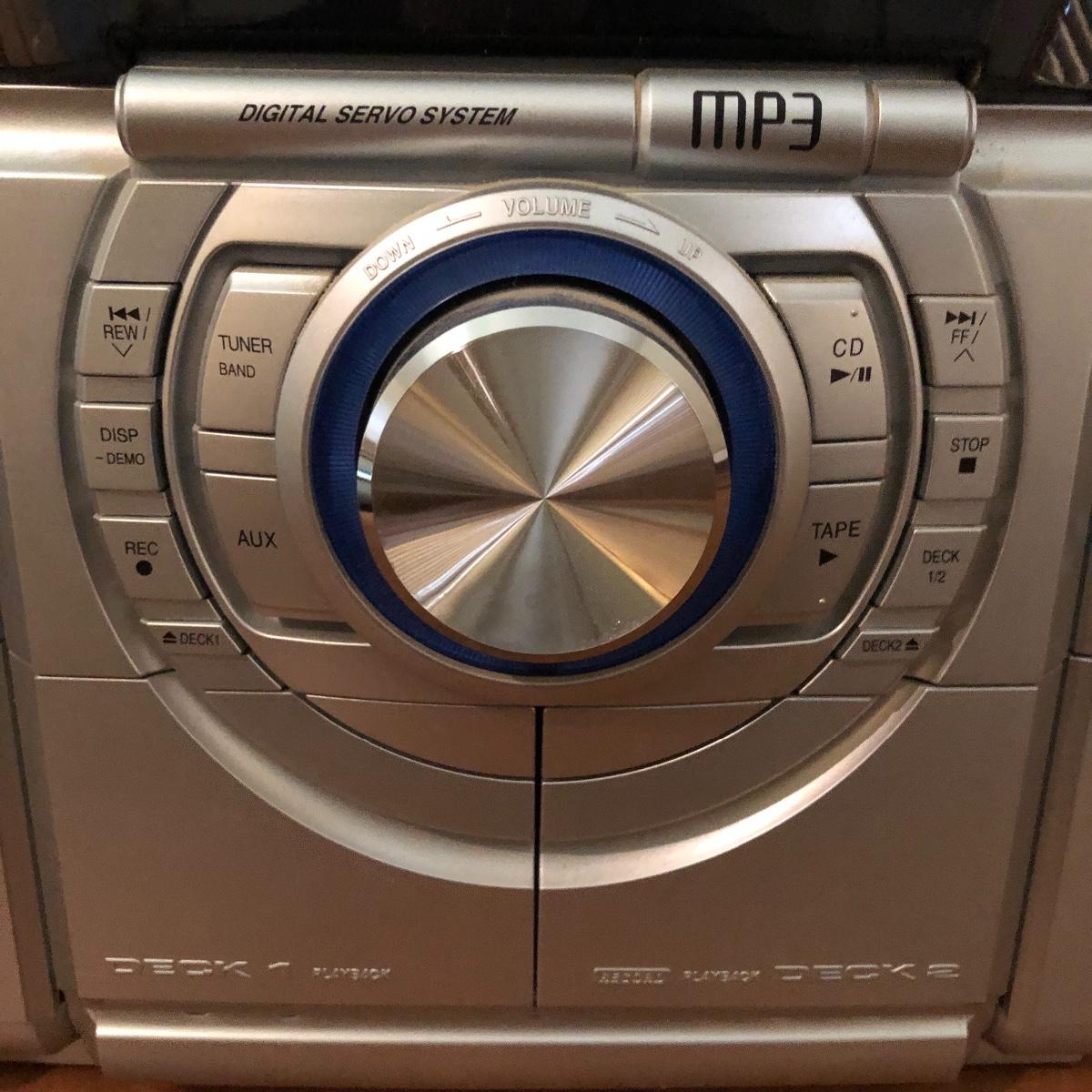 Sit back and enjoy your music with this Panasonic CD stereo system Model # SA-AK330. Stereo has two detached speakers, five CD changer, cassette deck and AM/FM tuner. Radio worked when tested. Stereo with speakers measures 12” x 29” x 13”.