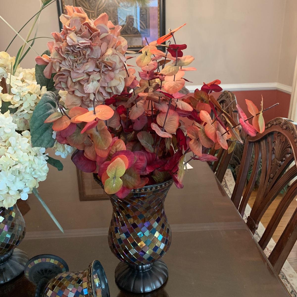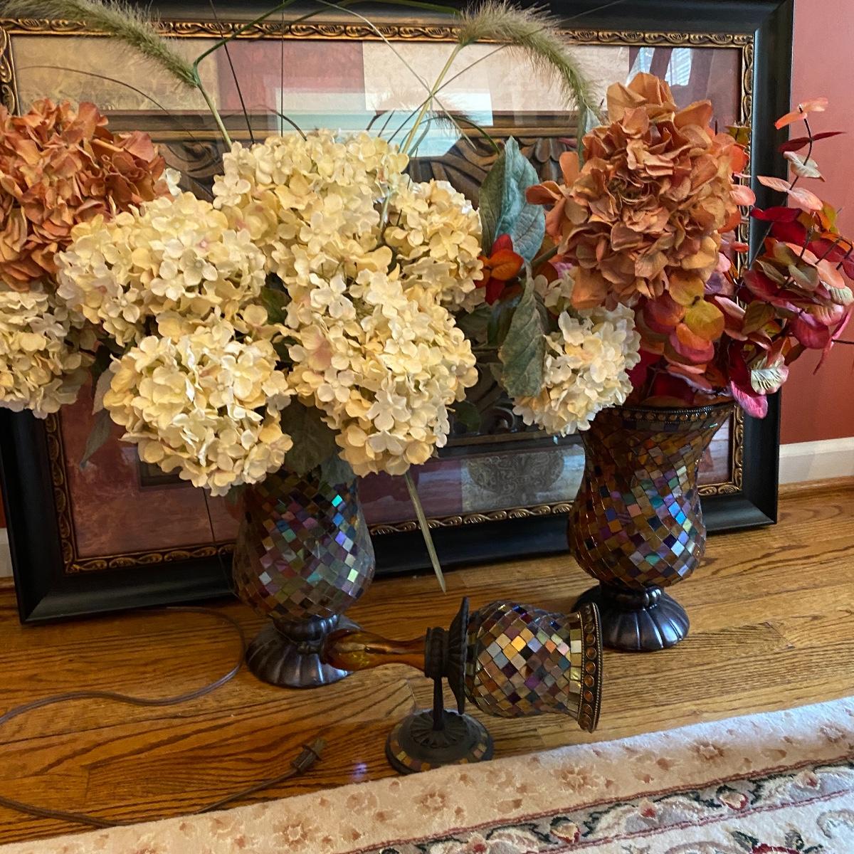 These four items match perfectly. First are two Party Lite bases w/ faux flowers. Each stands 24” tall including flowers. Next is a matching wall sconce that has a place for a candle. Last you will find a unique matted wall art with faux wood interior and a handsome frame. It measures 41” X 28”. Local pickup only.