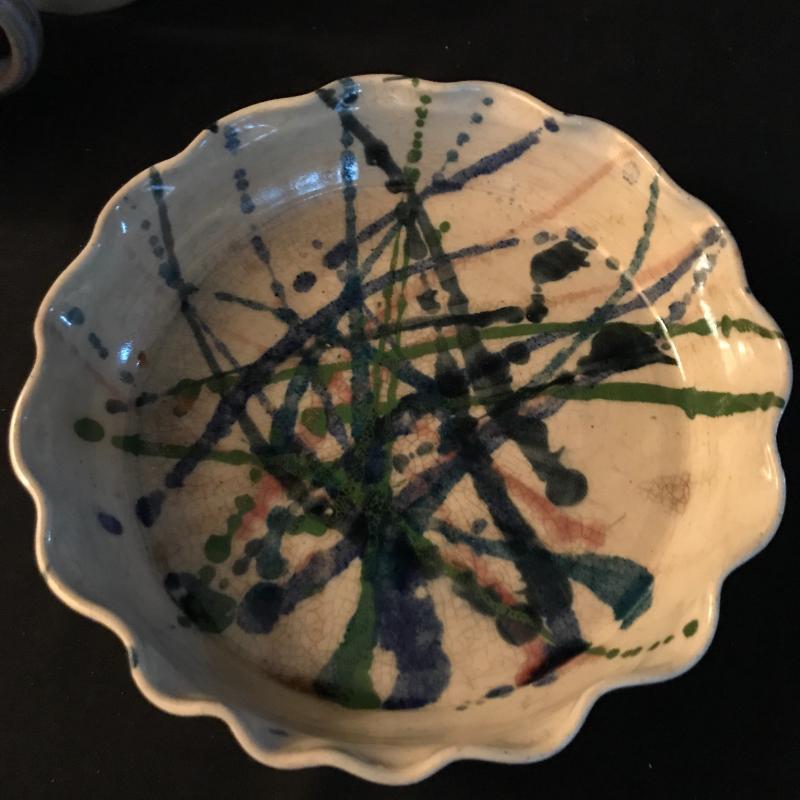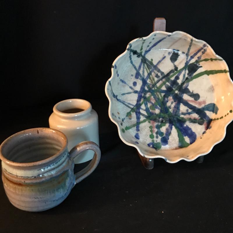 Beautiful stamped pie dish made in 2001 in Black Mountain by John Garrou. Signed Coffee mug. Jar without lid. Shipping or local pick up in Flat Rock, NC.