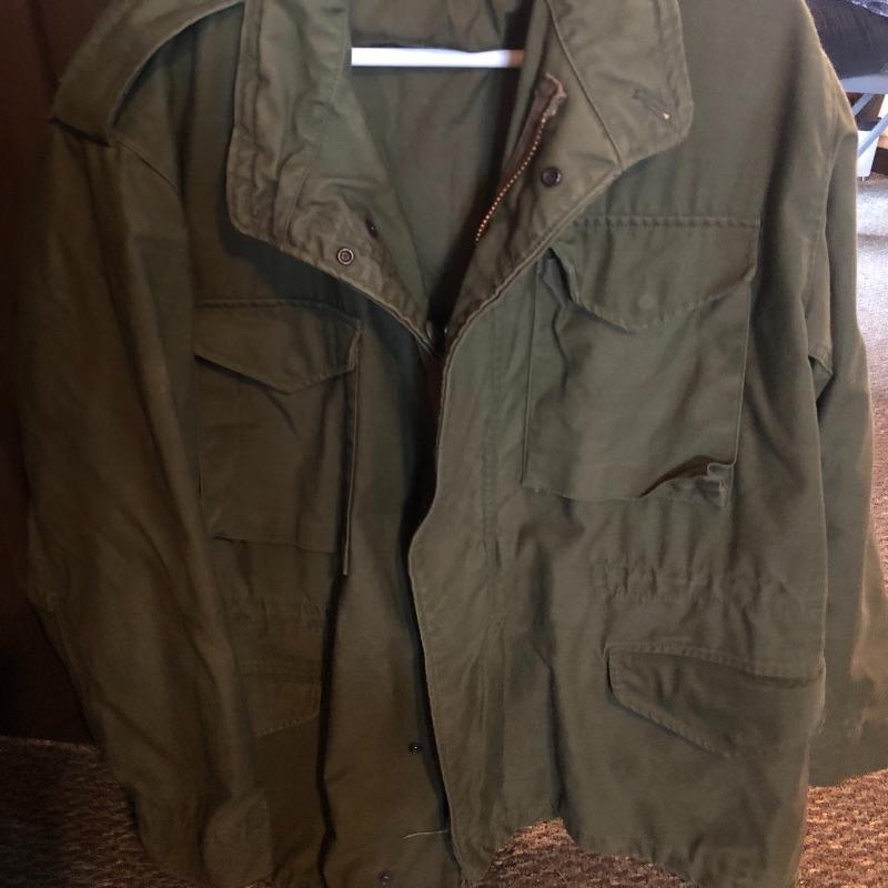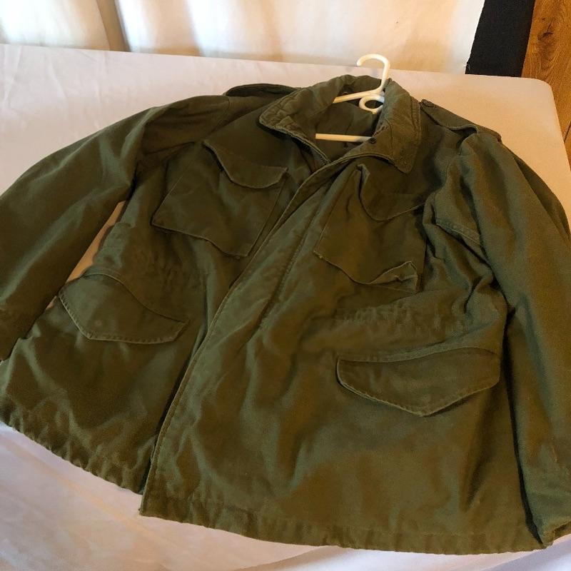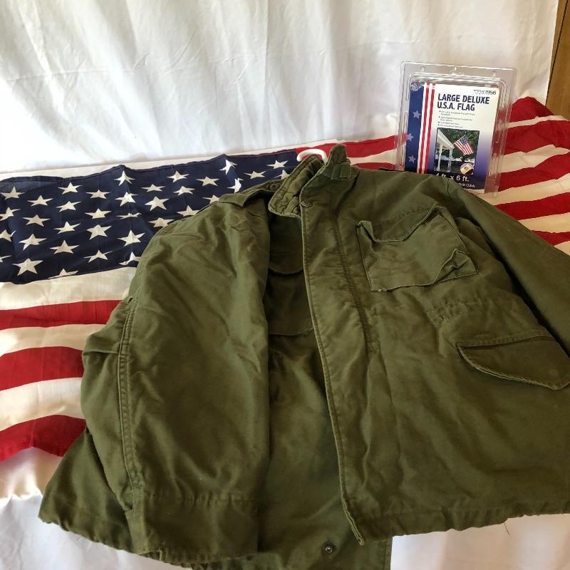 Show your patriotism with this lot! It includes two American flags and an Army OD Green field jacket. This warm jacket also has the ability to add a liner (not included). Size is a large regular. Hooah! Shipping available.
