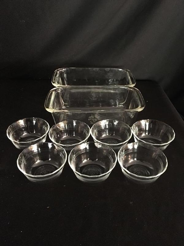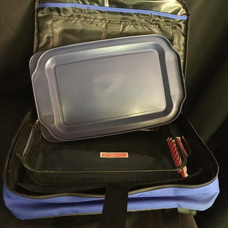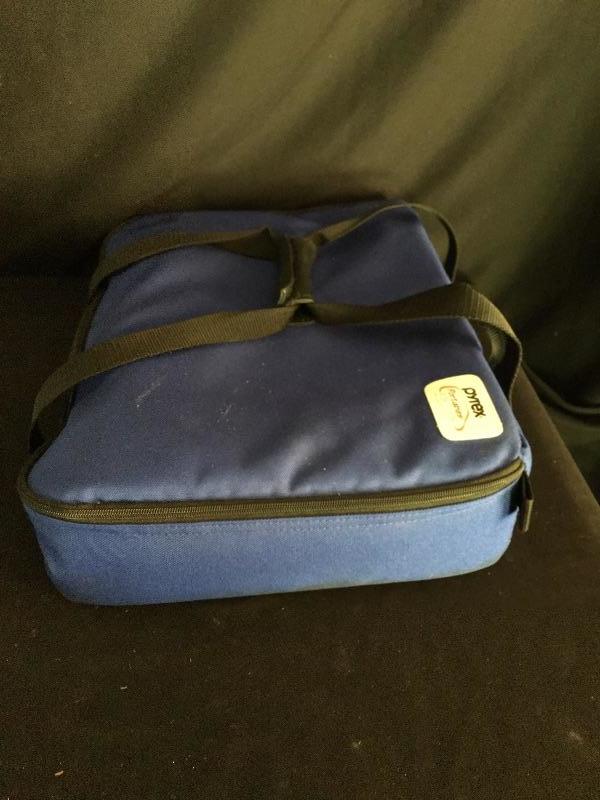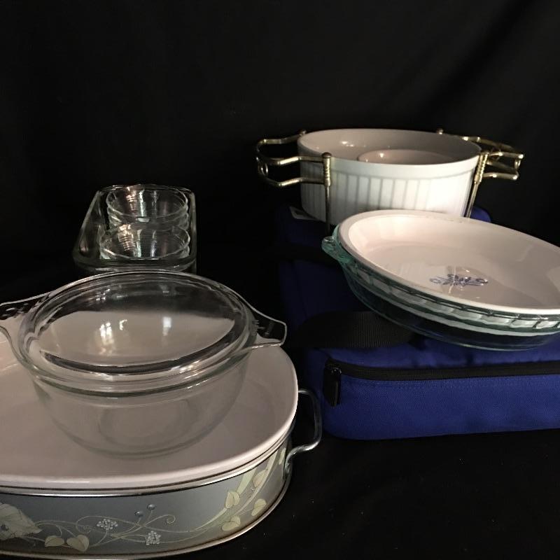 Pyrex and Corning Ware. Lot includes Pyrex bread dishes, small bowls, pie plate, insulated carrier with casserole dish, Corning Ware pie plate, casserole dish and more. Great selection of cook Ware. Insulated carrier measures 12” x 16” x 3.25”.