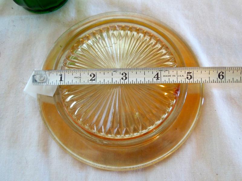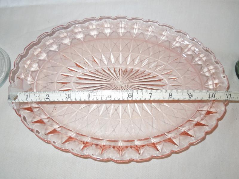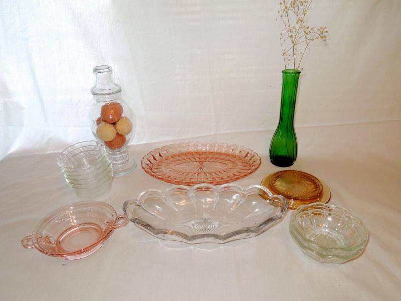 A small orange carnival glass coaster, two pink depression glass serving trays, a scalloped clear servinf dish, an apothecary covered jar filled with molded hand soaps, a green vase and 8 ramekins of which 5 are matching and 3 others match but are larger.