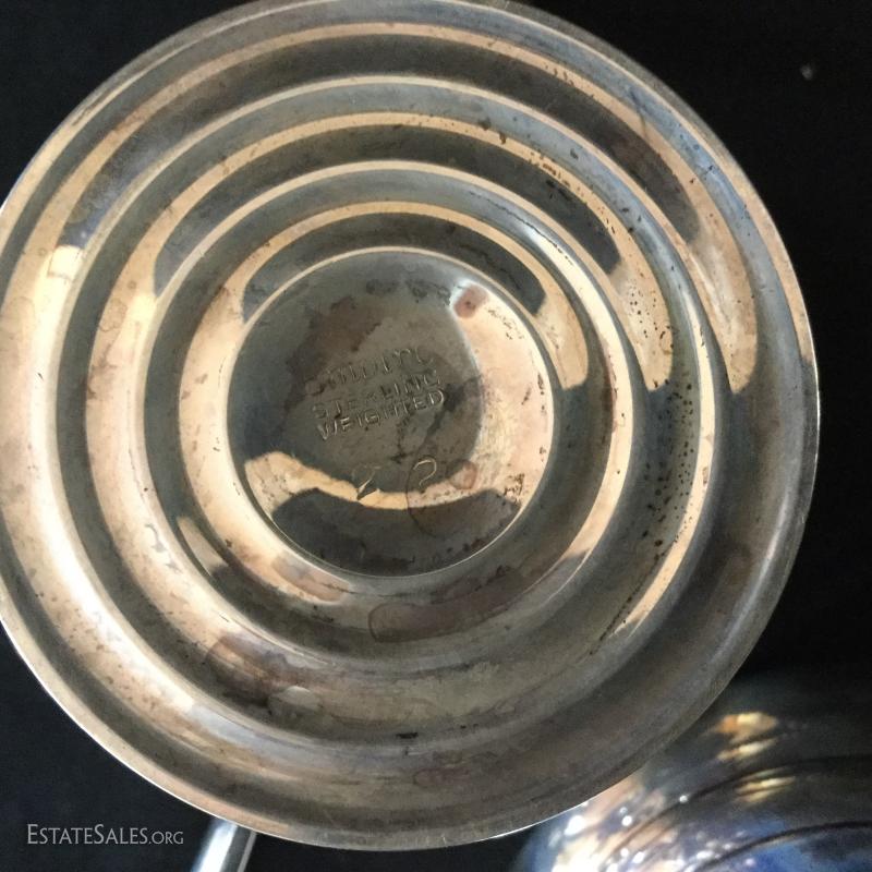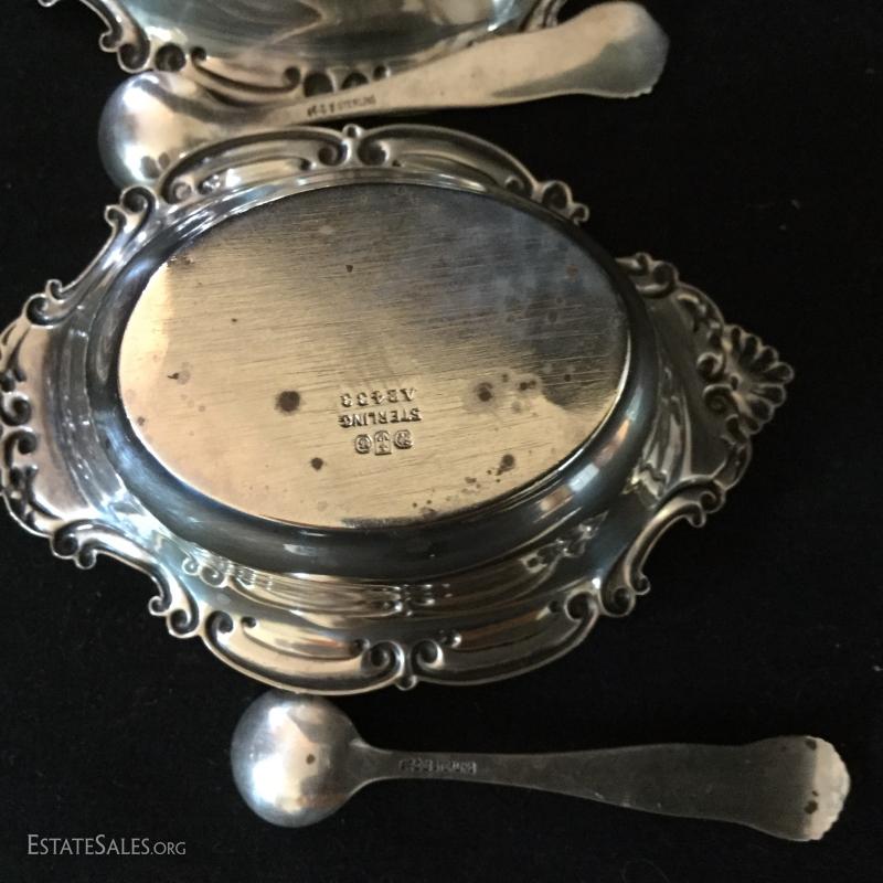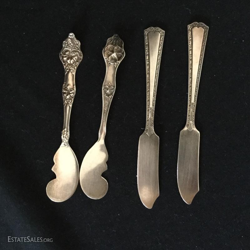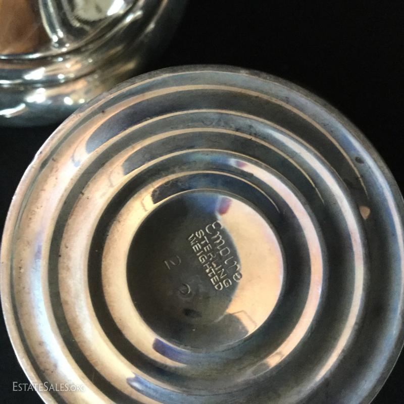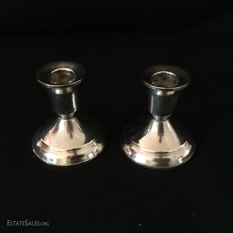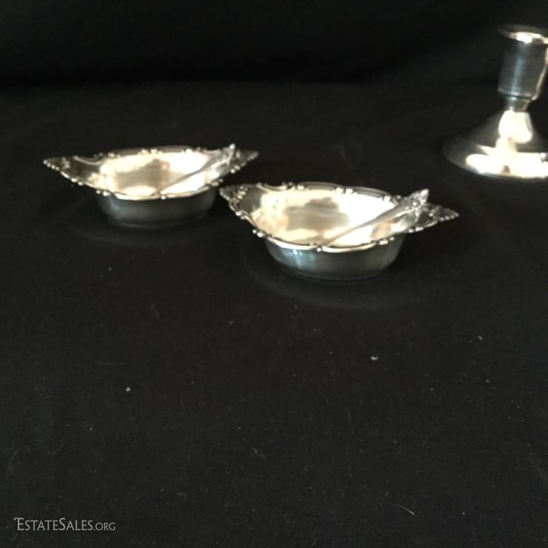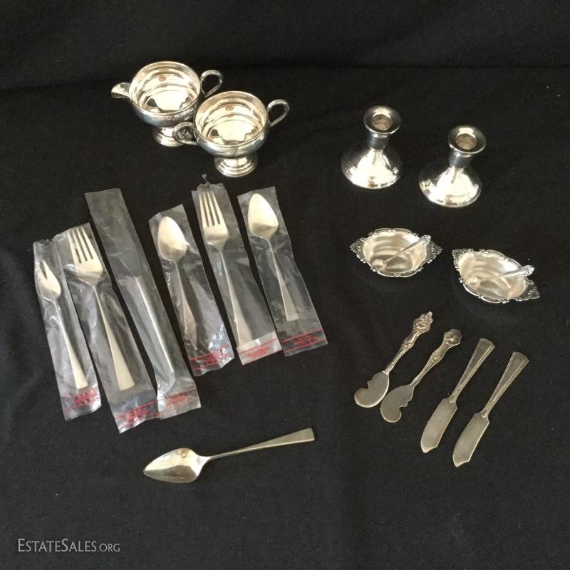 Two cups, two candlesticks and two salt dishes with spoons. Some misc. silverware. All marked Sterling. See photos for marks.