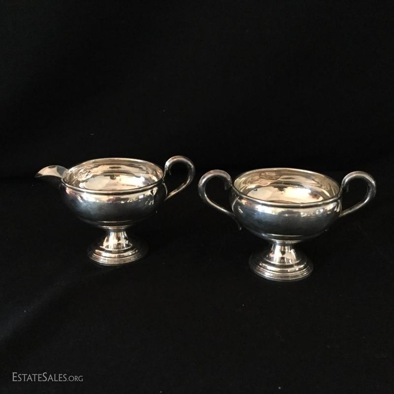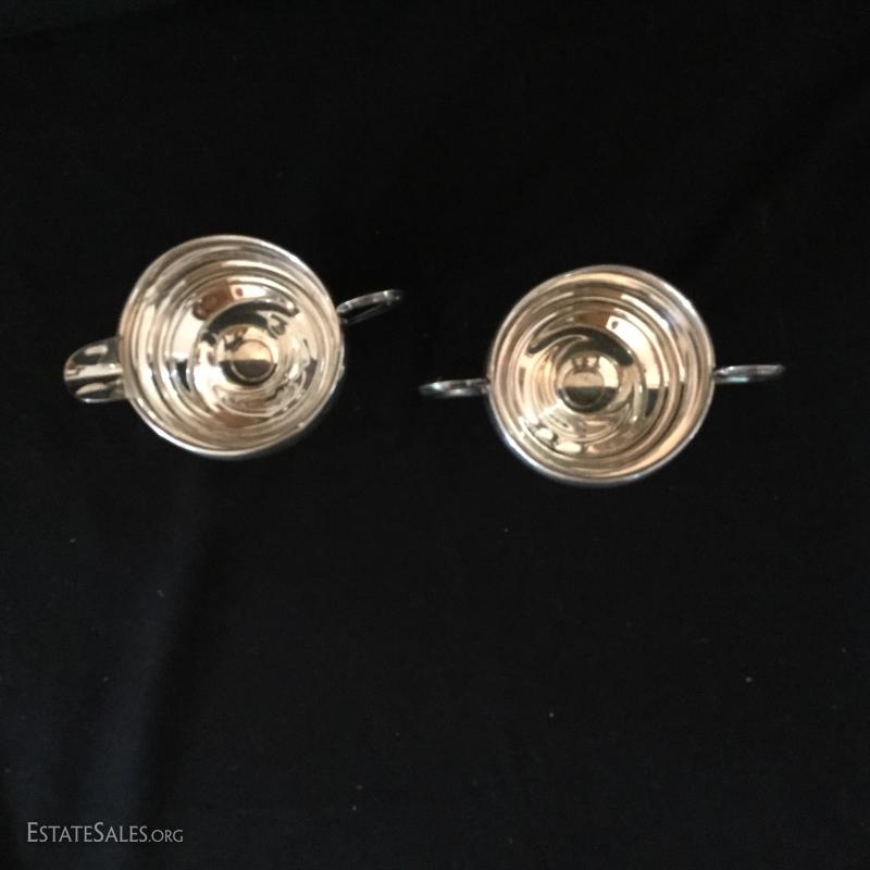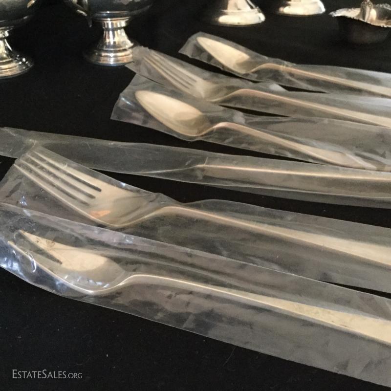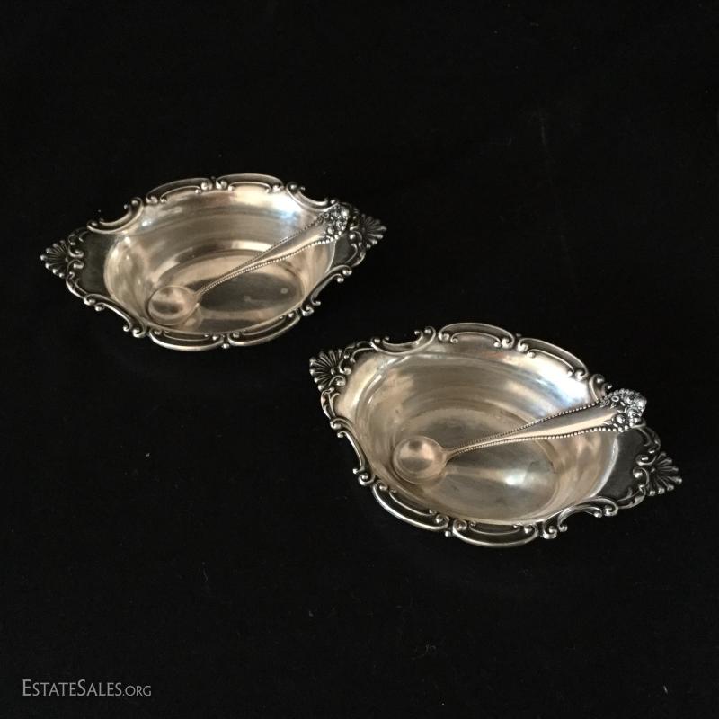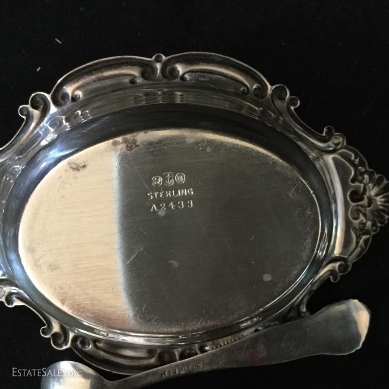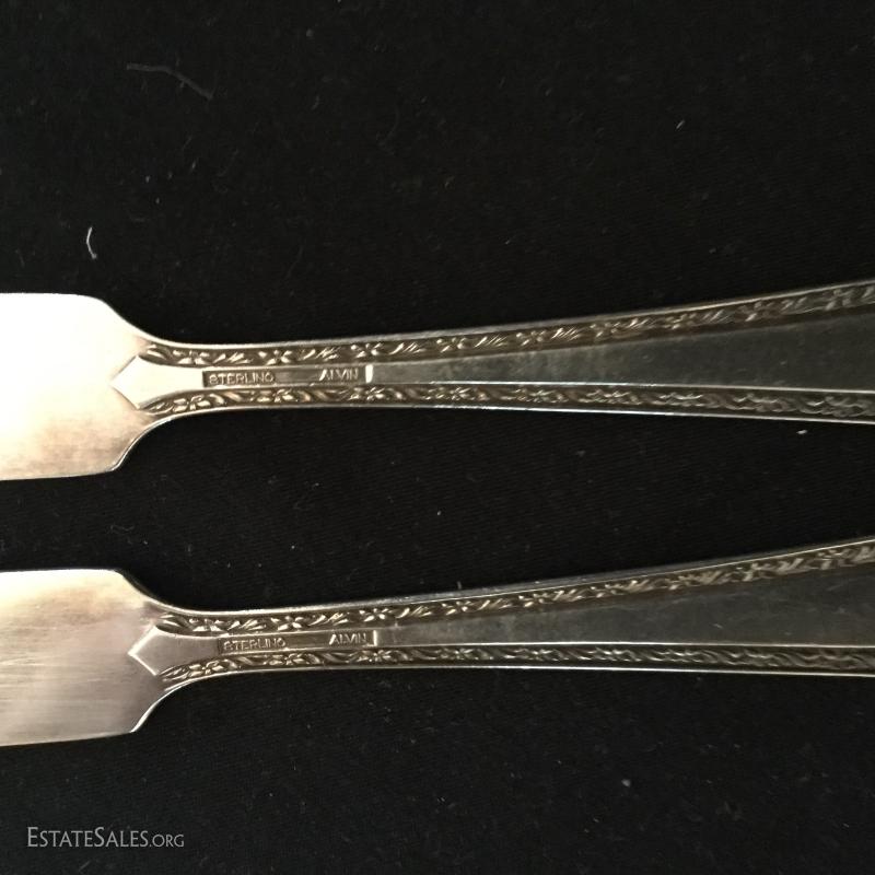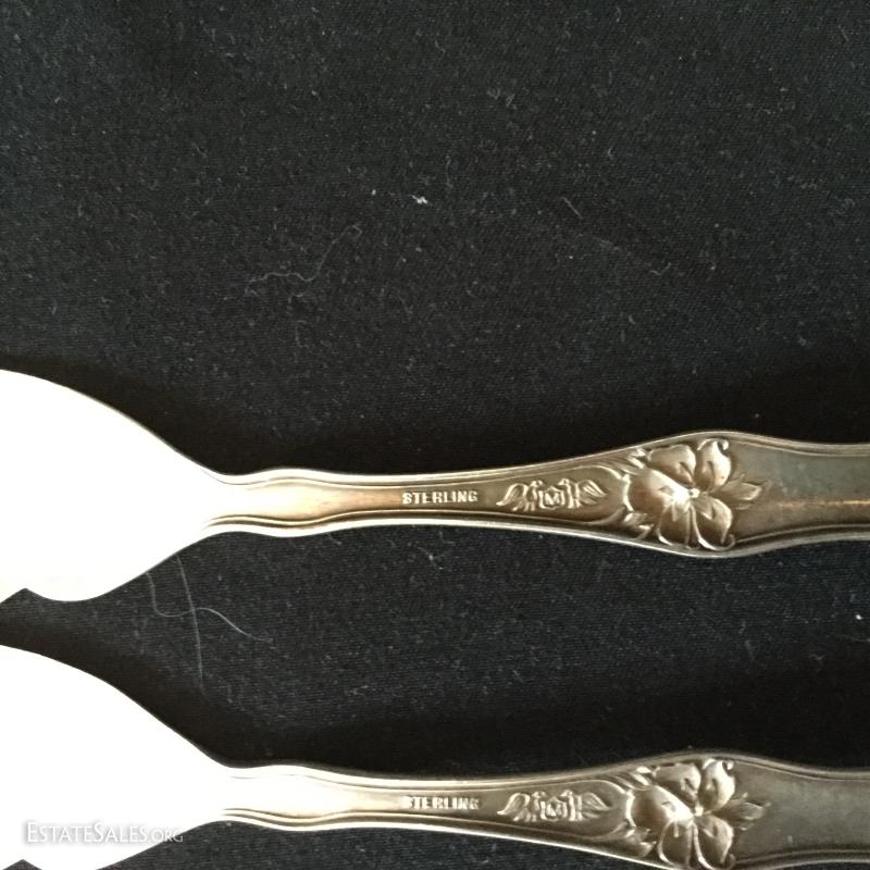 Two cups, two candlesticks and two salt dishes with spoons. Some misc. silverware. All marked Sterling. See photos for marks.