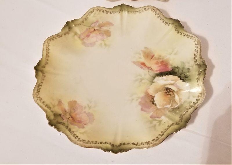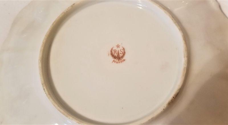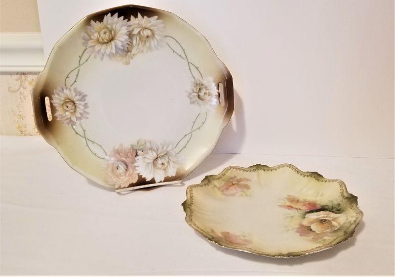 Pretty handled porcelain sandwich tray, marked "Silesia", ca. 1900, measures 10.5" across. Crimped painted plant - floral design, marked RS Prussia, ca. 1890. Both in good antique condition.