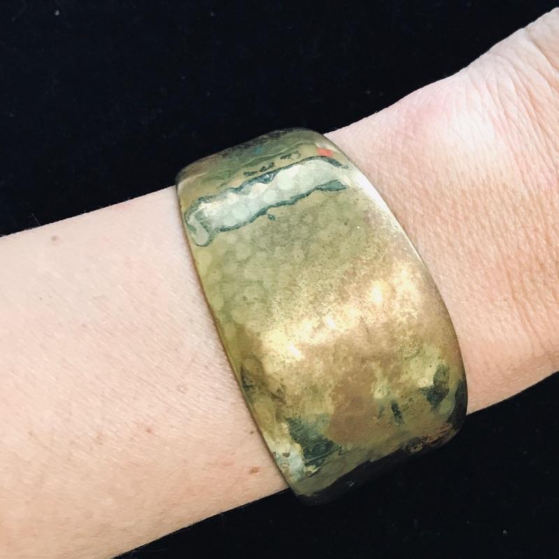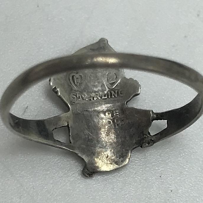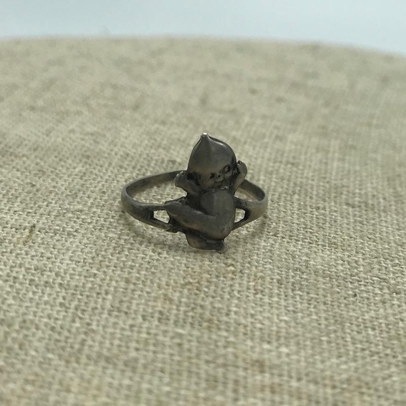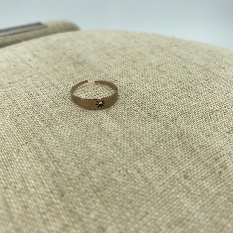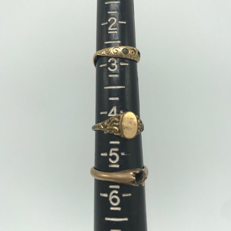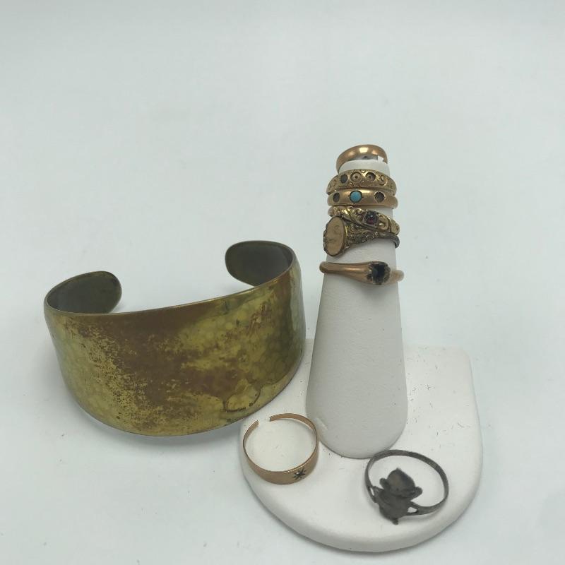 Adorable and classic little collection of vintage rings and brass like cuff bracelet for a small wrist. All known markings are shown in photos. One piece is sterling. The smallest ring is .5” in diameter and doesn’t fit on the ring sizer.