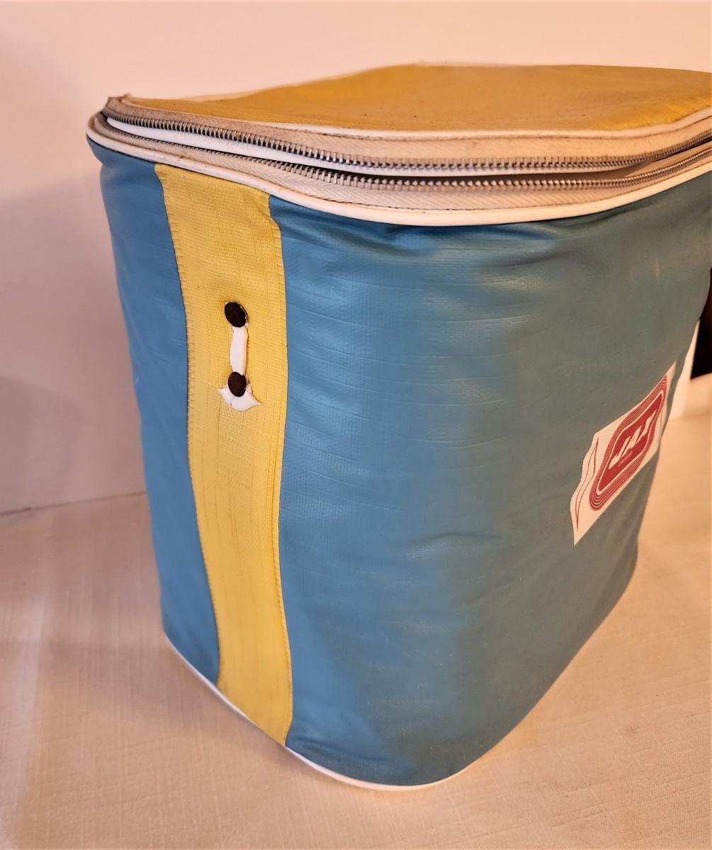 Vintage JAX beer soft side cooler, zipper works fine, plastic handles broken off as shown. 10.5" tall, 11" across, plastic liner good.