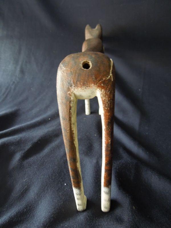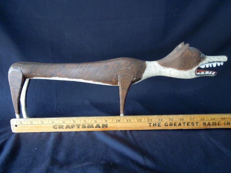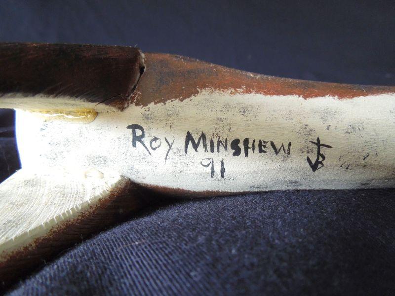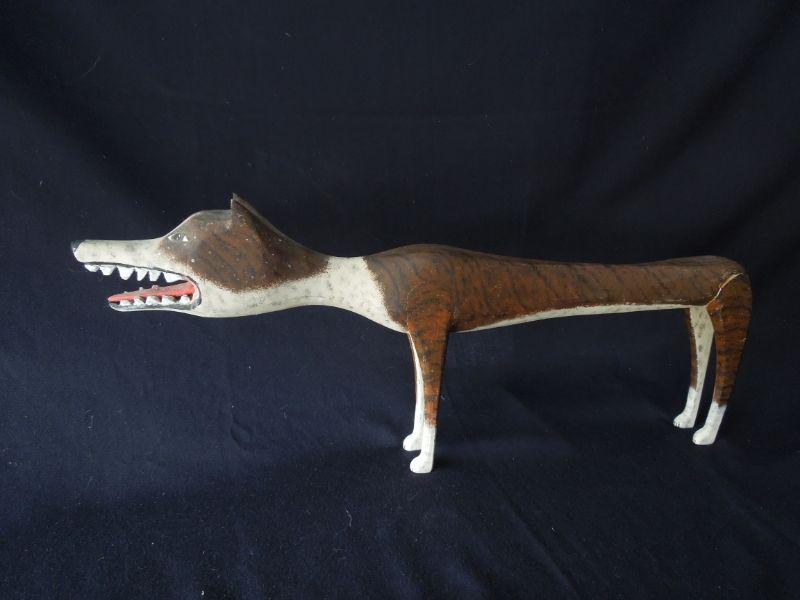 Elongated painted wood dog. 19" L x 8" H. Signed "Roy Minshew '91". Tail is missing and back hip has been reglued. Stands alone on all legs.