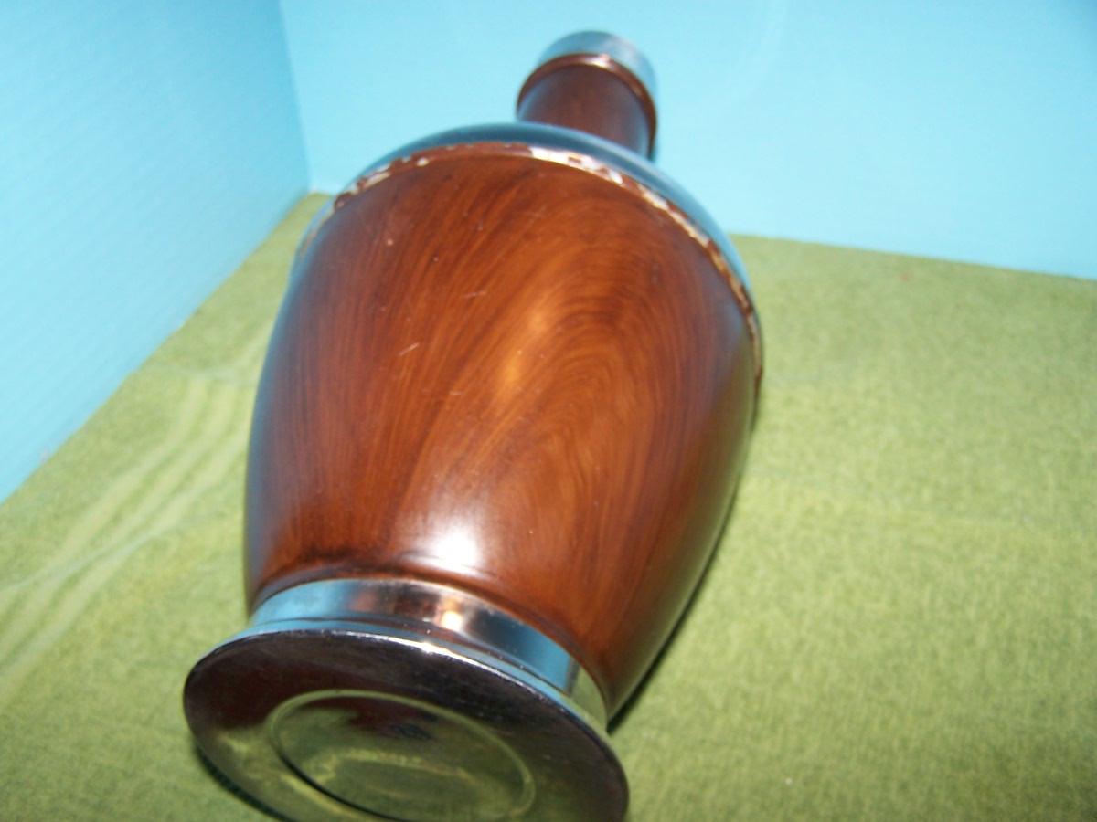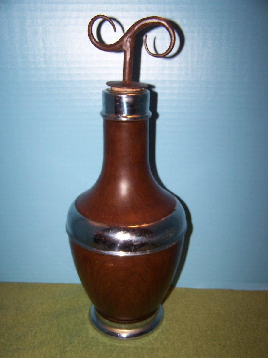 THIS IS A WONDERFUL MID-CENTURY STANLEY THERMOS WINE DECANTER---COOLER.... IT IS 14 3/4'' TALL... IT IS HEAVY... THE BROWN WOOD LOOK CAN PROBABLY BE STRIPPED OFF, TO THE CHROME... THERE IS SOME BROWN FLAKING, SOME SCRATCHES, AND SMALL DENTS....GREAT LOOKING!!!