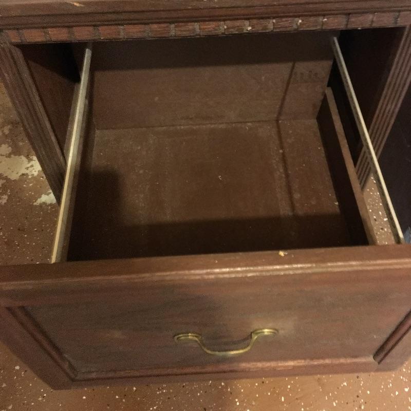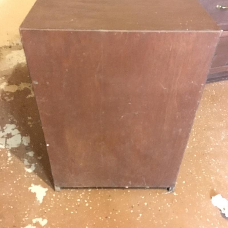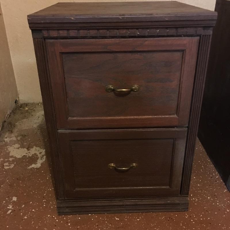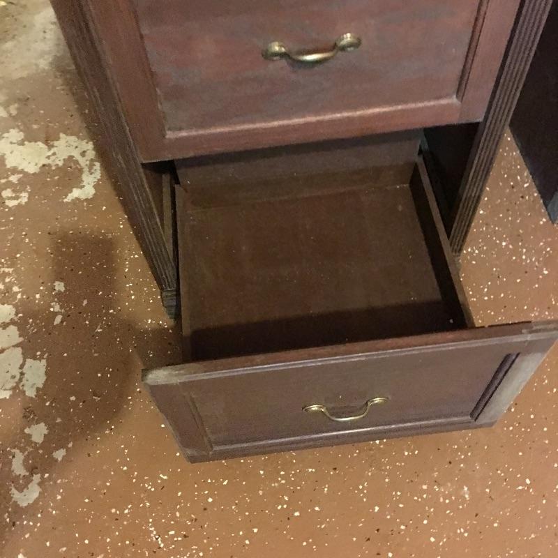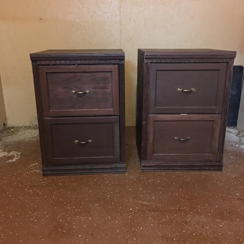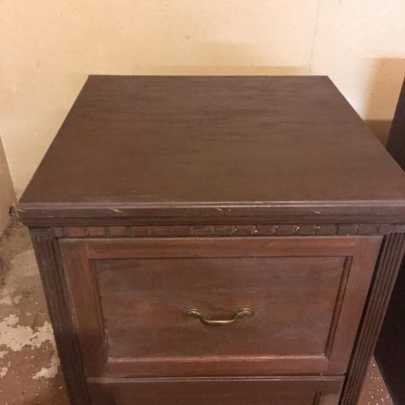 Dark wooden file cabinets. This pair of file cabinets will add style and elegance to any room they are in. Cabinets will need a good cleaning, but look like they will clean up great.