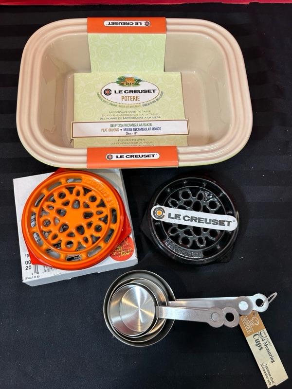Le Creuset baker, bottle trivets, measuring cups