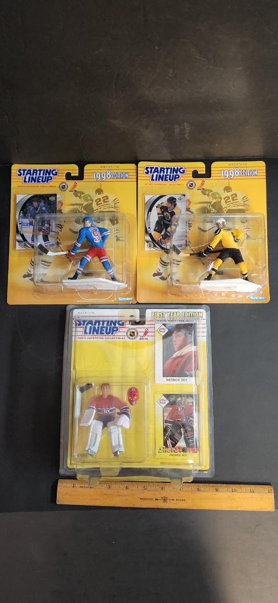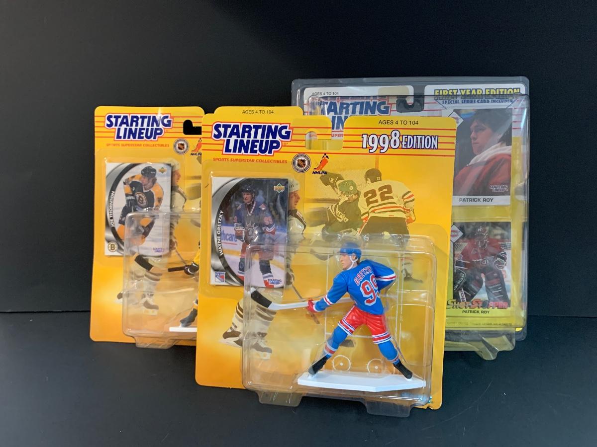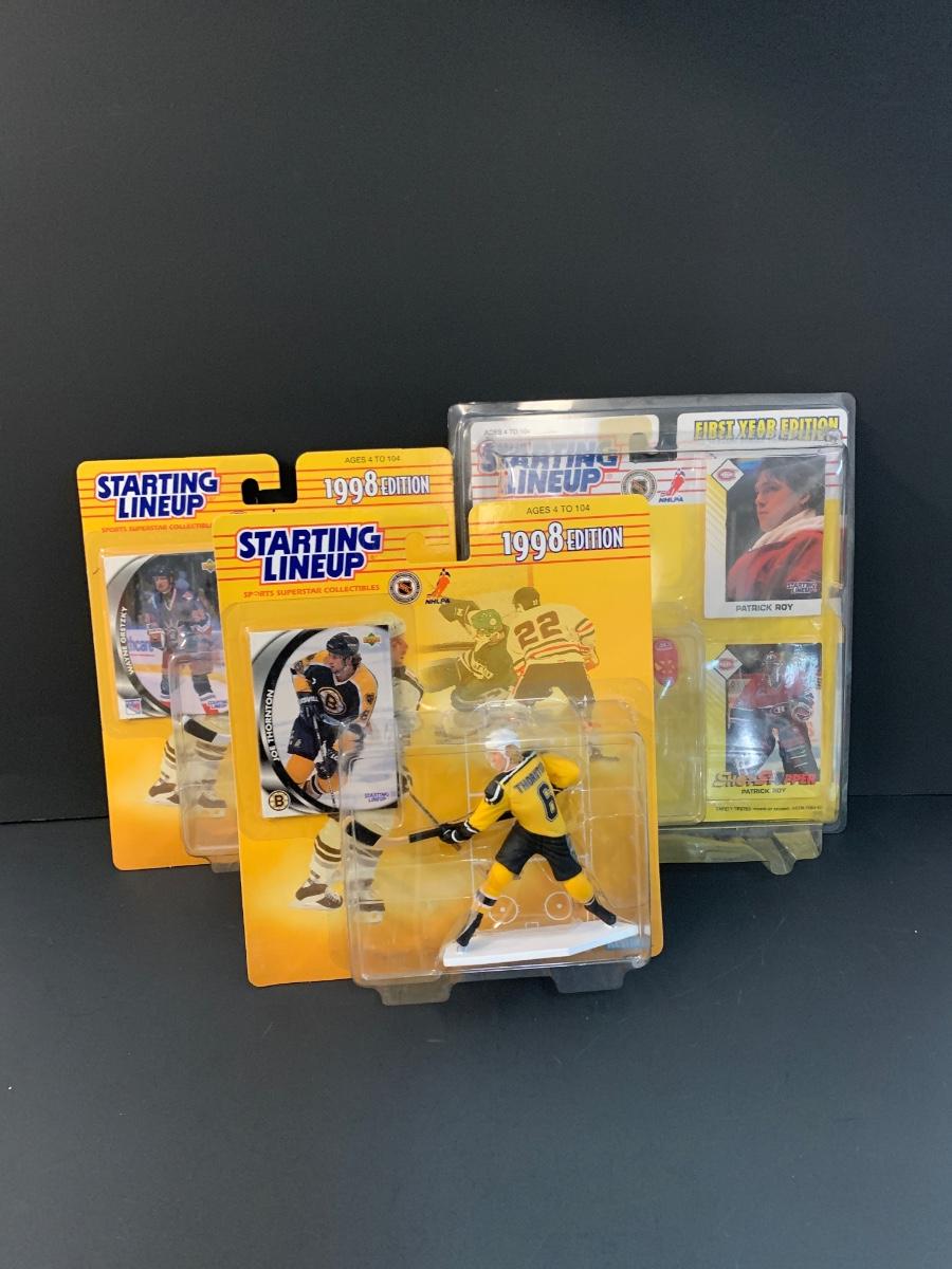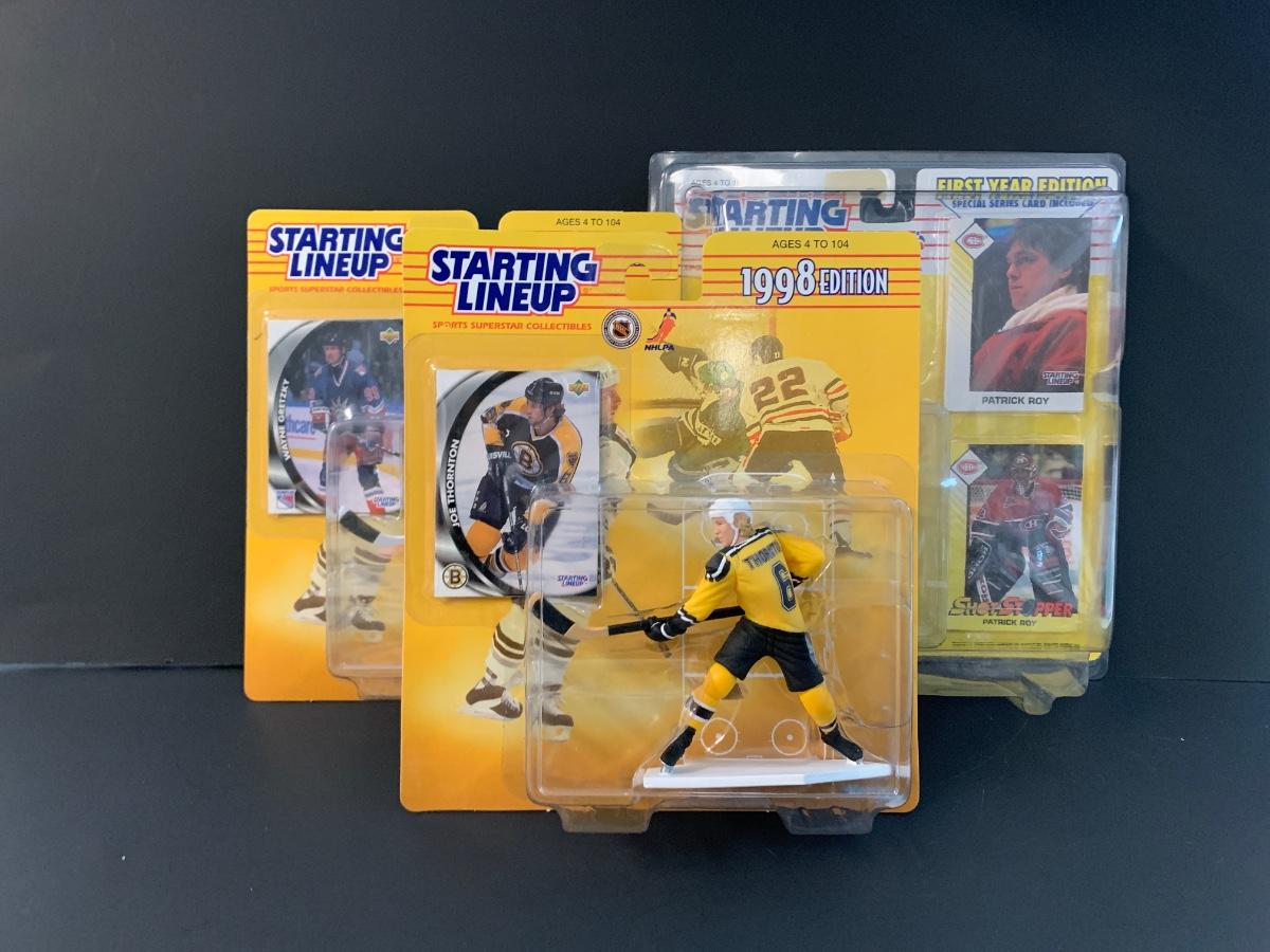 LOT 11J: Vintage Starting Line-up NHL Figures: Patrick Roy, Ed. Joe Thornton, Wayne Gretzky