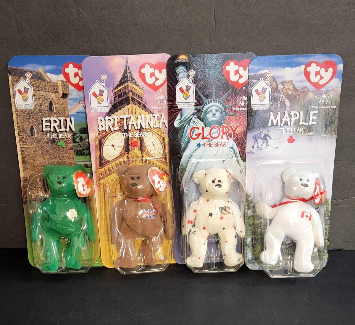 Collection of four vintage retired beanie babies are in their original packaging. You are getting: Glory, Britannia, Erin, and Maple. Approx. 5" tall. Shows some signs of age and there is slight discoloration on plastic casing. Please see all pictures as they are the best representation of the items. The pictures show condition, measurements if taken, and what is included in the lot. Due to the large amount that we photograph and the time frame, we are not always able to take measurements. All items unless noted, are pre-owned and have been used. If you purchased furniture, you must bring help. We do not allow one person to carry large furniture out on their own. Bring help, tools and a truck for the safety of our client’s homes, and your personal safety. Any damages that result to the property including walls, and floors due to moving of the furniture will be charged to the buyer. Company policy. Thank you.