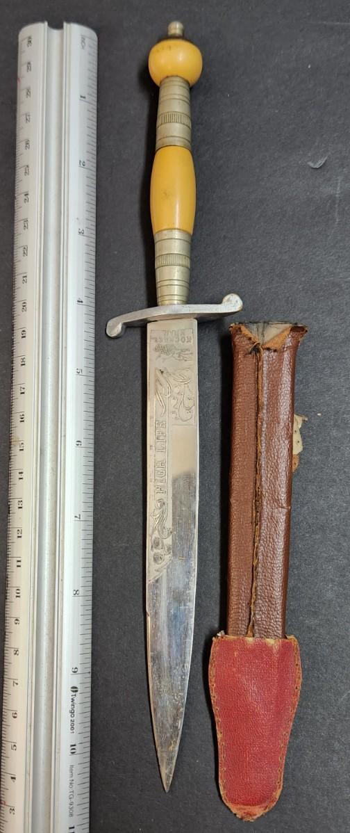 This is a early 1900's German boot dagger. The piece is in overall great condition and has amazing hand carved detail on the blade featuring "High Life", the maker, and beautiful Art Nouveau flowers. There is a small bit of tarnish on the handle (pictured). Blade doesn't appear to have any tarnish and very little wear. Please see all pictures as they are the best representation of the items. The pictures show condition, measurements if taken, and what is included in the lot. Due to the large amount that we photograph and the time frame, we are not always able to take measurements. All items unless noted, are pre-owned and have been used. If you purchased furniture, you must bring help. We do not allow one person to carry large furniture out on their own. Bring help, tools and a truck for the safety of our client’s homes, and your personal safety. Any damages that result to the property including walls, and floors due to moving of the furniture will be charged to the buyer. Company policy. Thank you.