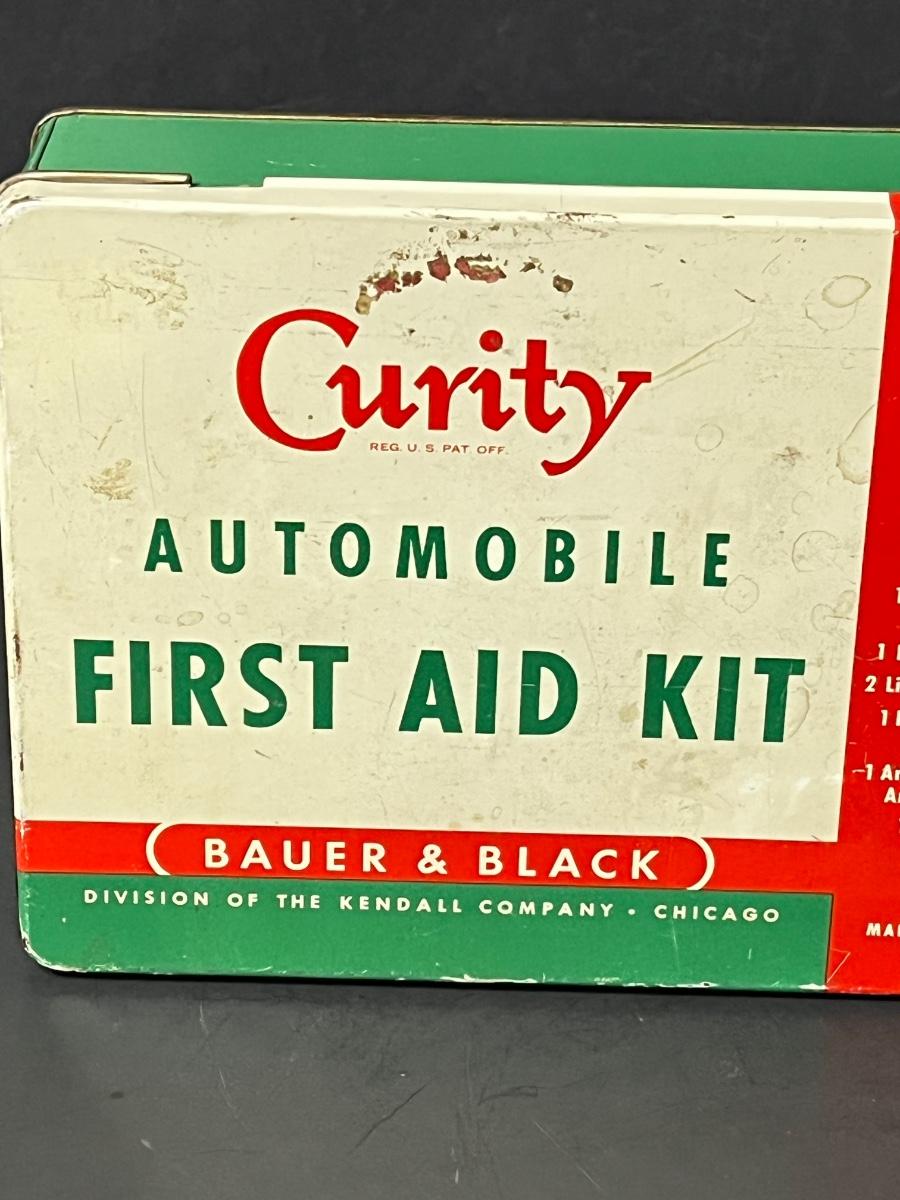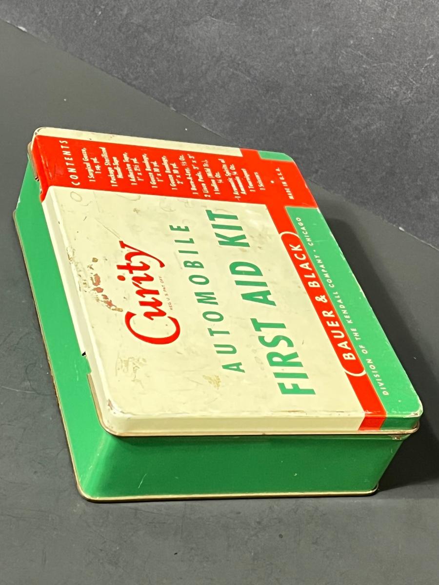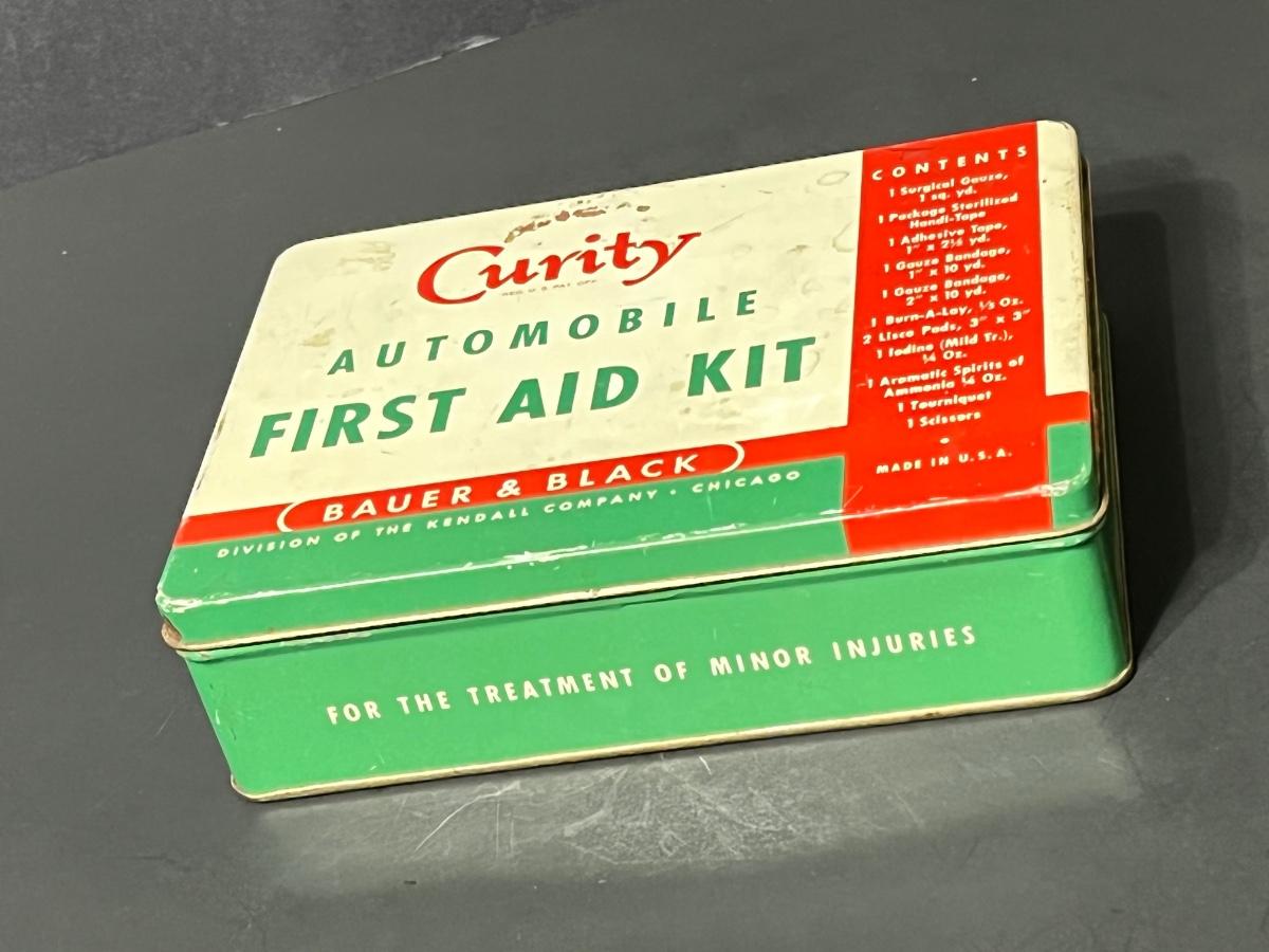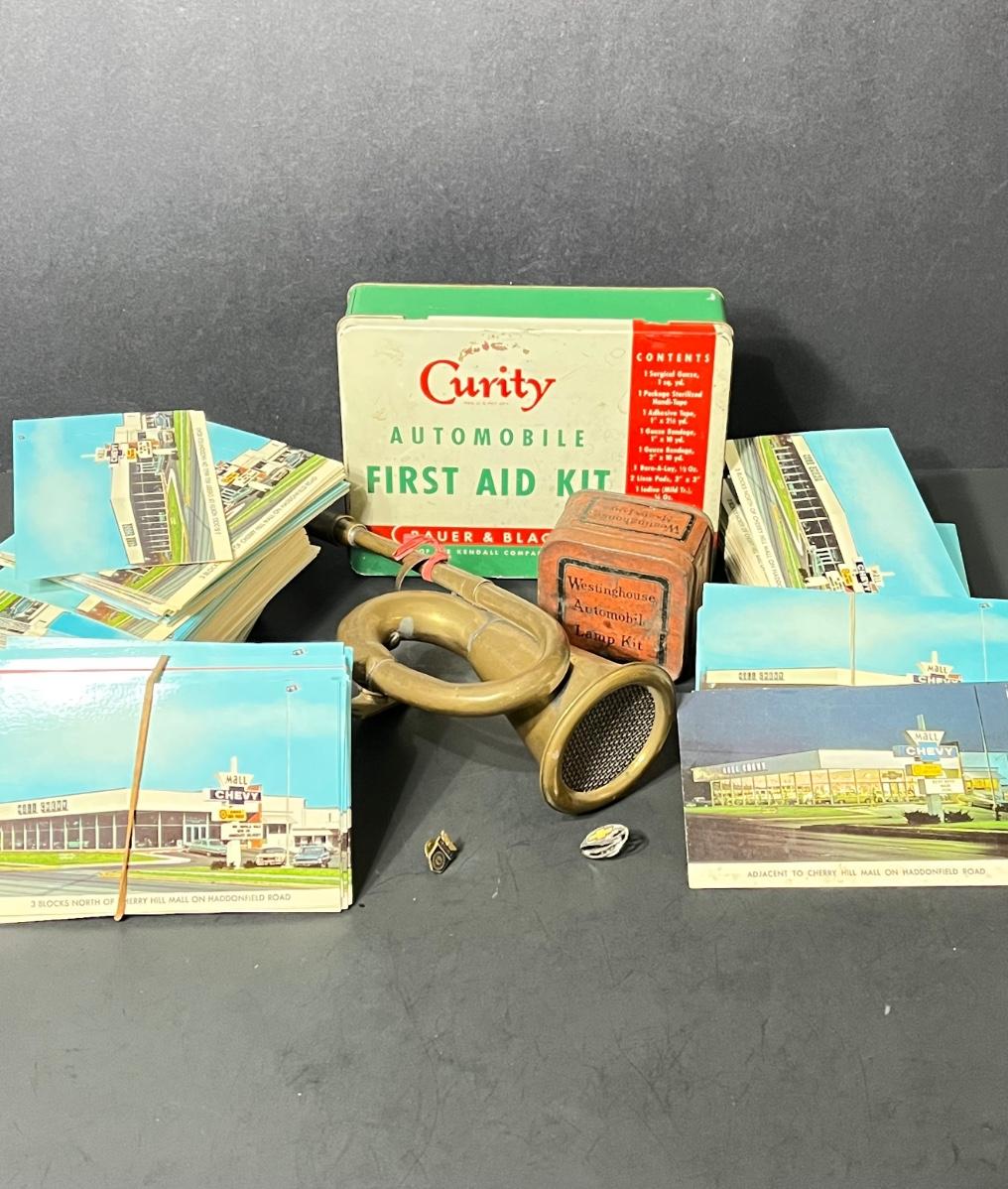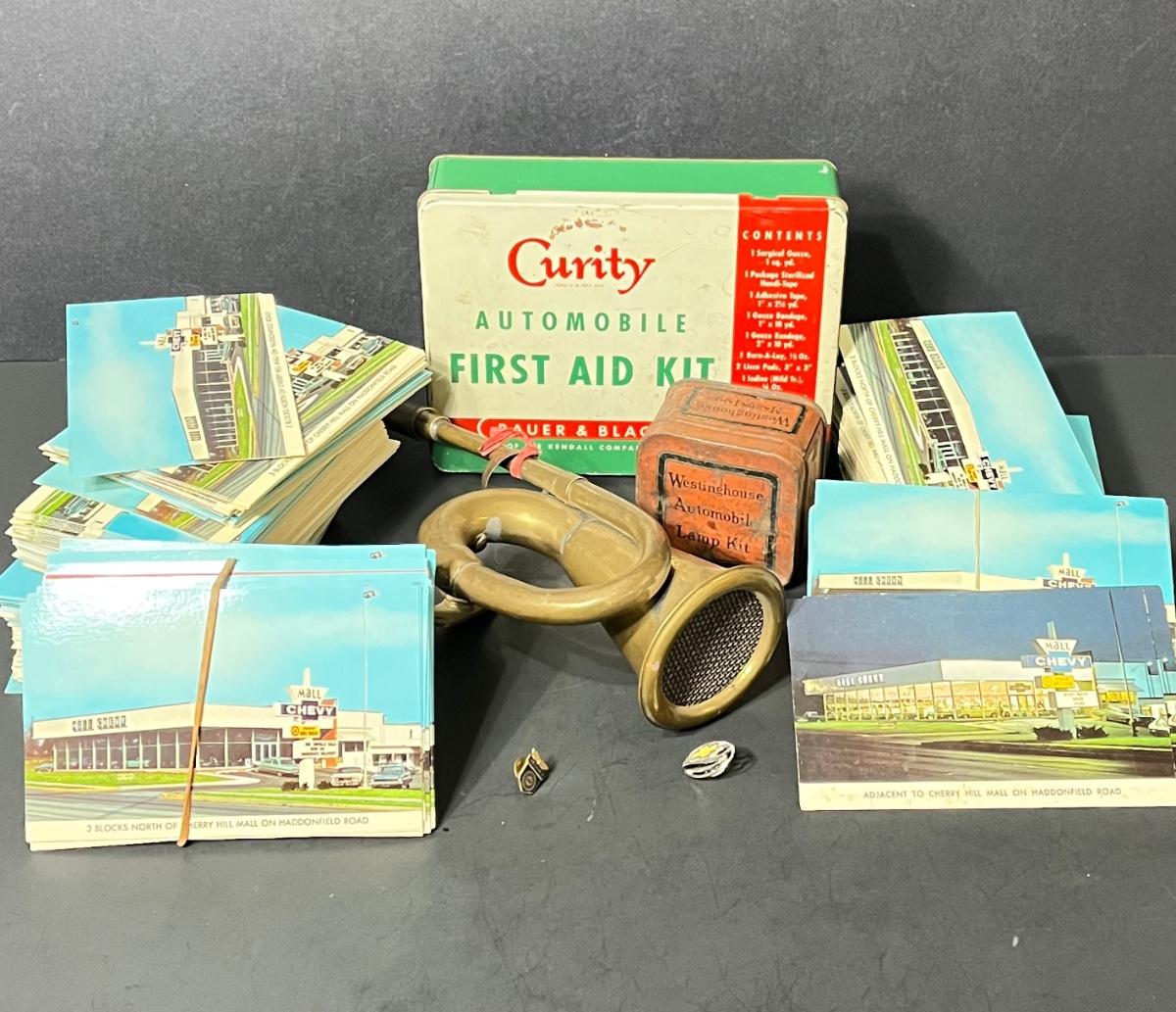 LOT 59: Vintage Automotive Items - Horn, First Aid Kit, Postcards & More