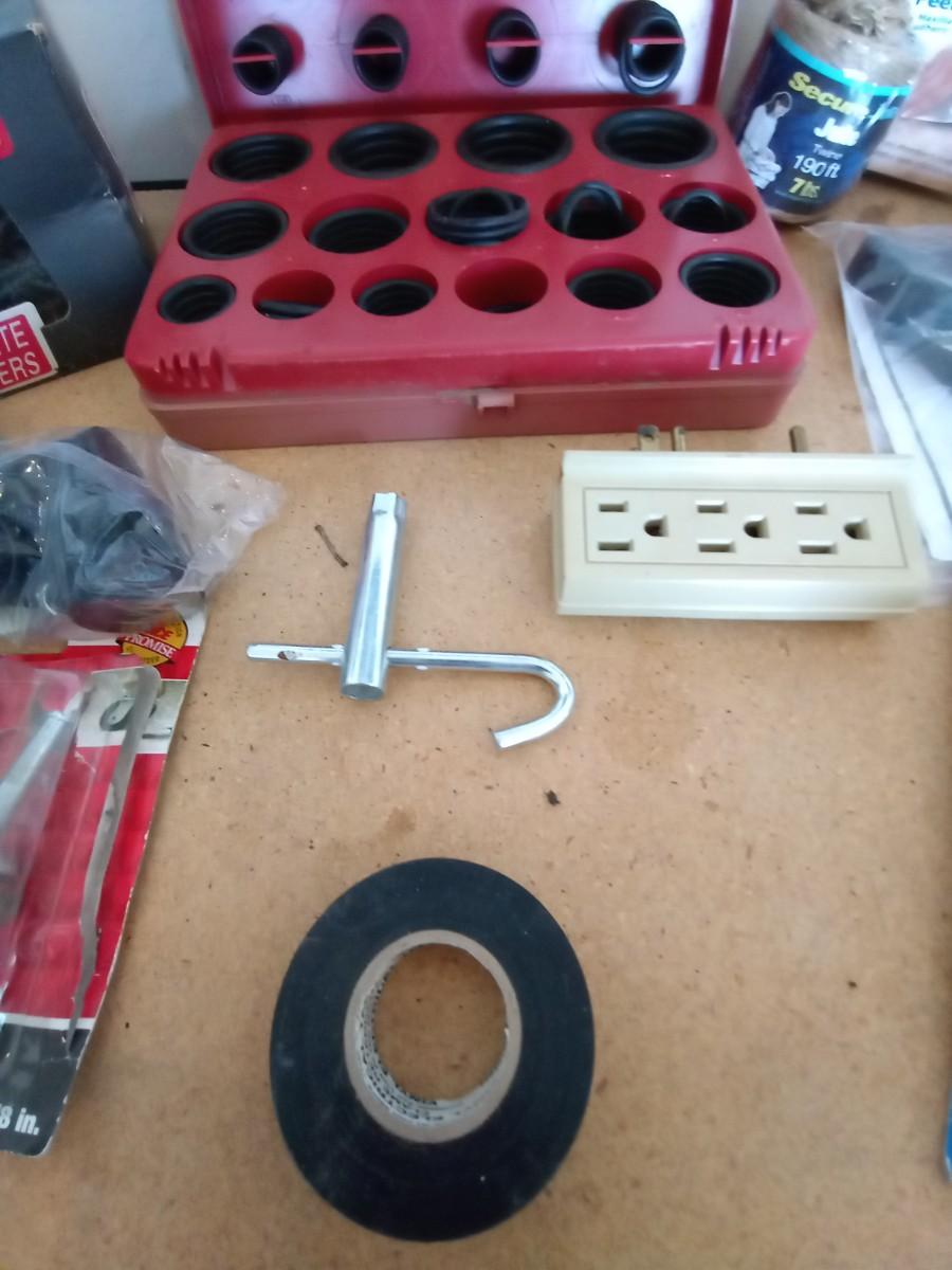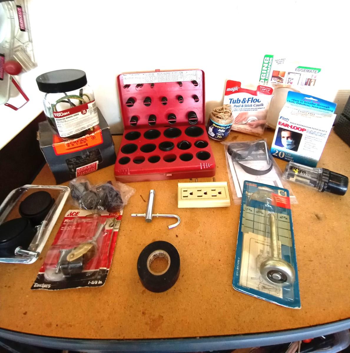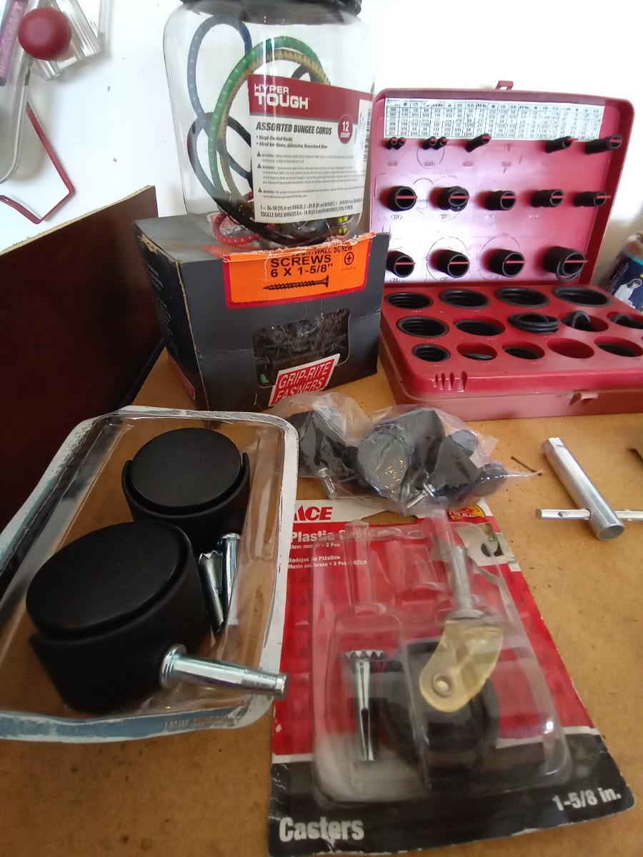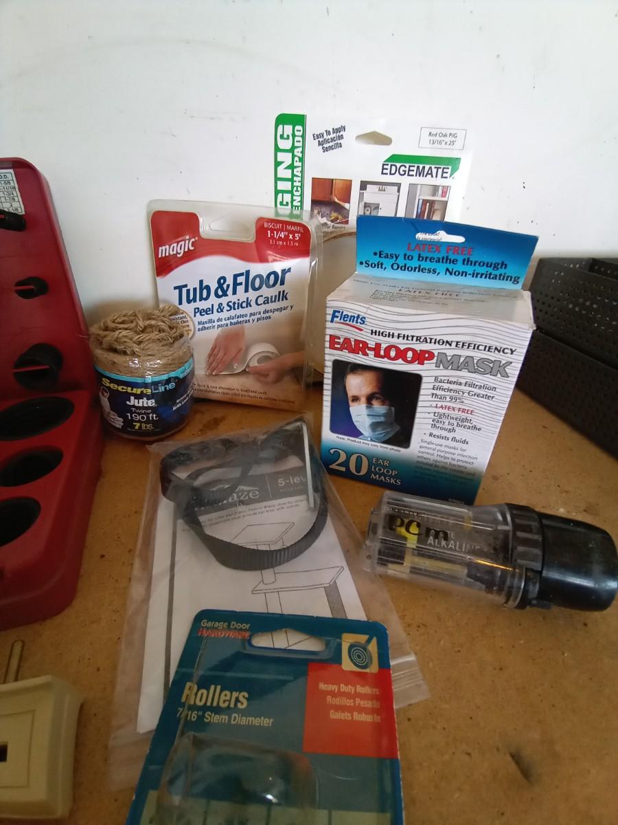 NEW TUB CAULK-ROLL OF JUTE-BOX OF MASKS-CASTORS-RUBBER SEALS AND MORE