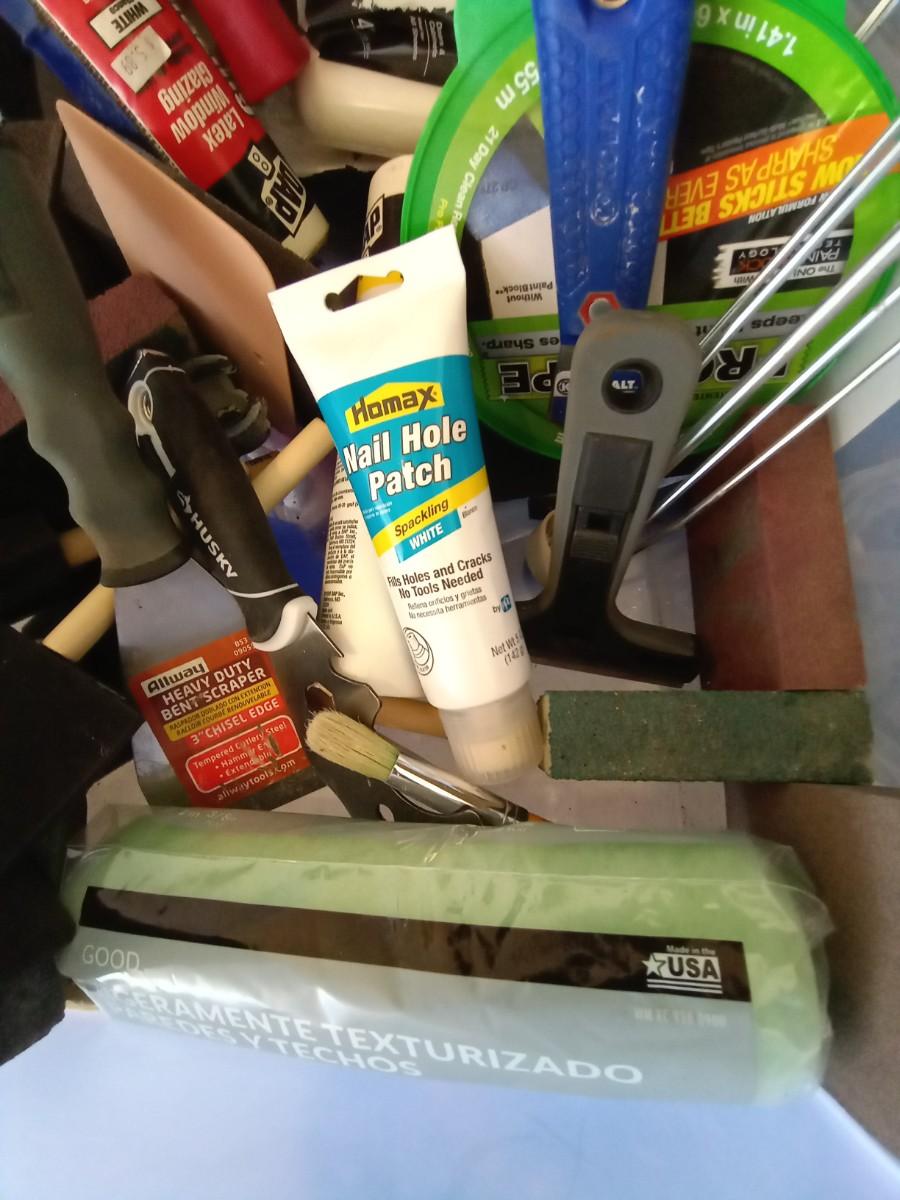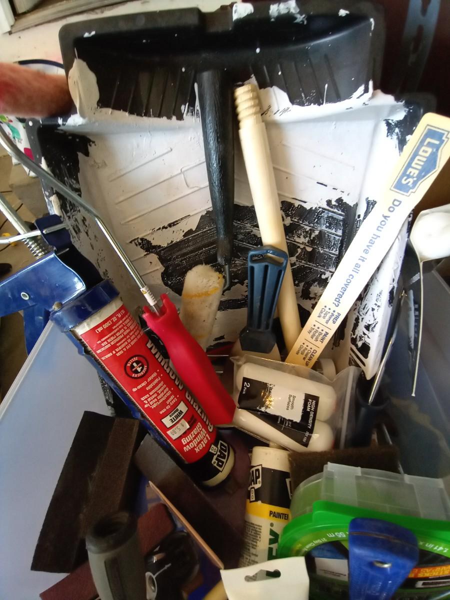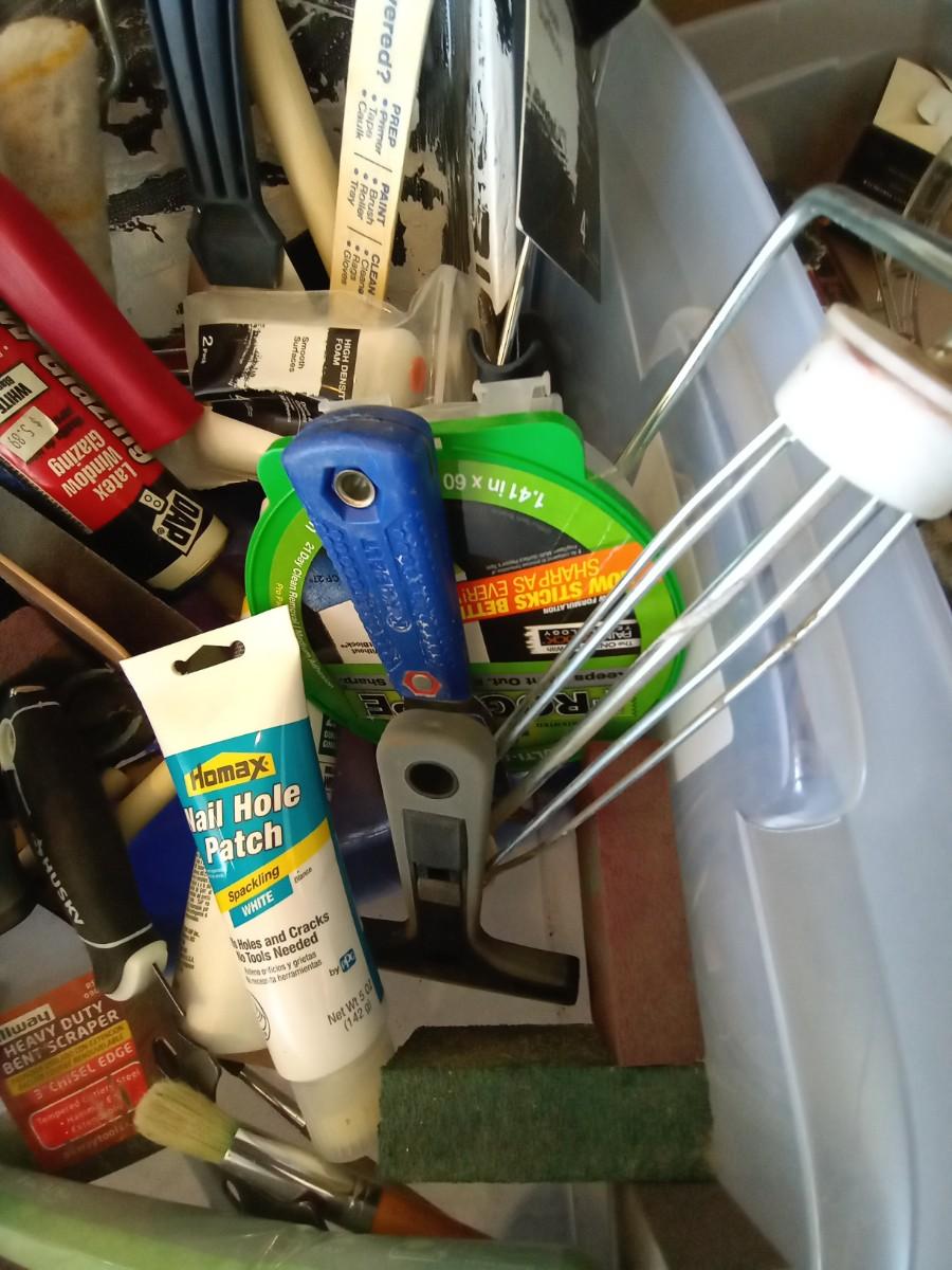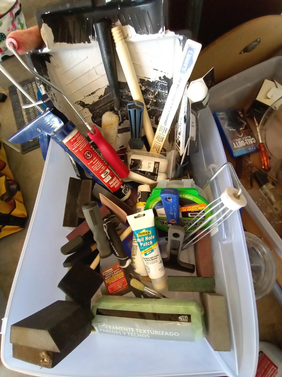 TUB OF PAINTING SUPPLIES-PAINTERS TAPE, CAULK GUN, CAULKING, ROLLERS, SCRAPERS, SPONG BRUSHES AND MORE